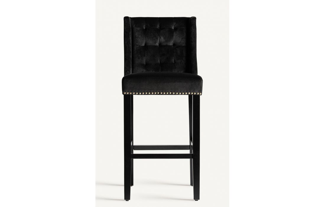Banco bar em madeira maciça de olmo, acabamento lacado preto, encosto em palhinha e assento em tecido.Dimensões em cmL 47 P 46 A 97Prazo de Entrega15 a 20 dias