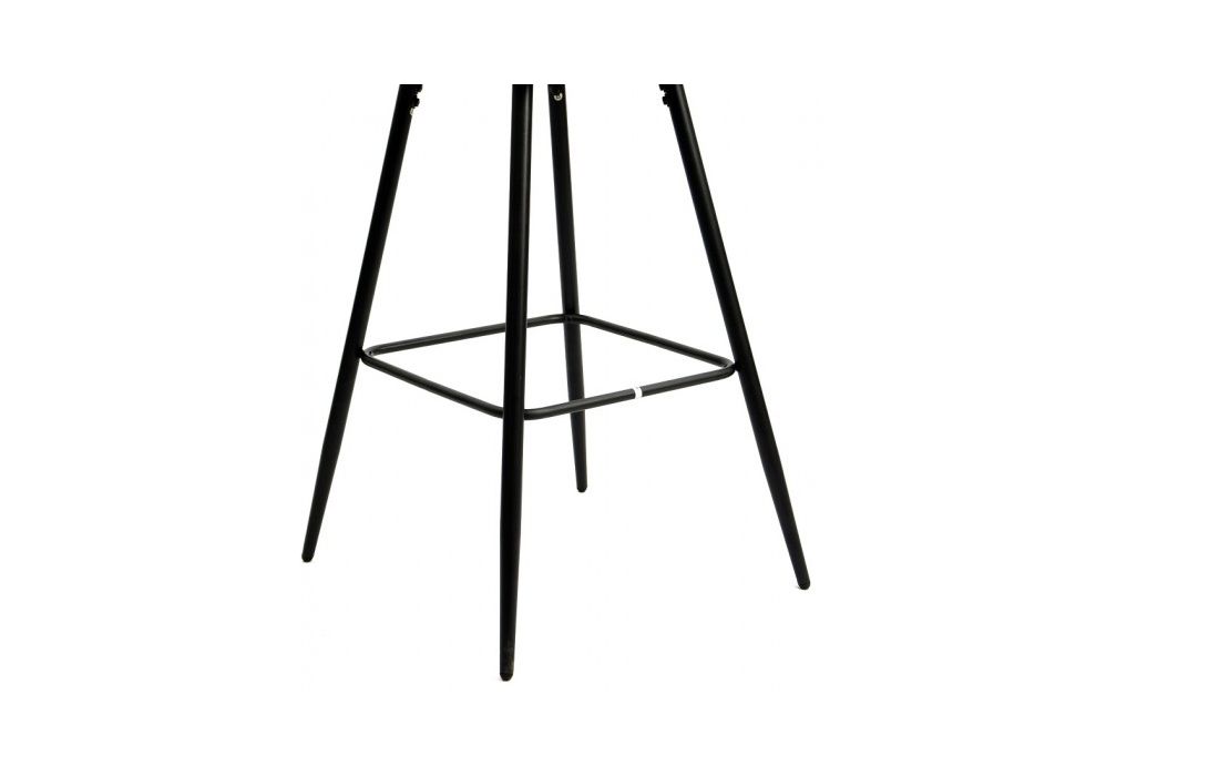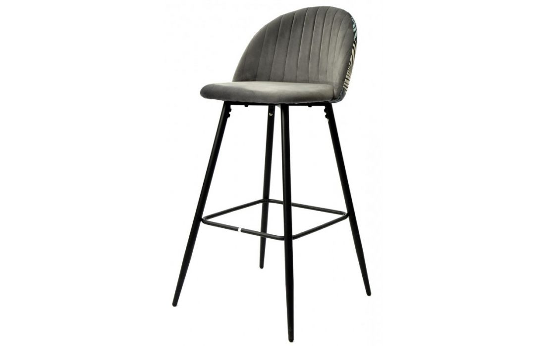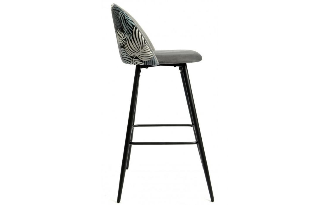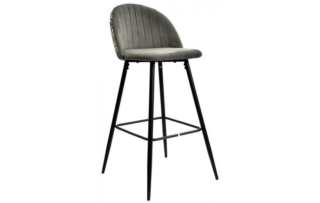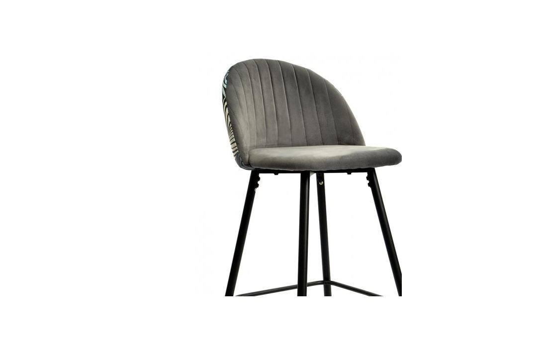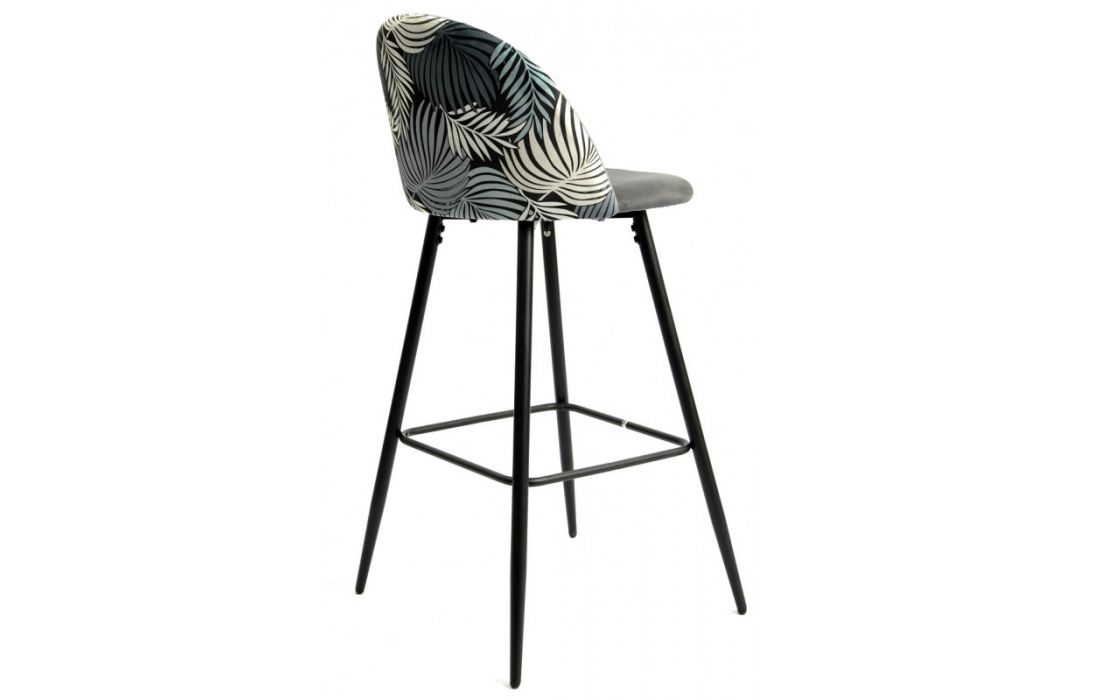 Banco bar em metal cor preta estofado em tecido aveludado cinza com costas florais combinando