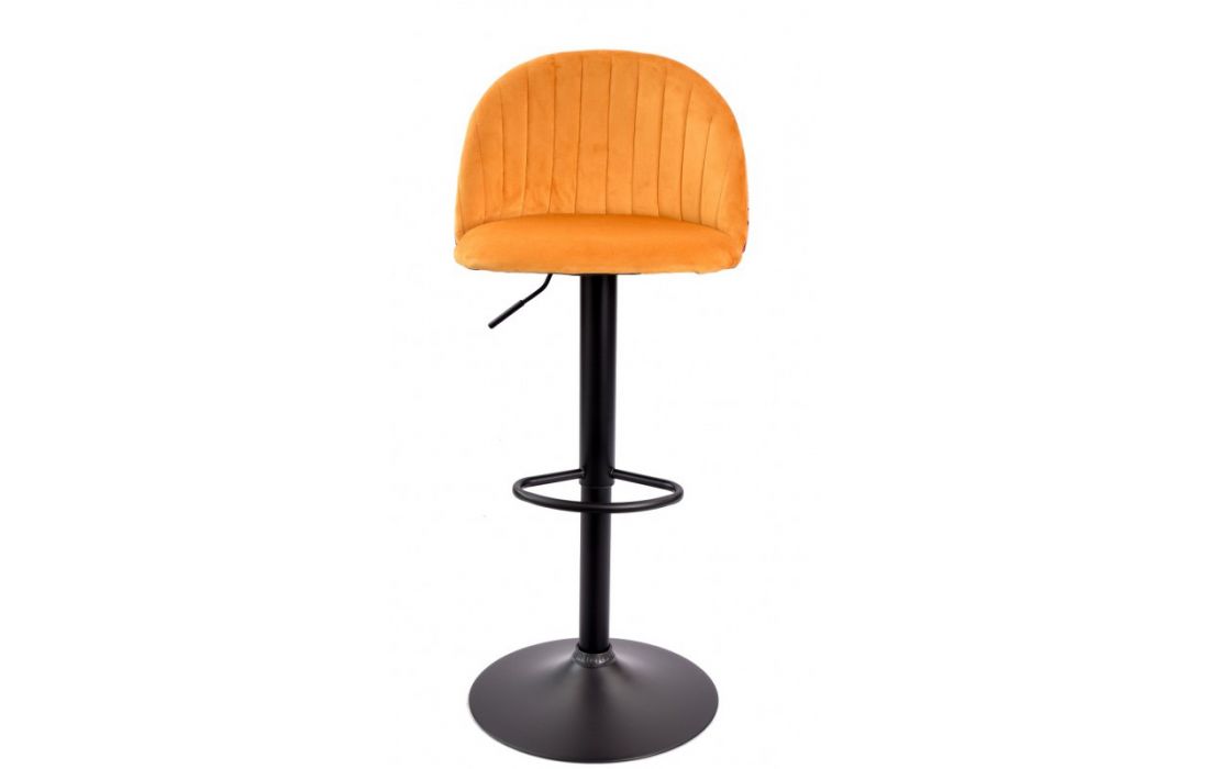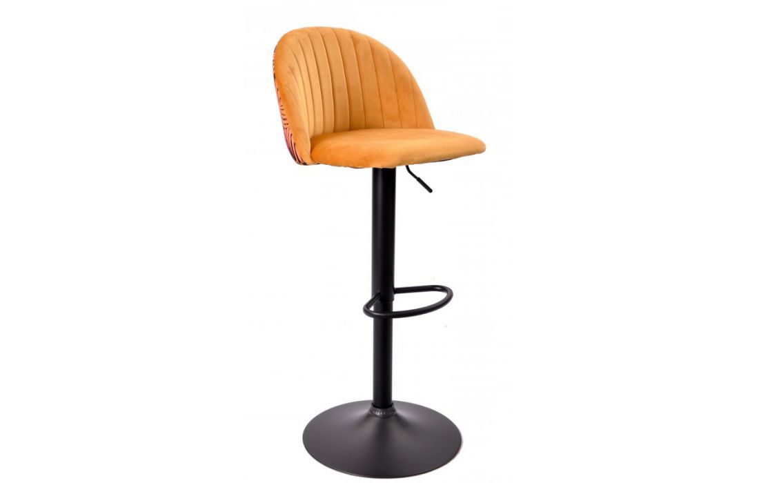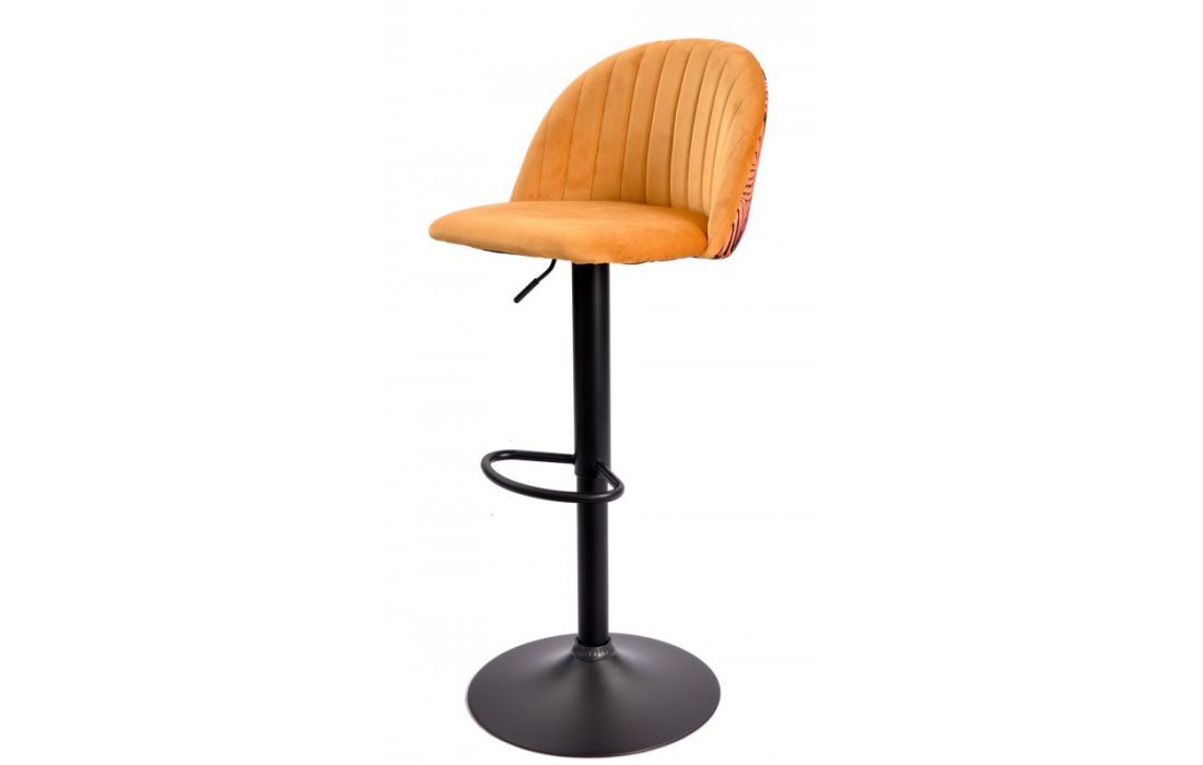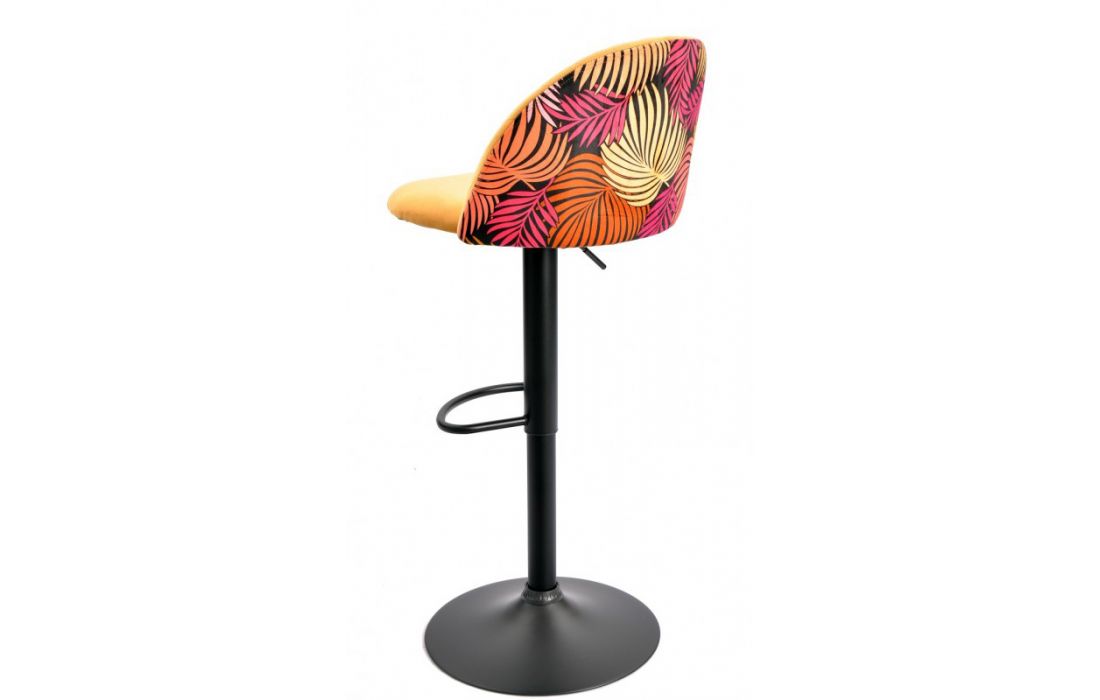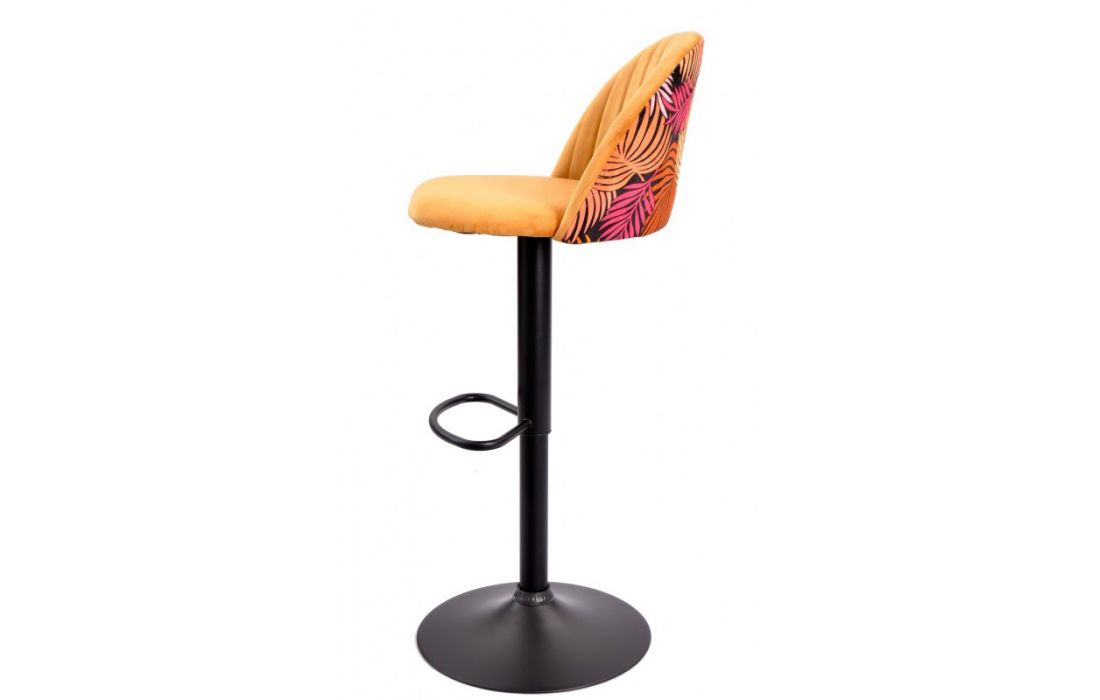 Banco bar com estrutura de metal, altura ajustável por pistão a gás cor preta estofado em tecido aveludado amarelo com costas florais combinando