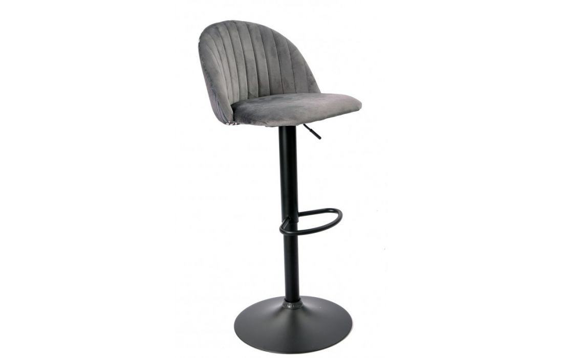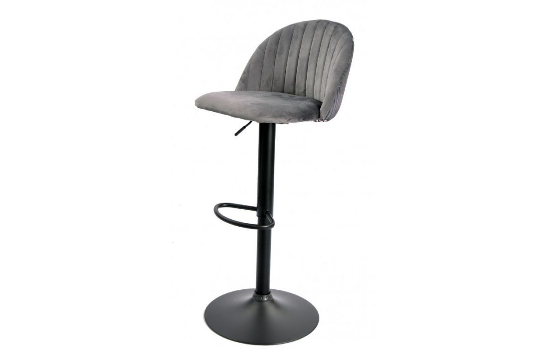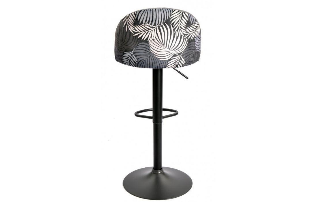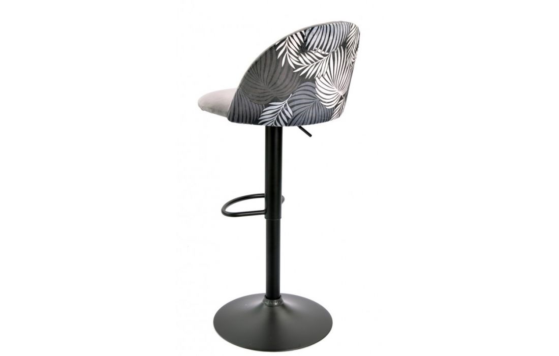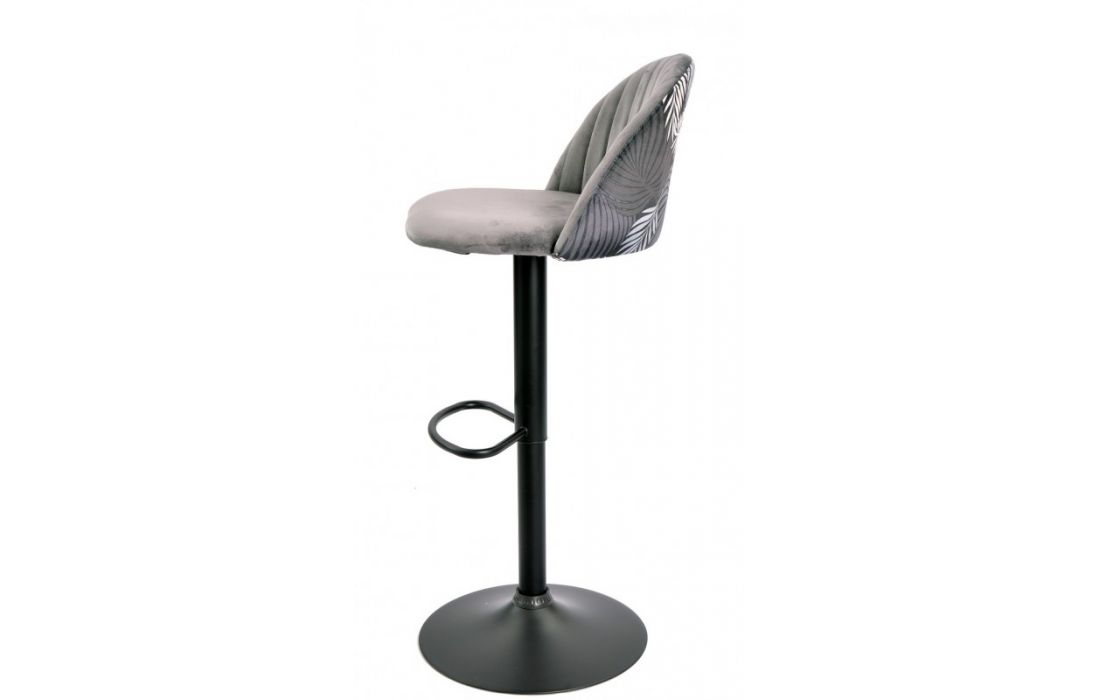 Banco bar com estrutura de metal, altura ajustável por pistão a gás cor preta estofado em tecido aveludado cinza com costas florais combinando