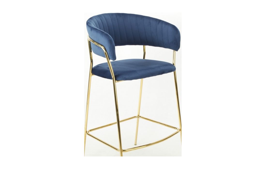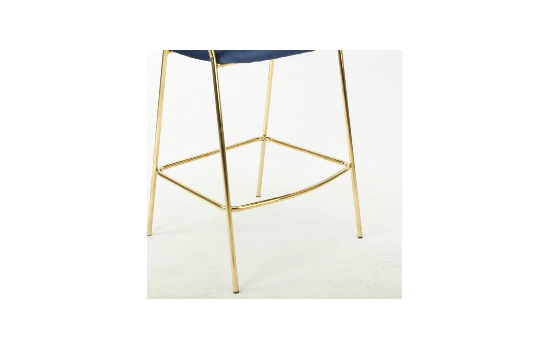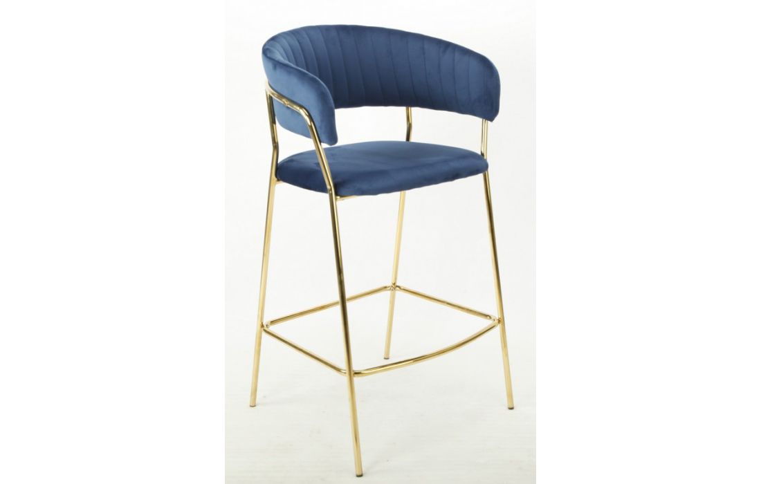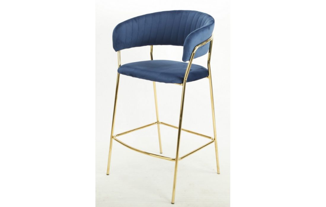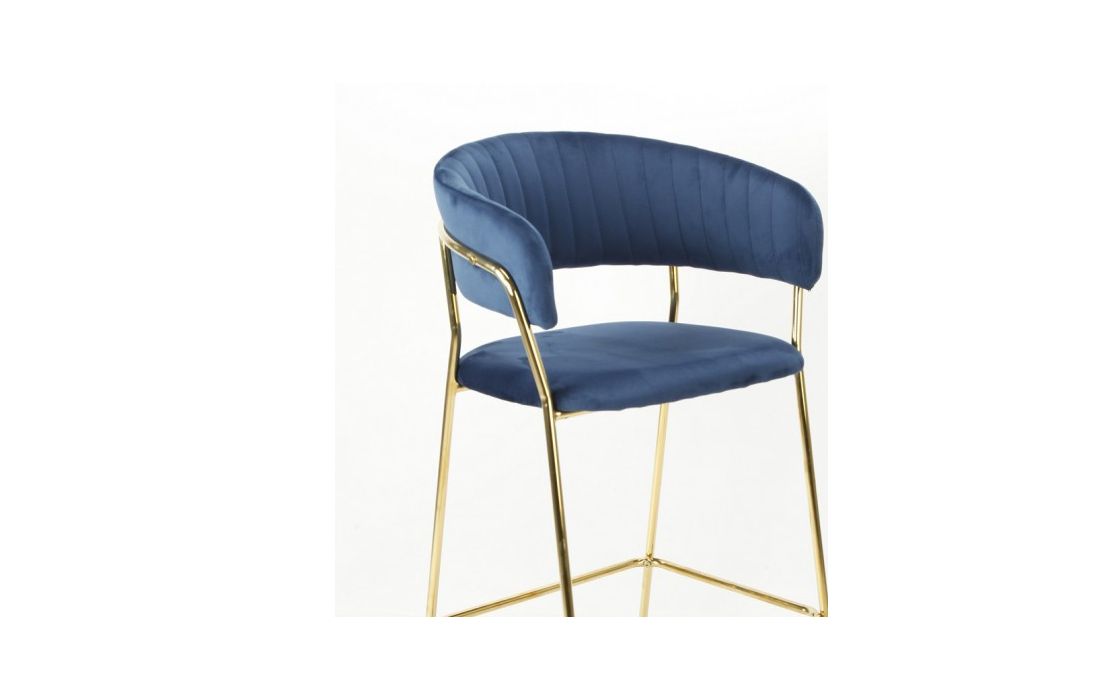 Banco bar com estrutura de metal dourado, estofado em tecido aveludado azul