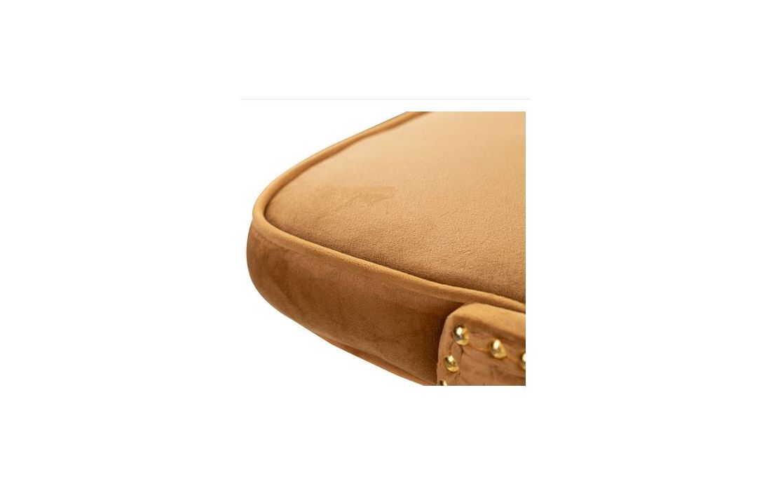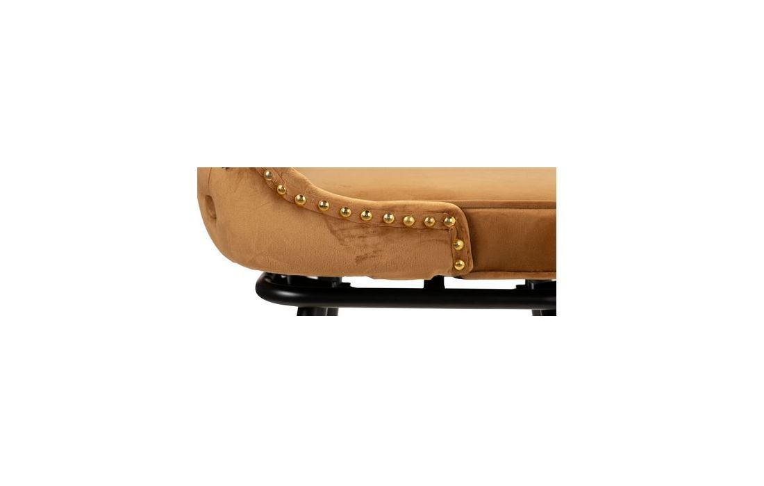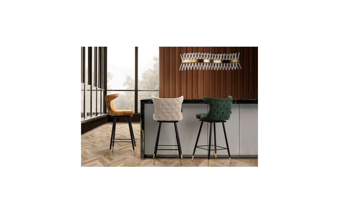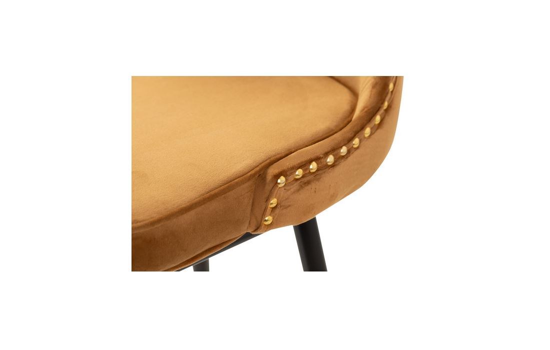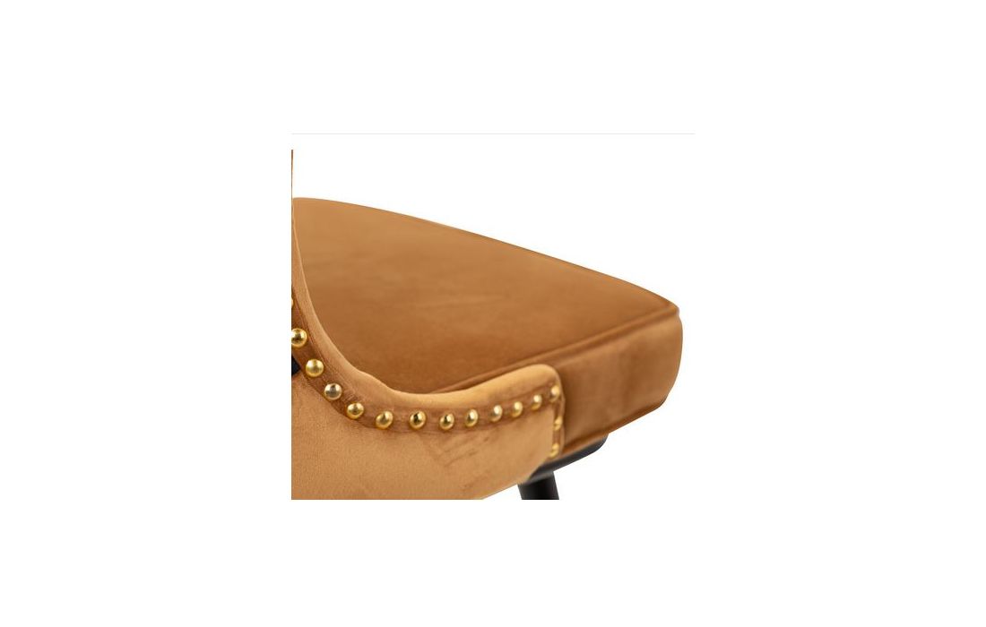 Banco bar estufado a tecido aveludado de cor mostarda com os pés em metal pretos com detalhes douradosDestinatário :