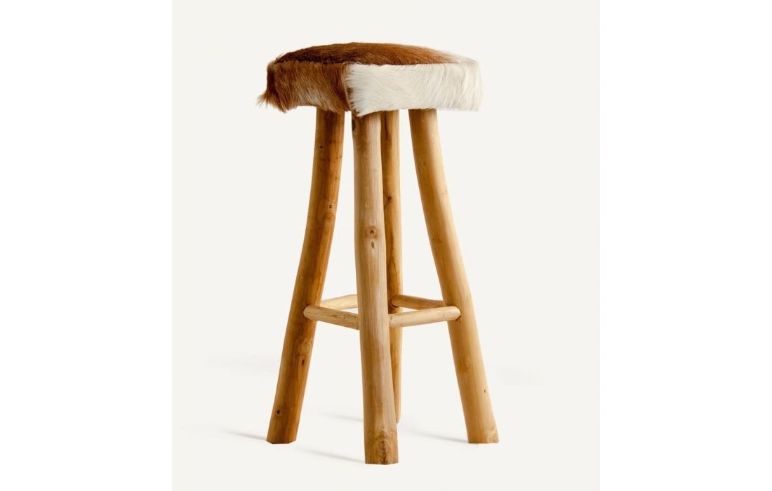 Banco bar estilo nórdico feito em madeira de pinho reciclada e couro nas cores castanho e branco