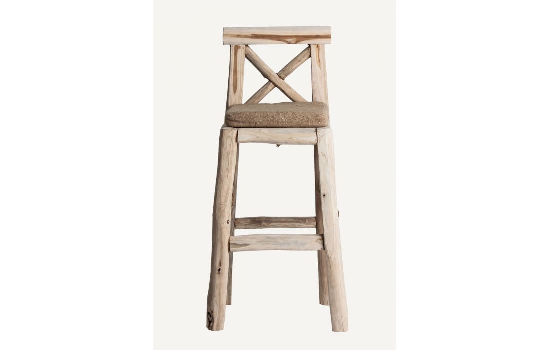 Banco bar estilo étnico feito em madeira tropical e tecido na cor castanha