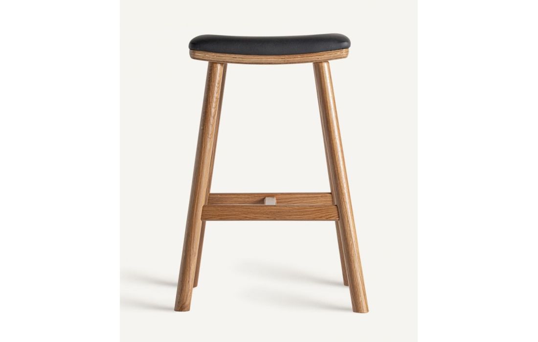 Banco bar estilo vintage feito em madeira de carvalho e couro falso nas cores preto e castanho