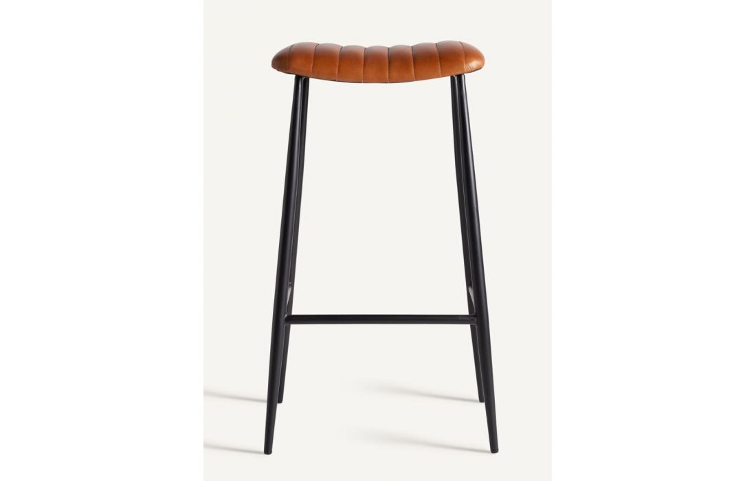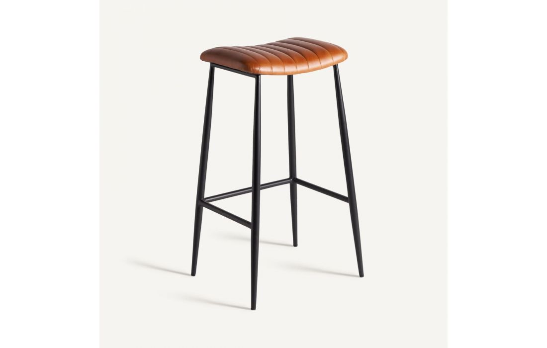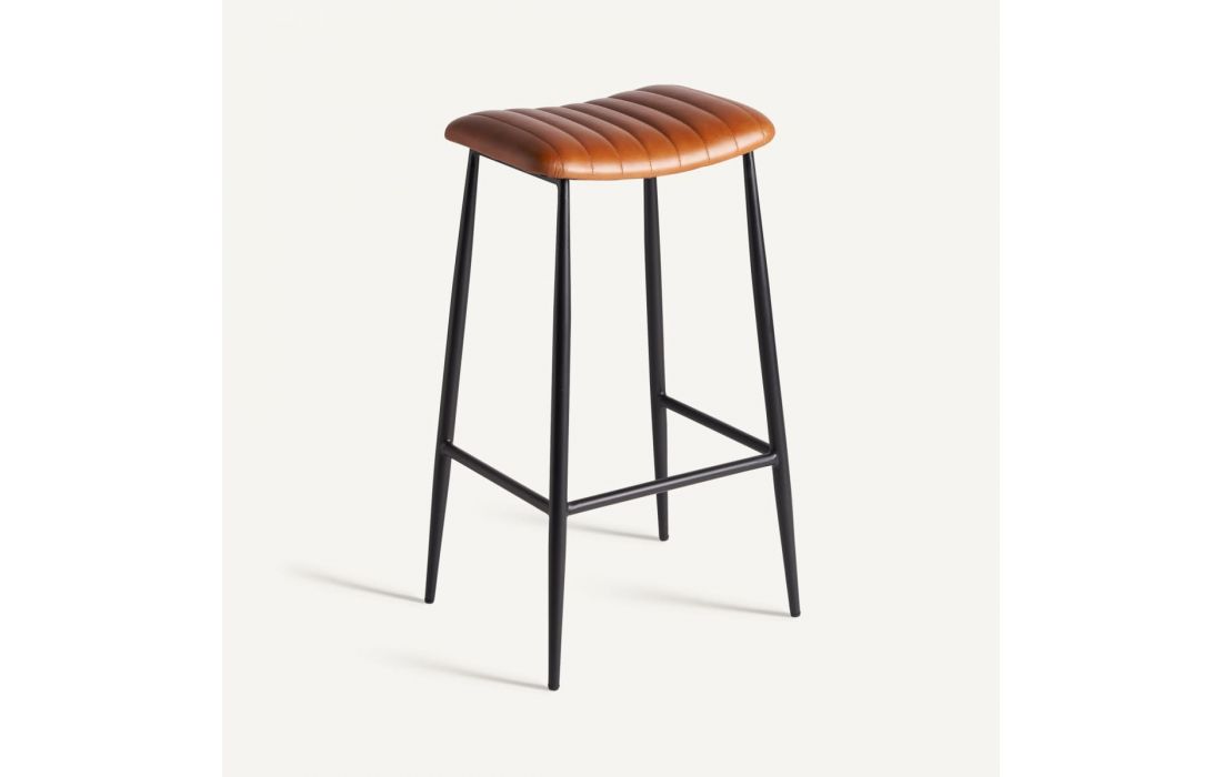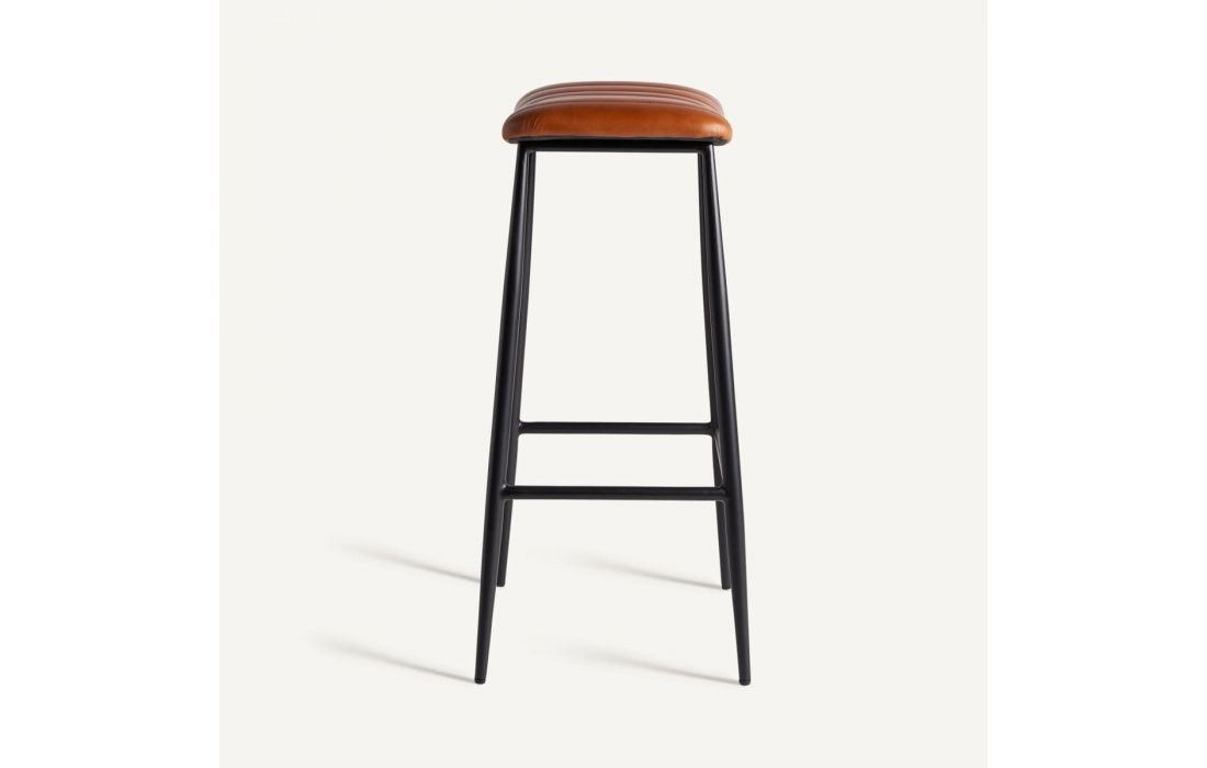 Banco bar estilo vintage feito em ferro e couro nas cores preto e castanho