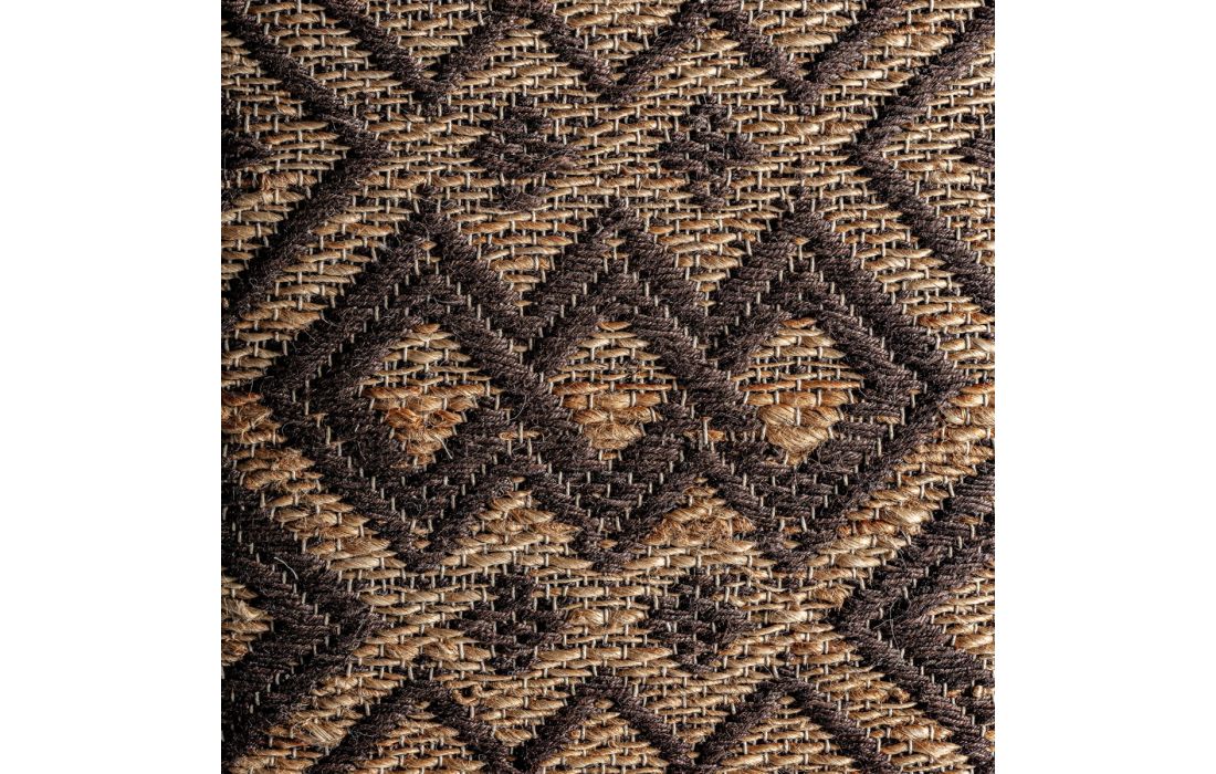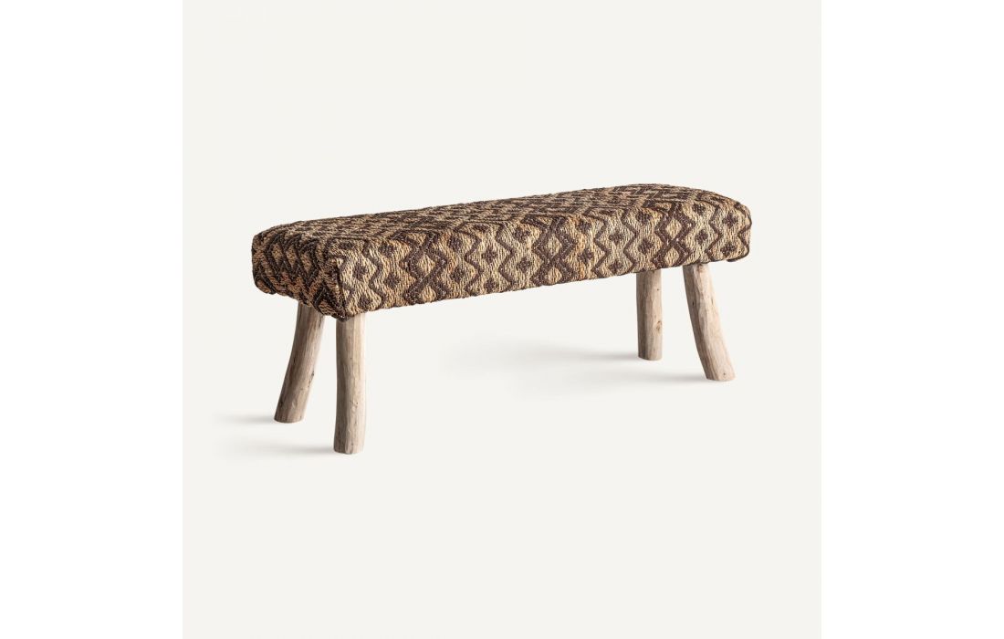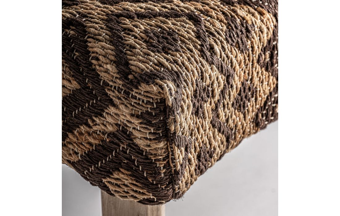 Banco estilo boho feito em madeira e juta nos tons de castanho
