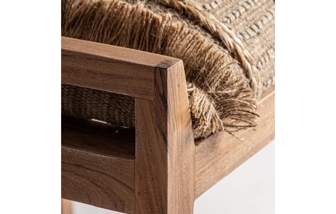 Banco estilo boho feito em madeira, algodão e juta em tons clarosDestinatário :