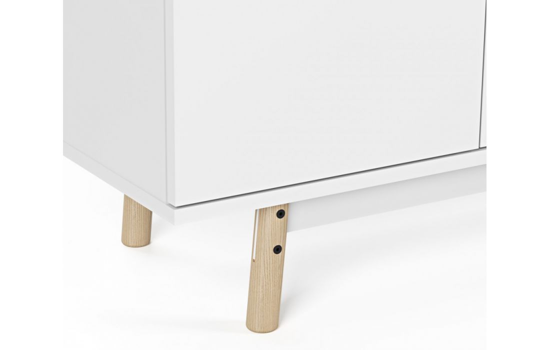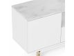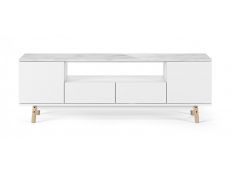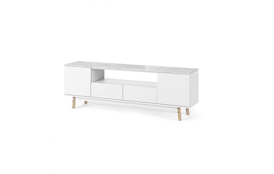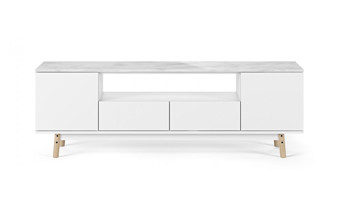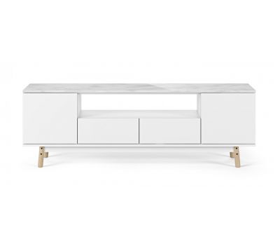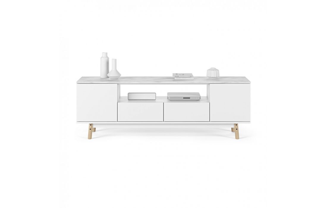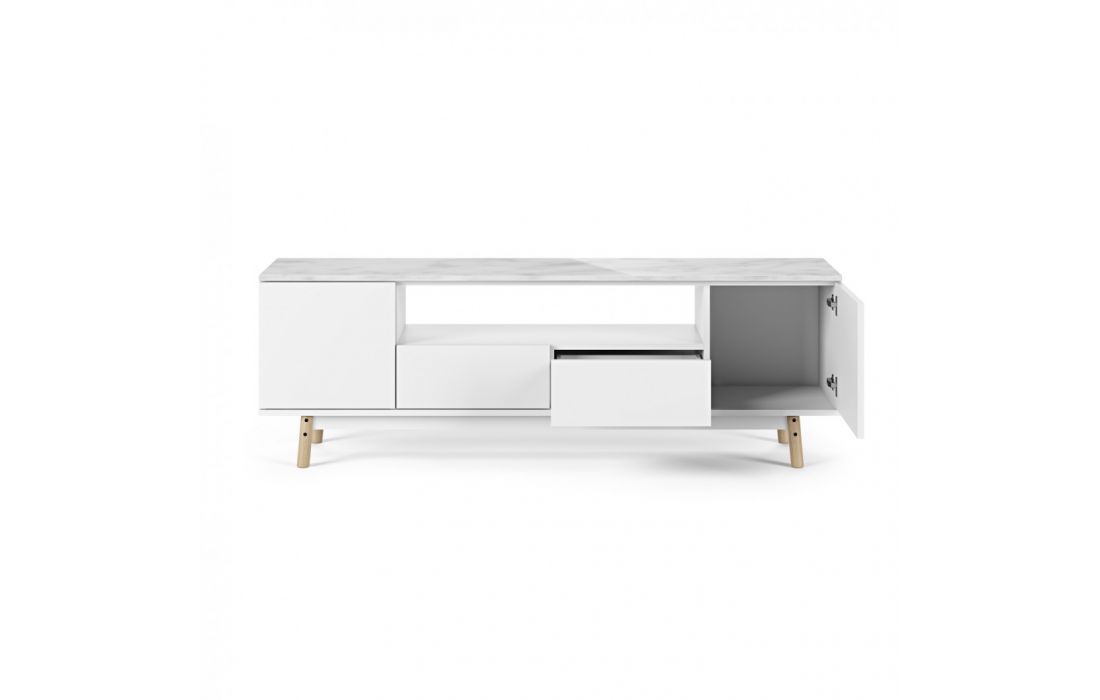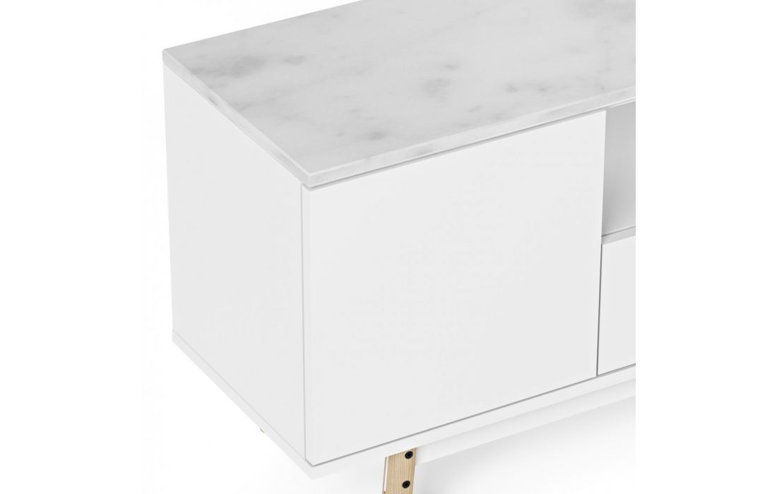 Base TV com 2 gavetas e 2 portas apresenta um design nórdico de estilo minimalista. A sua principal característica é o distinto tampo em mármore Carrara branco com os pés em carvalho maciço.