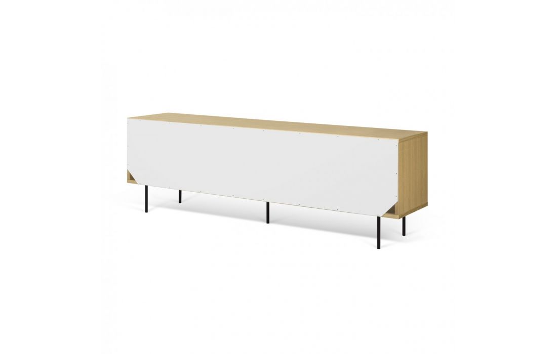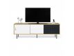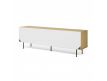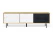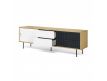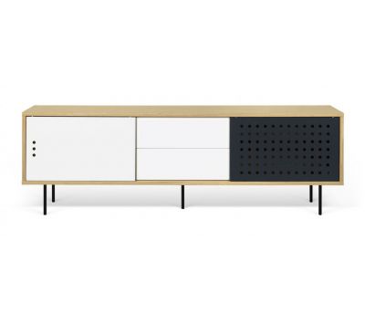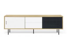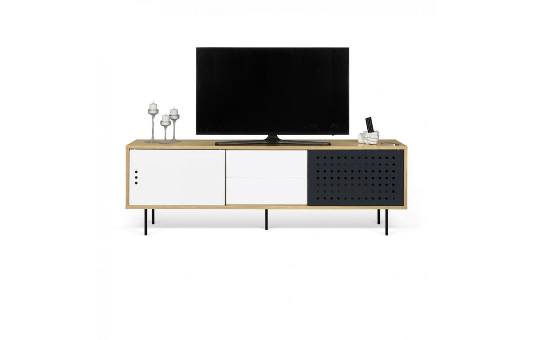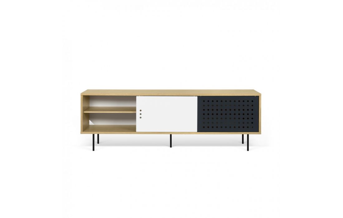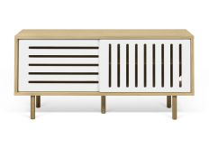 Base TV com 2 portas de correr, ambas em branco ou numa combinação de cinza e branco, e duas gavetas centrais.