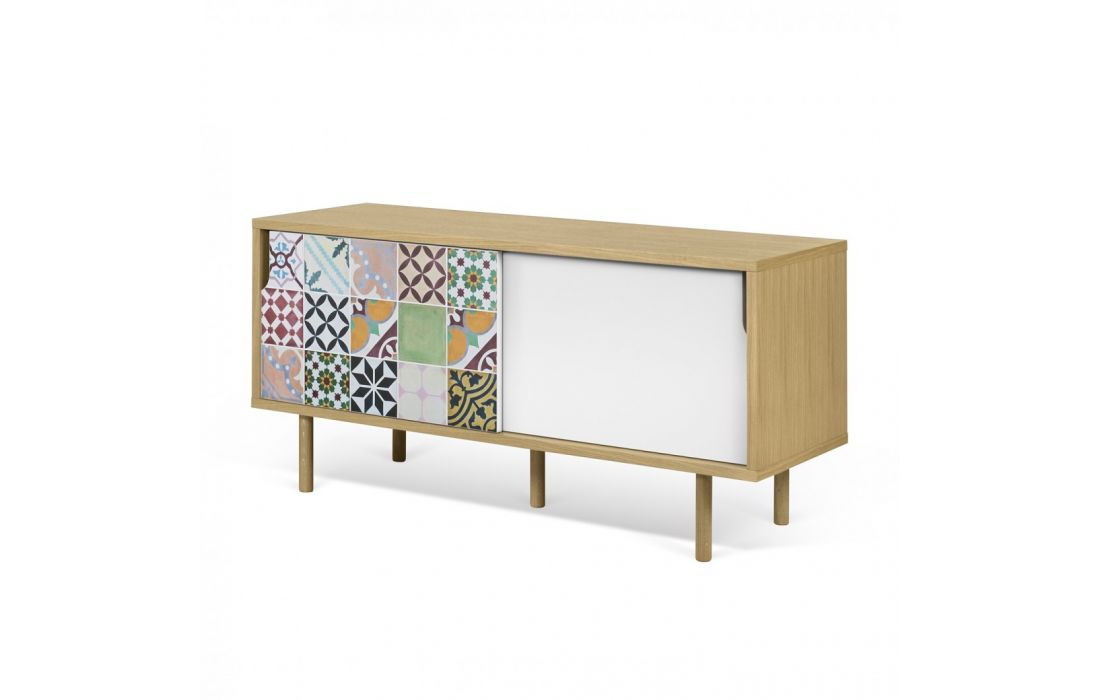 Base tv com detalhes diferenciadores, como o padrão geométrico nas portas.
