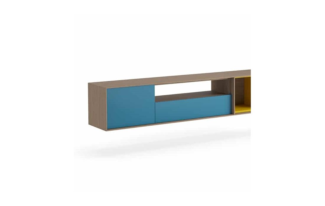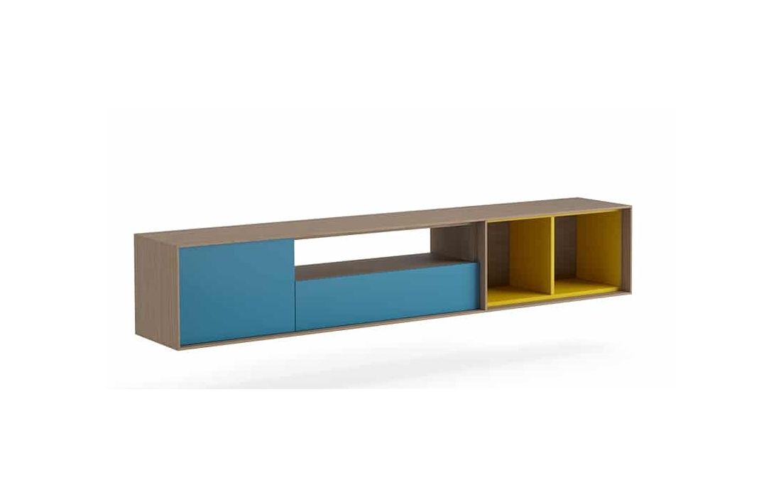 Base TV suspensa com uma porta, uma gaveta e um nicho. À direita, dois nichos organizer/expositores.