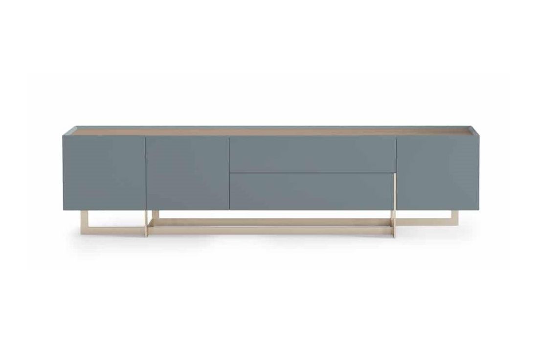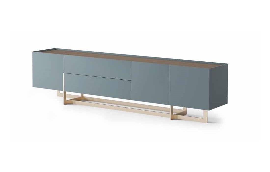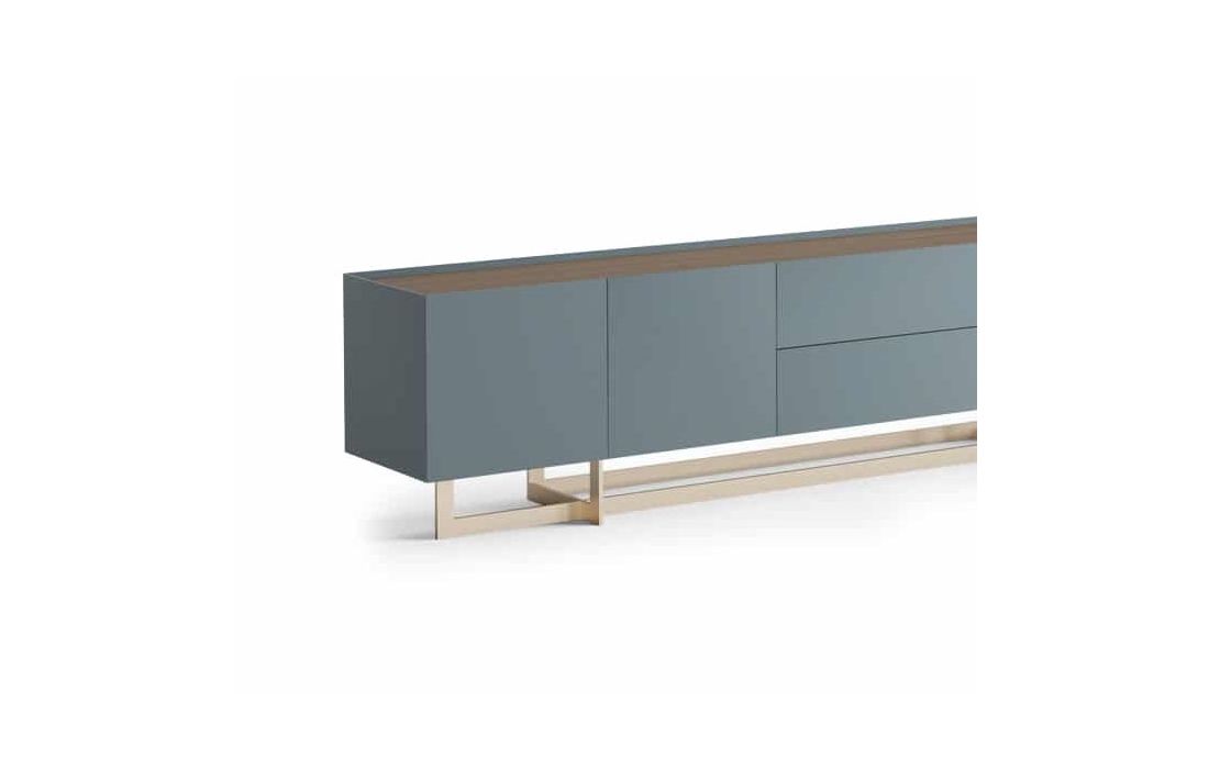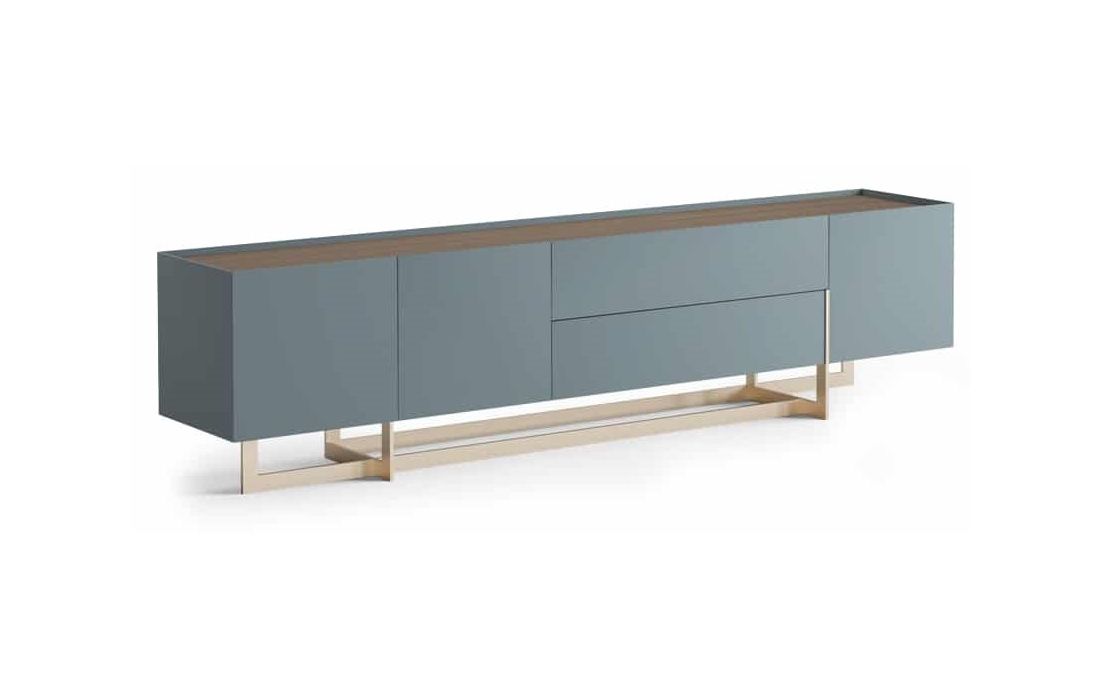 Base TV com três portas, uma frente de cair e uma gaveta. Estrutura lacada mate com pé em inox ouro mate e tampo em nogueira.