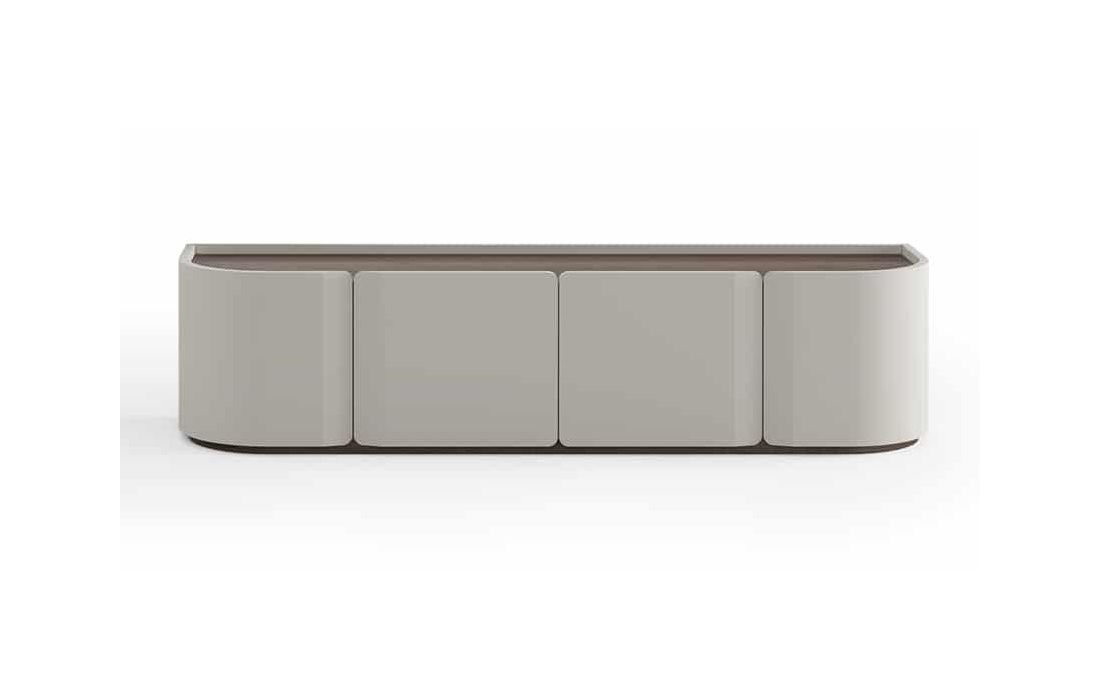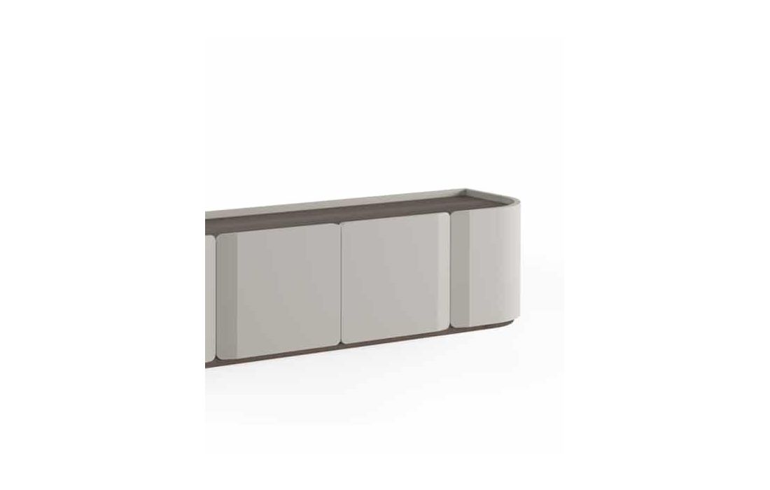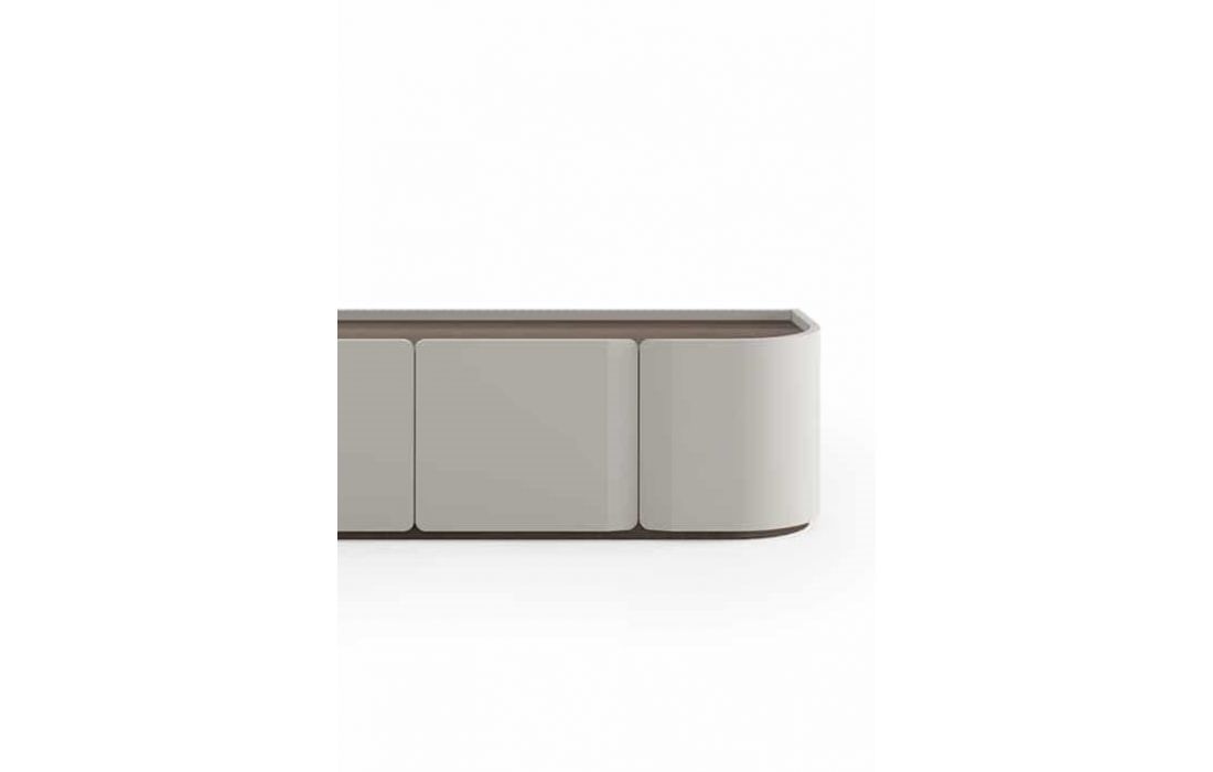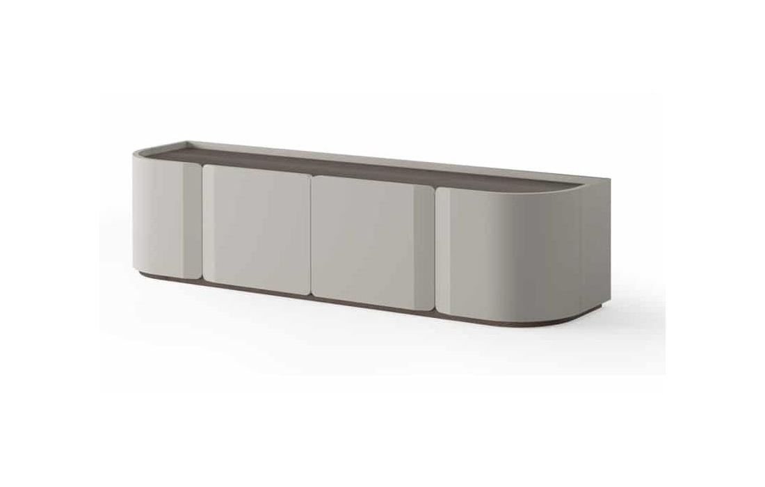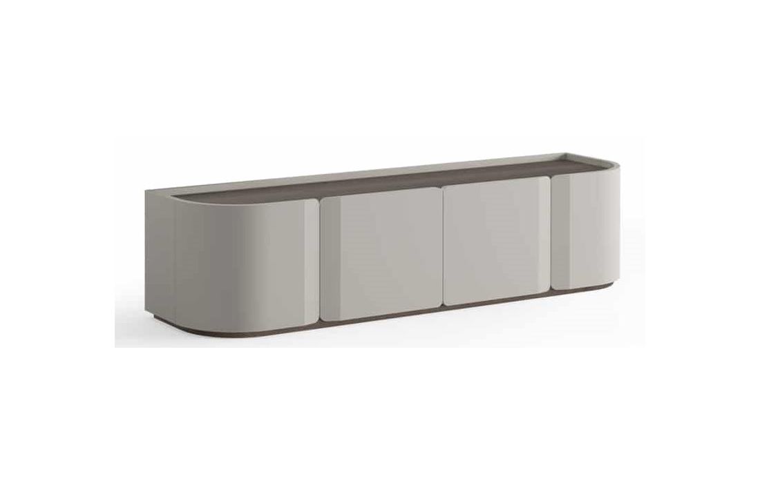 Base TV com portas curvas e planas, todas lacadas mate com tampo em eucalipto fumado.