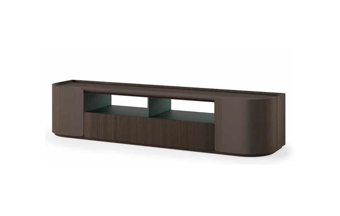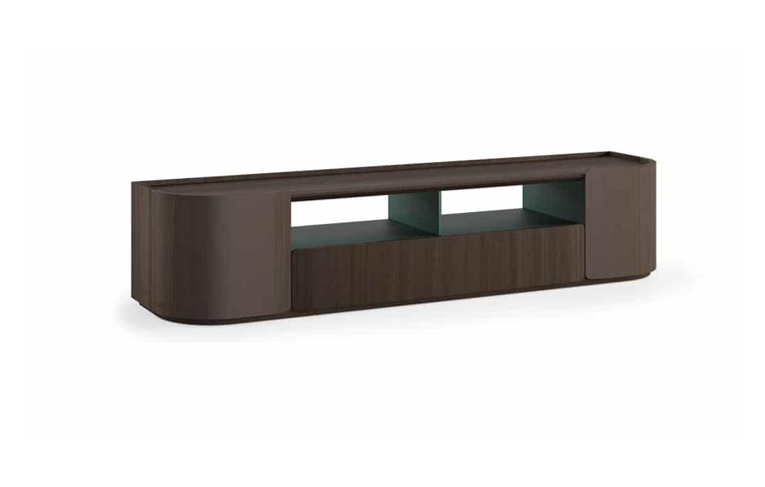 Base TV com duas portas curvas, dois nichos e uma gaveta, folheada a eucalipto fumado.