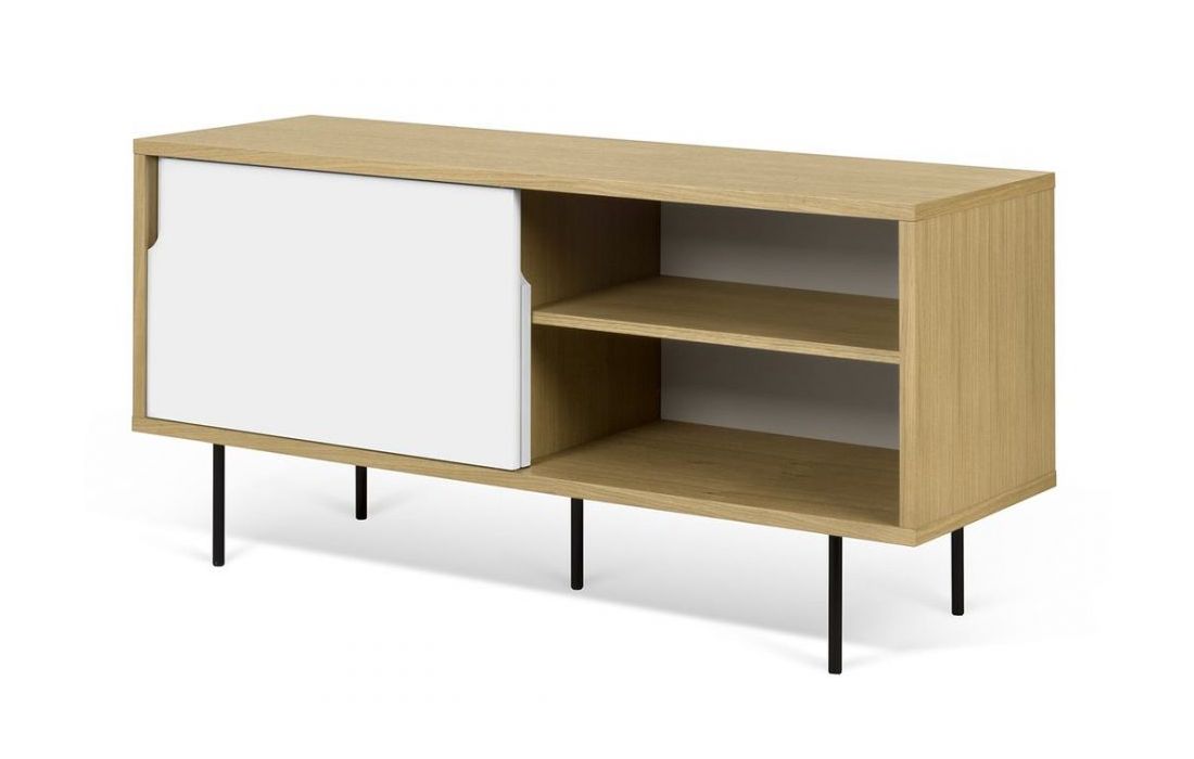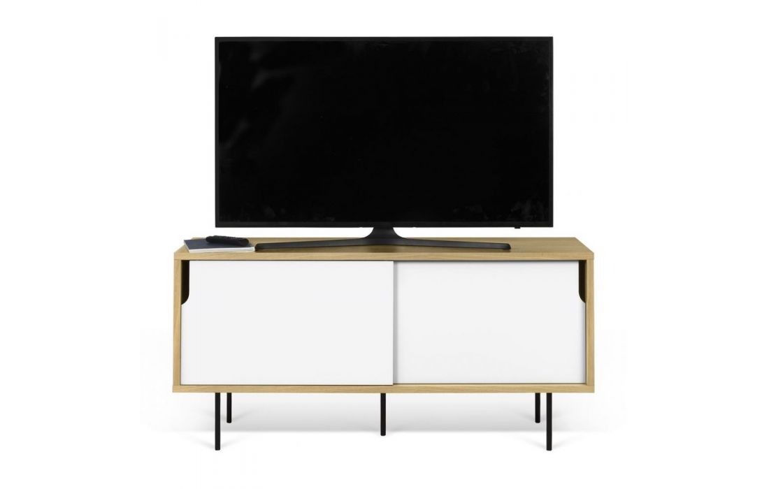 Base tv de 2 porta de correr com estrutura folheada a carvalho, pés em metal e frentes lacado branco.