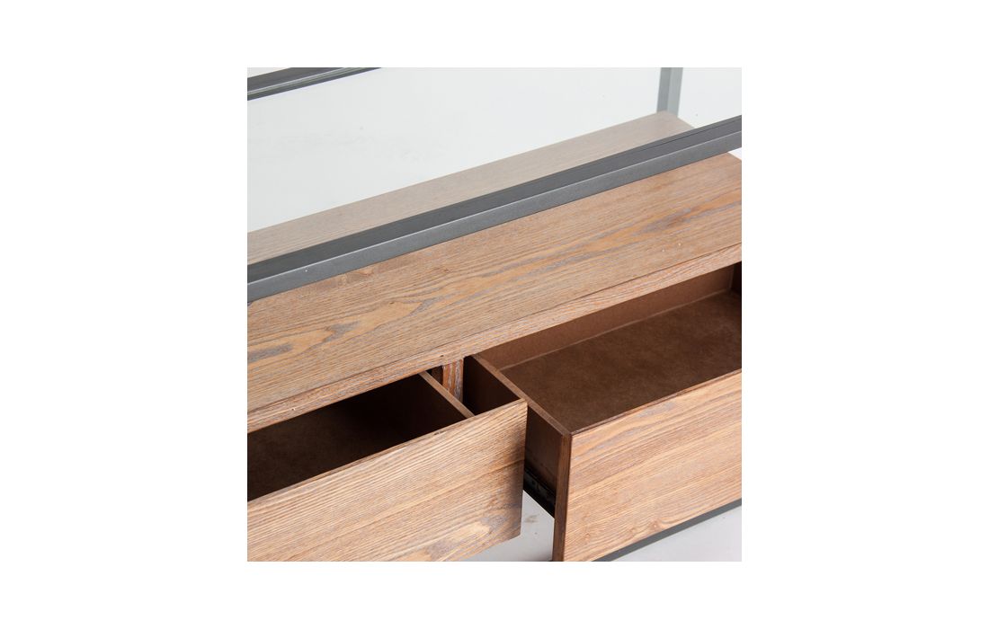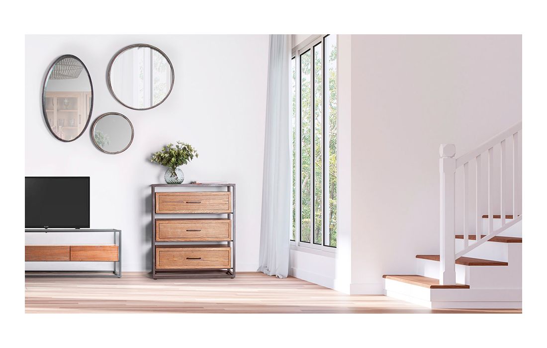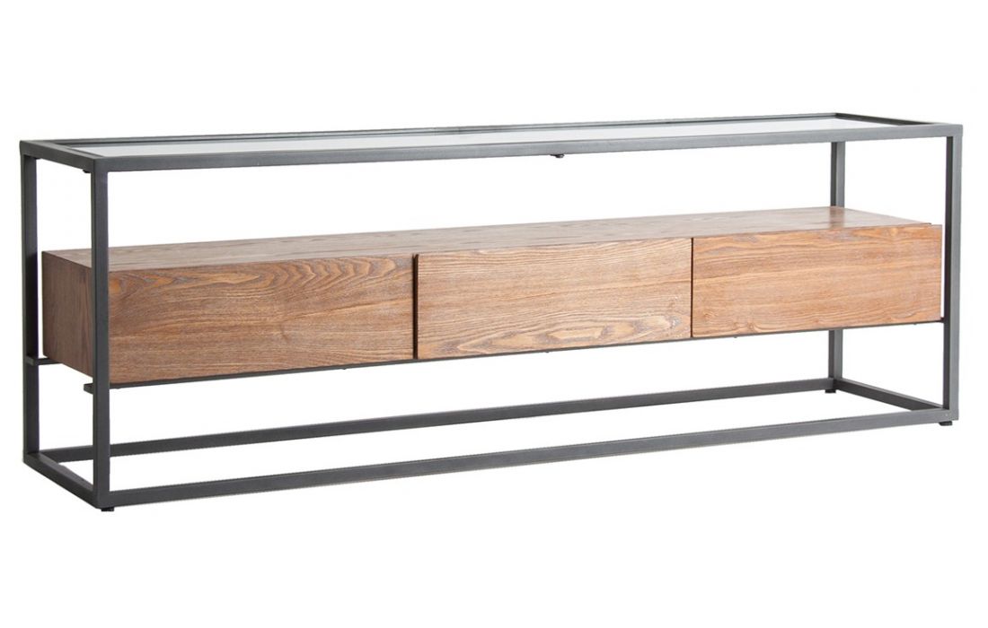 Base TV com 3 gavetas, em ferro e madeira cor natural