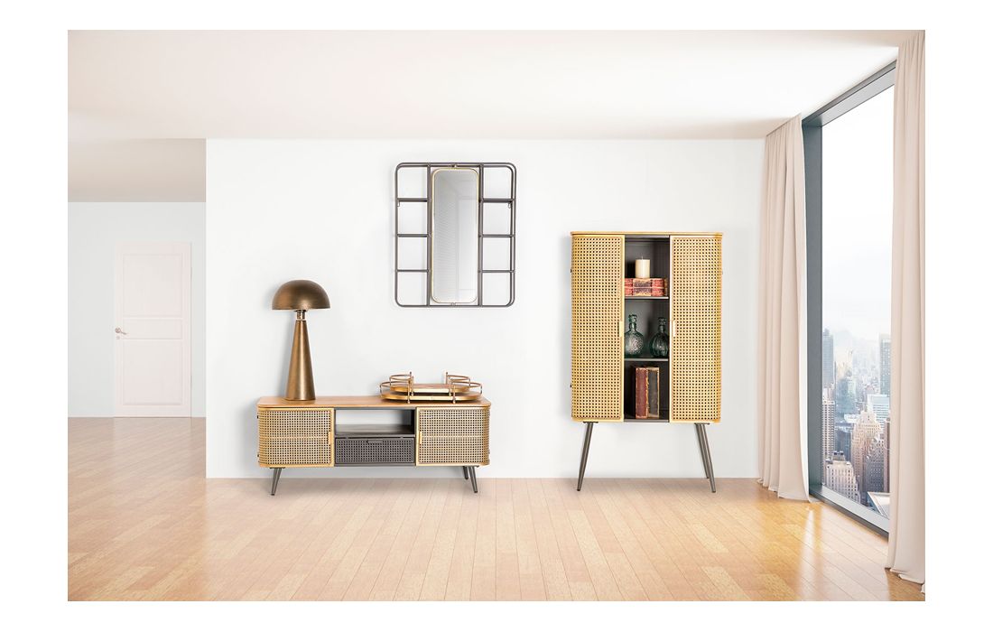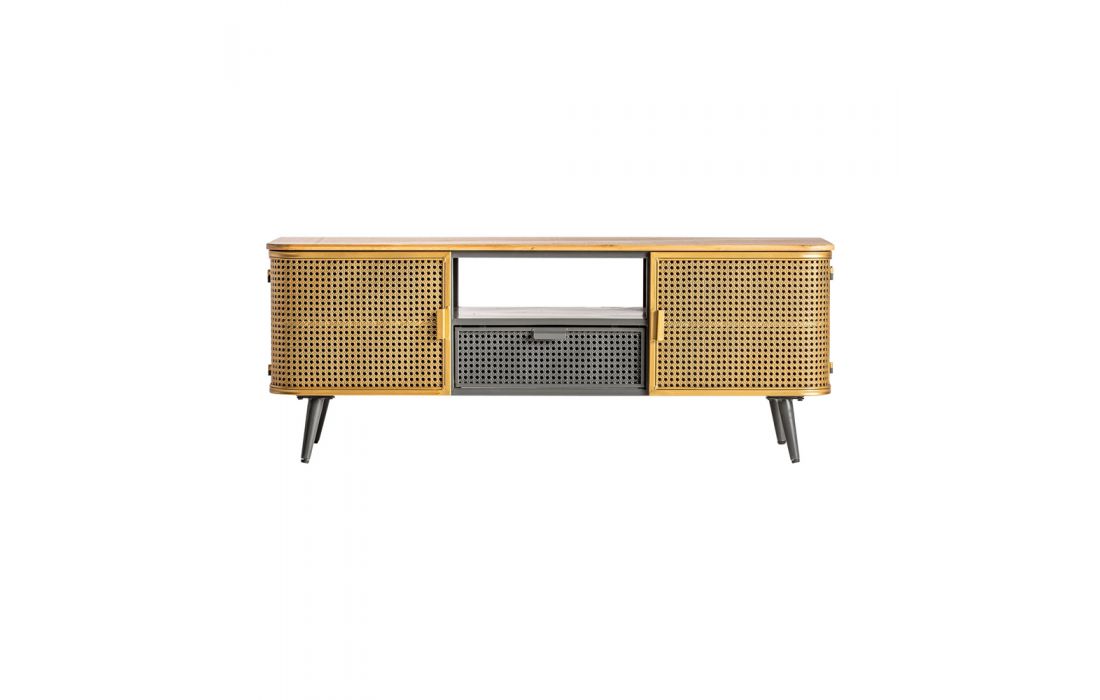 Base TV com 2 portas e 1 gaveta em ferro e bambu, cor cinza e ouro