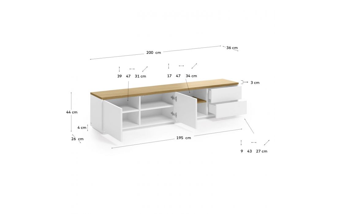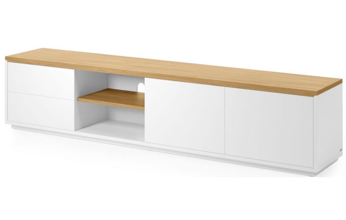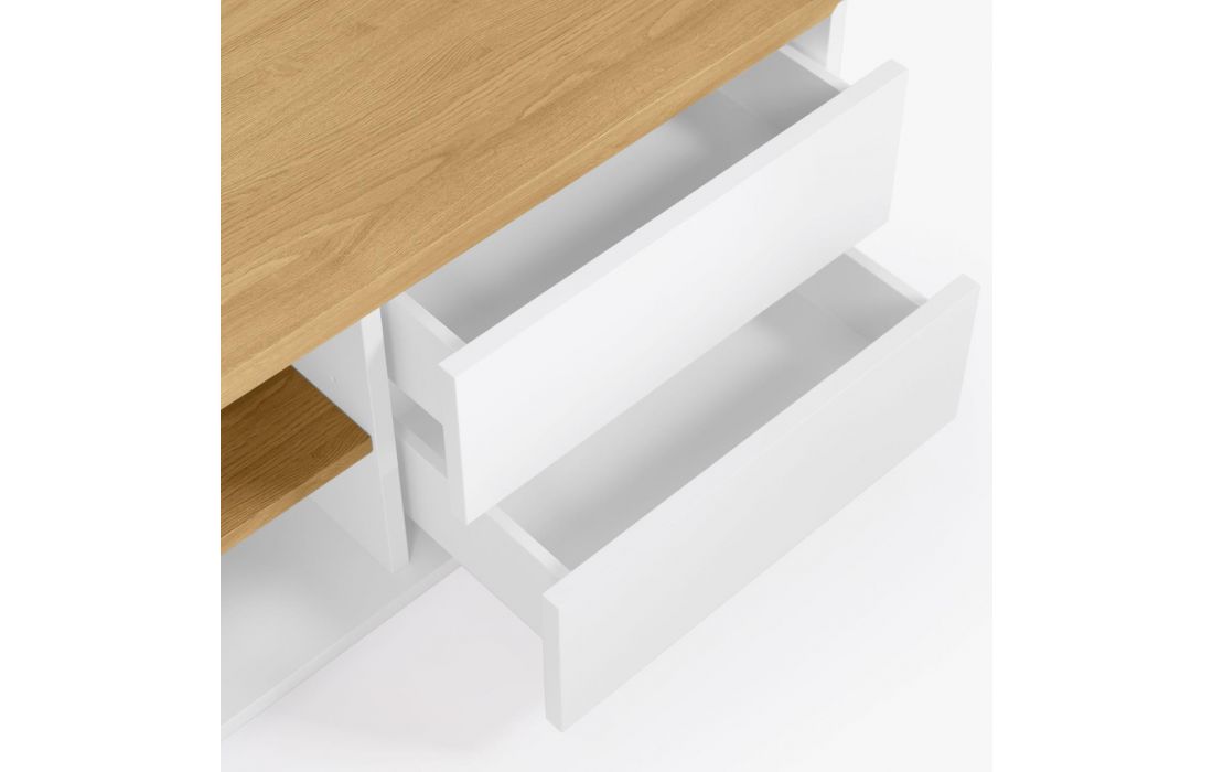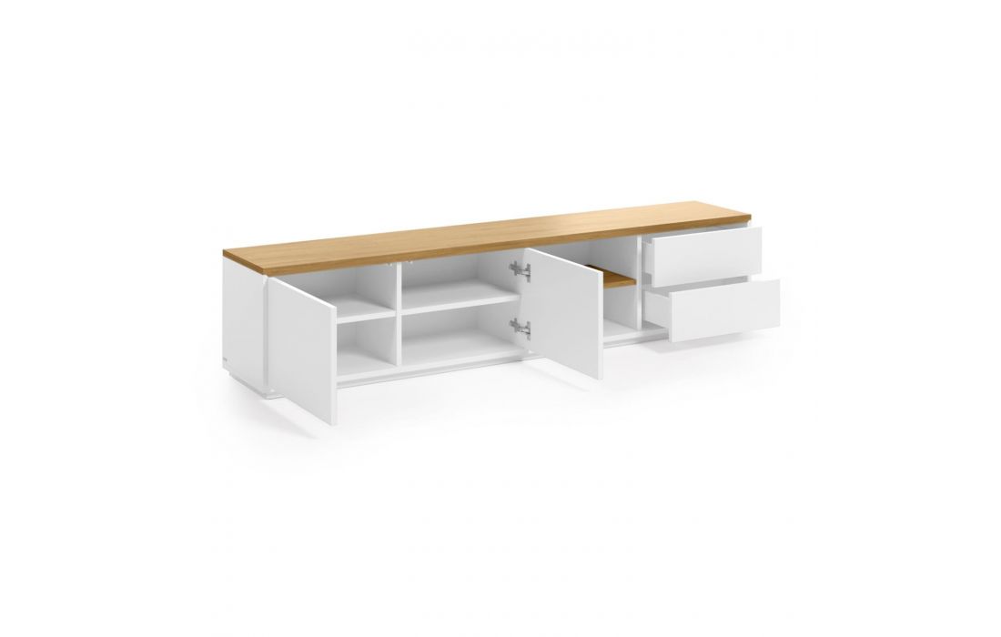 BASE DE TV COM TAMPO E PRATELEIRA FOLHEADO A CARVALHO E PORTAS E GAVETAS LACADAS A BRANCO