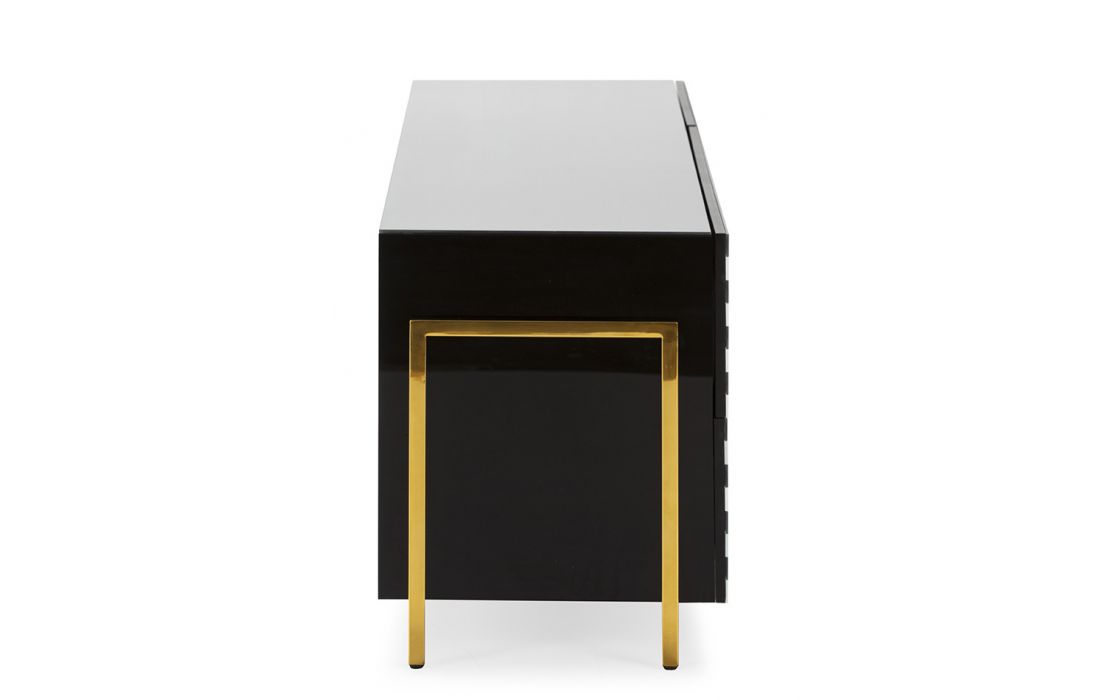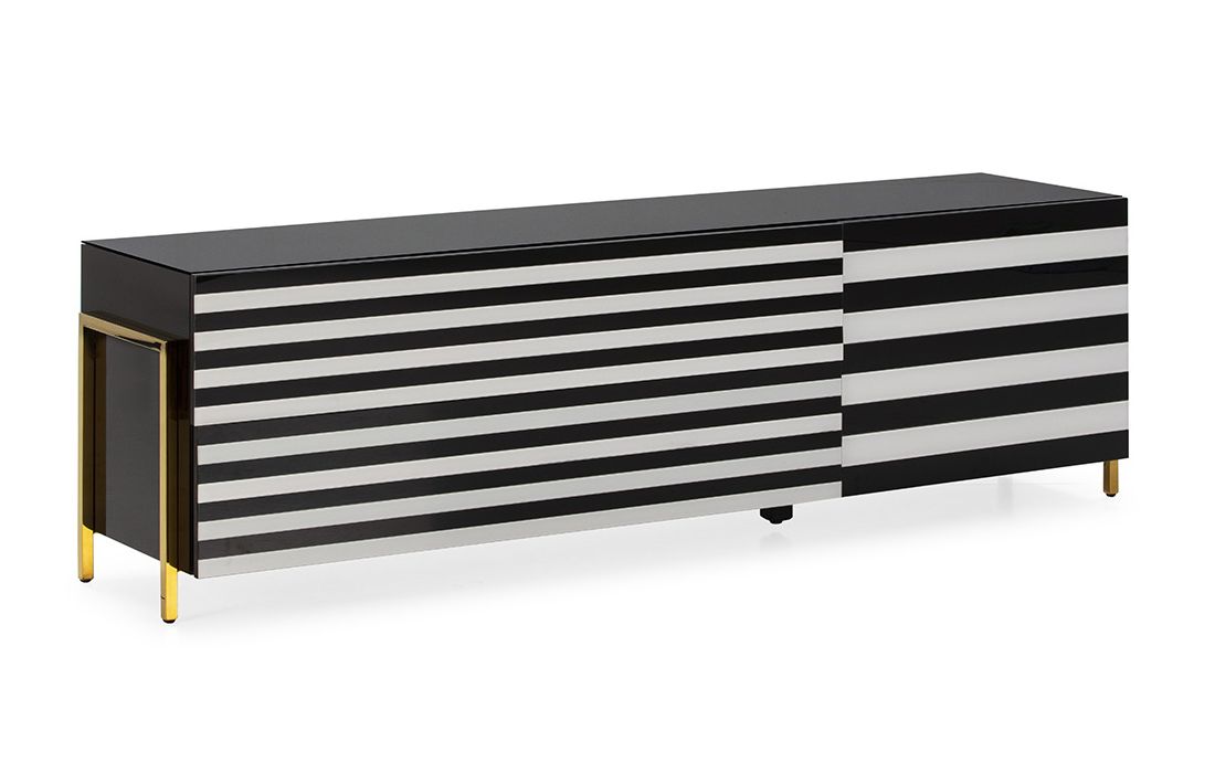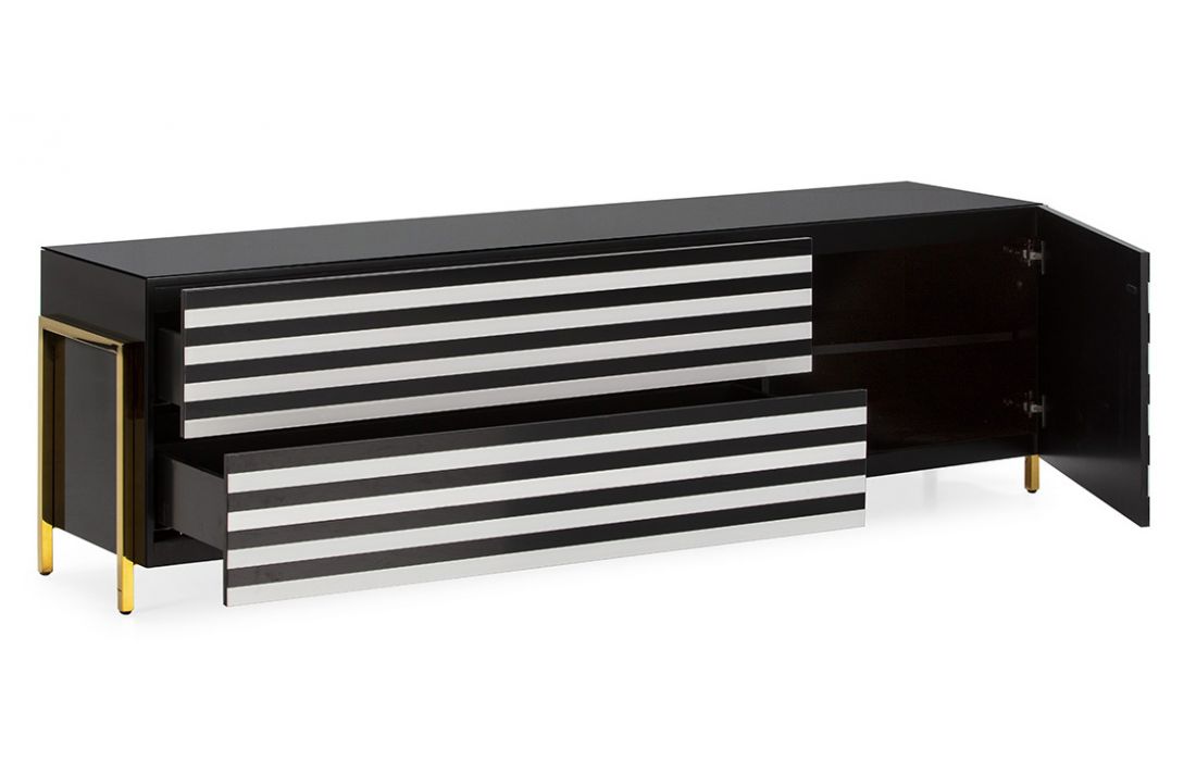 Base tv com 2 gavetas e 1 porta em vidro preto/branco e aço cor dourado