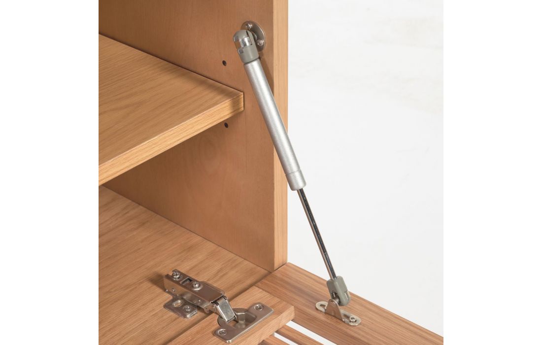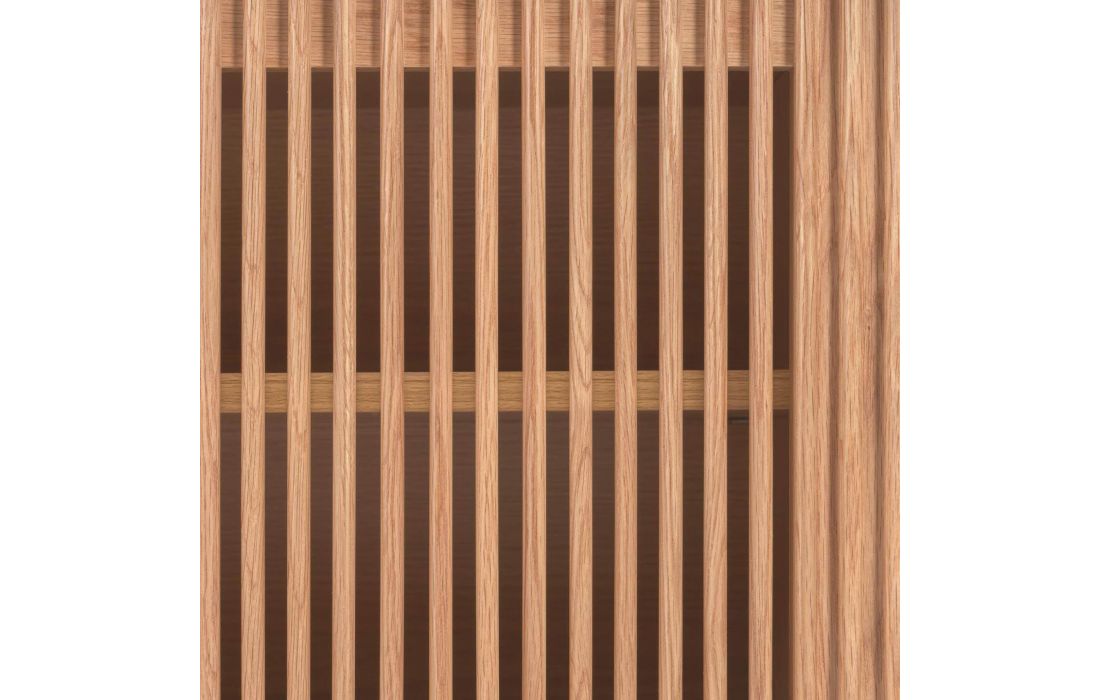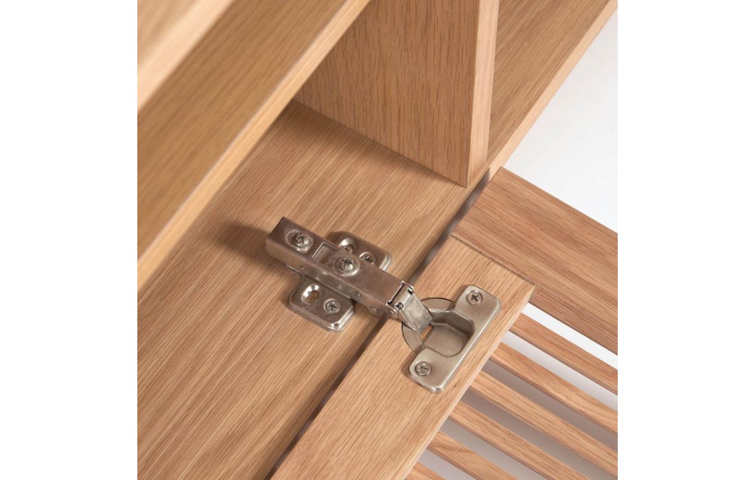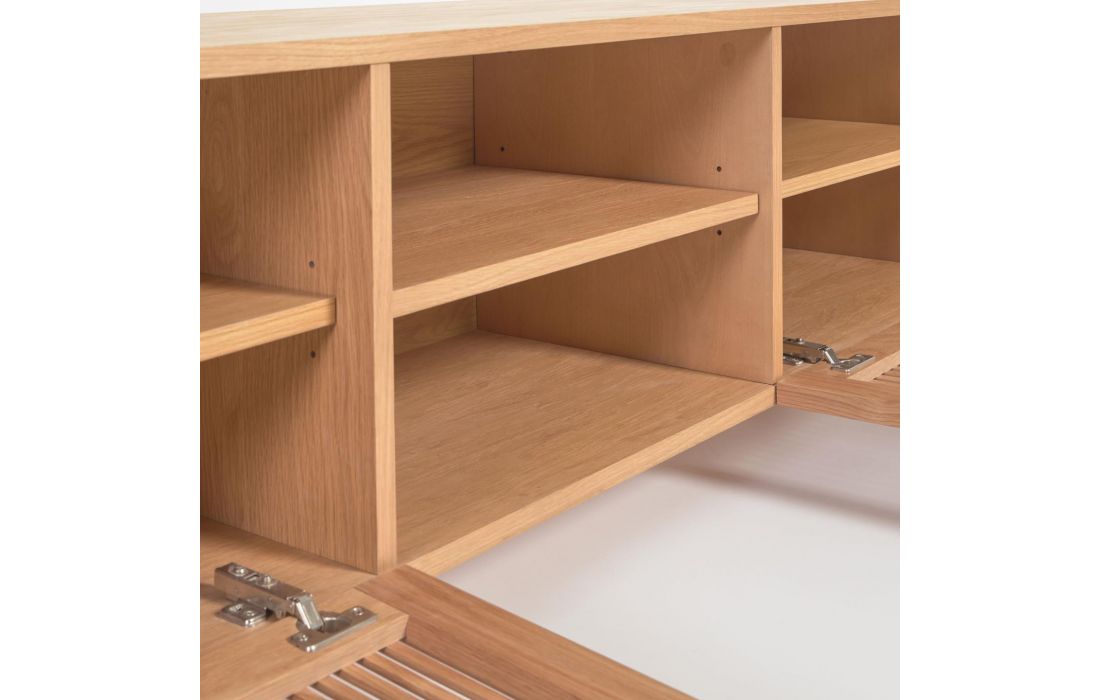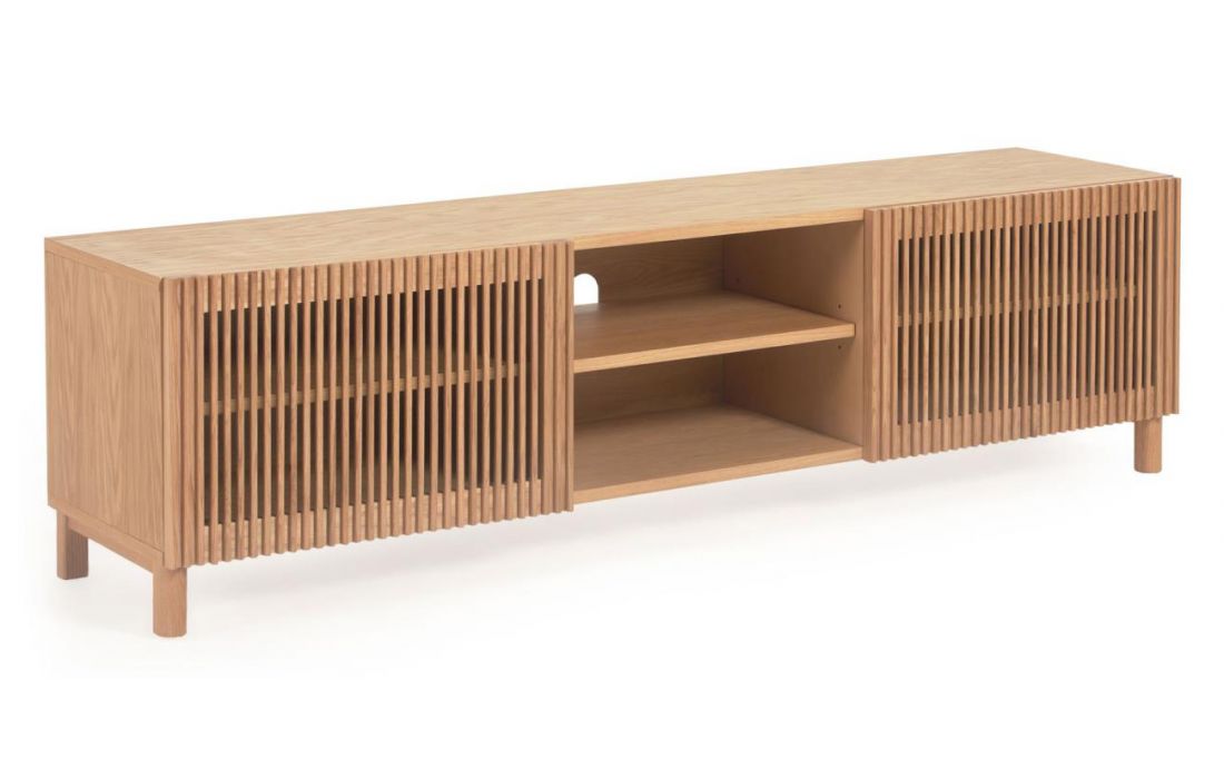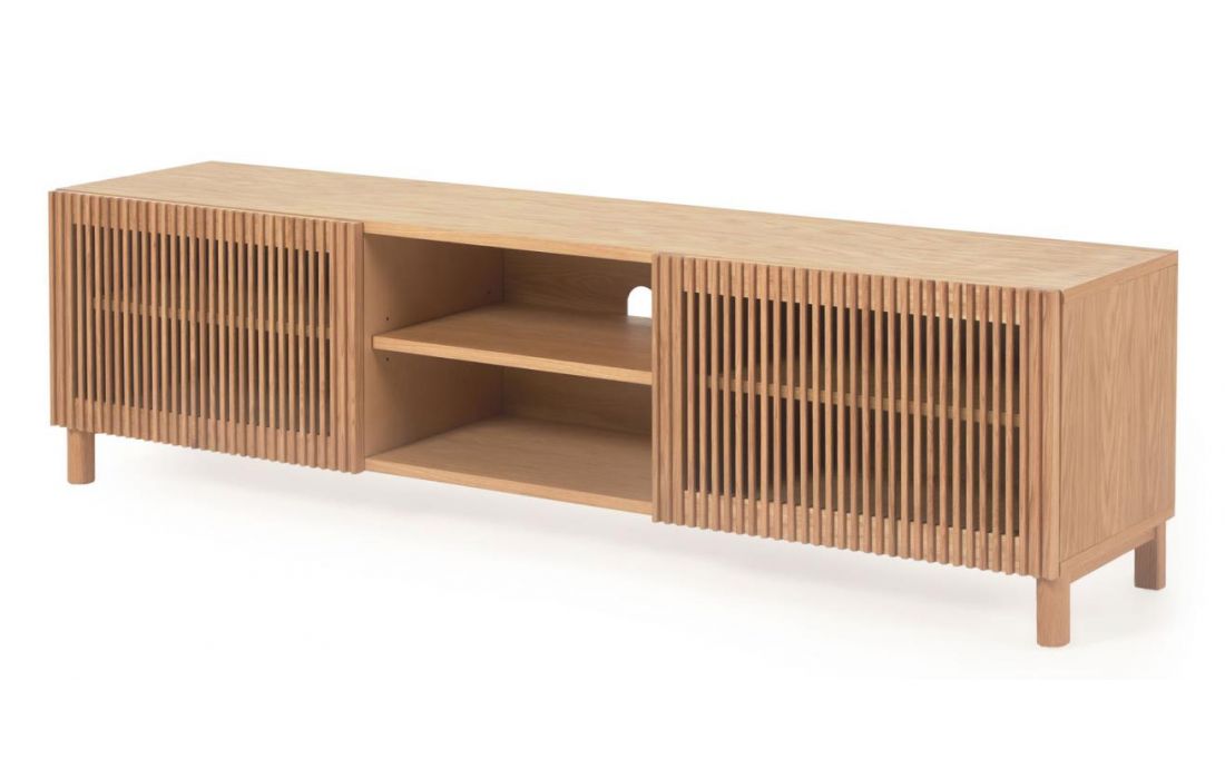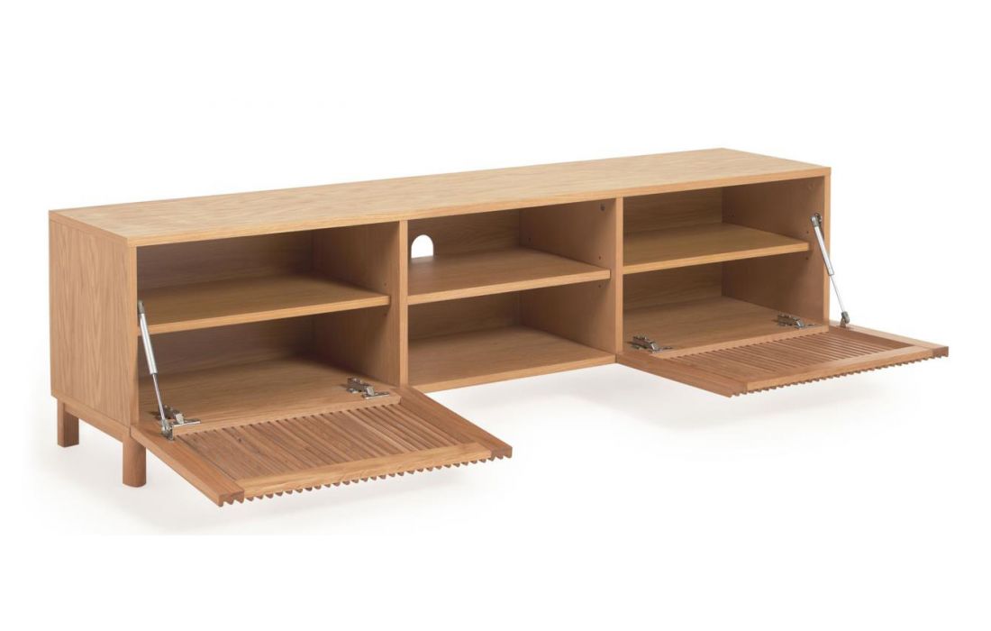 Base TV de 2 portas de cair em madeira de carvalho com portas de ripas originais em linhas verticais