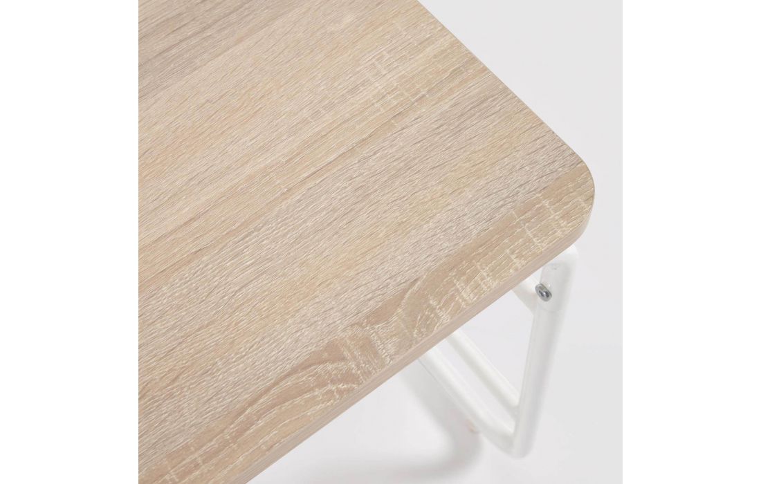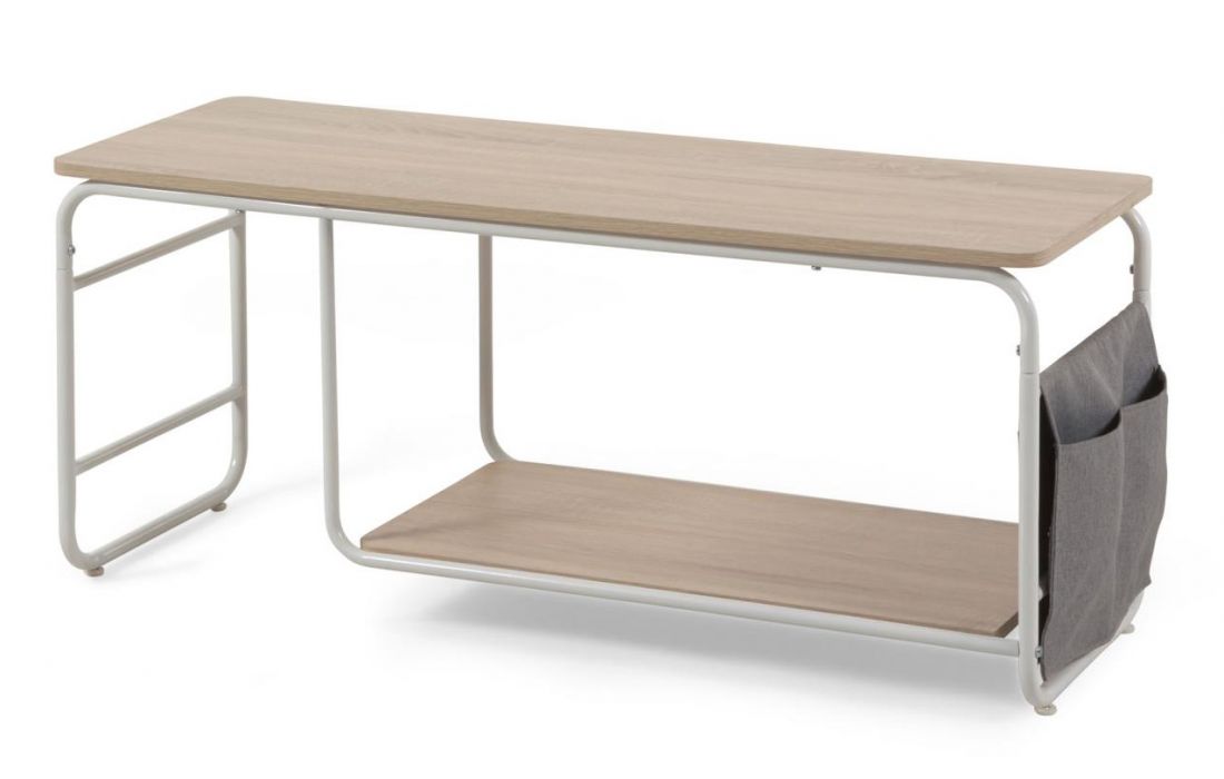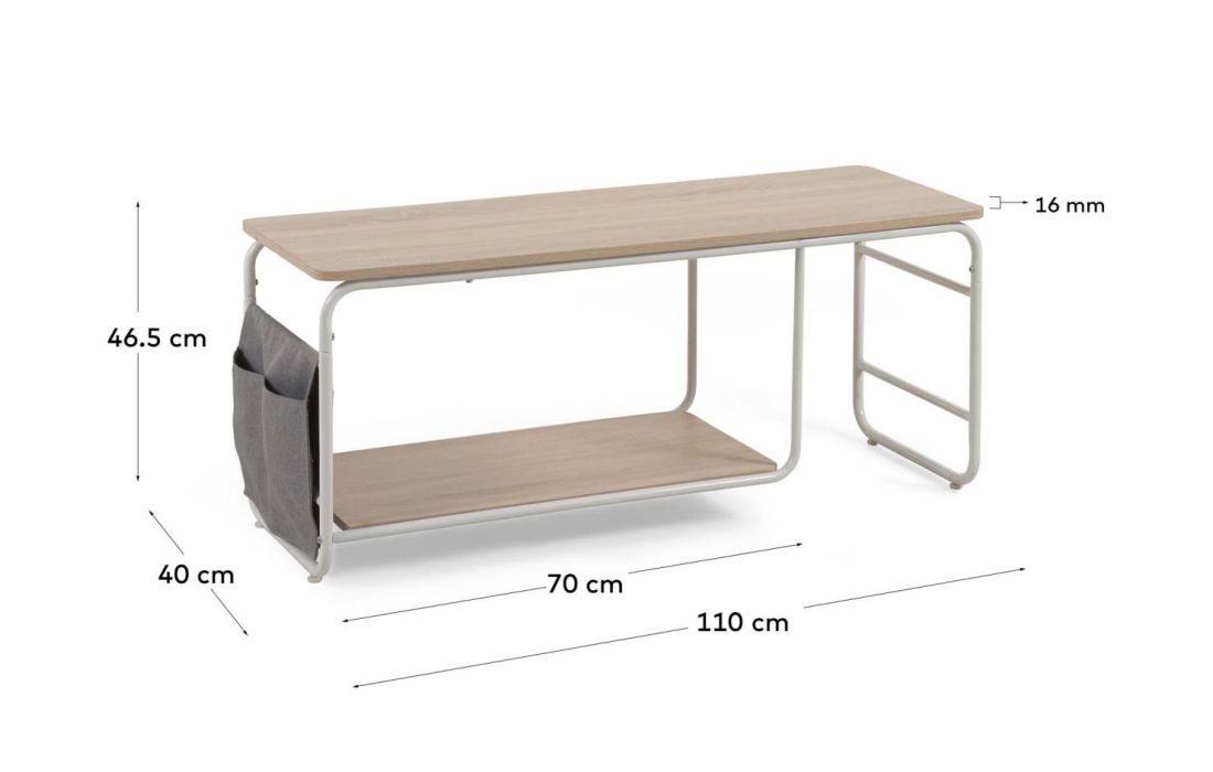 Base TV com estrutura em aço branco, tampos de melamina e bolsa em tecido para acessórios