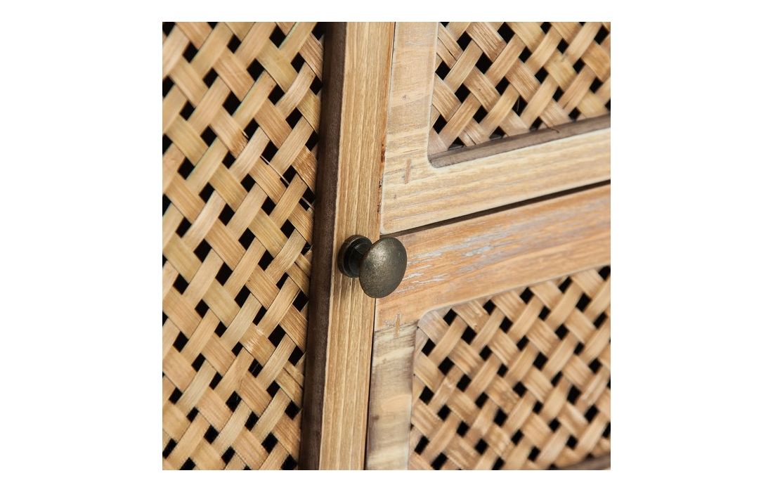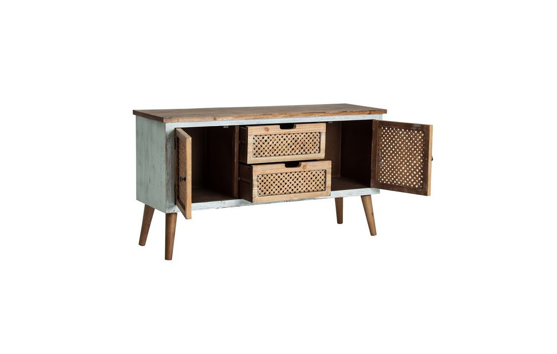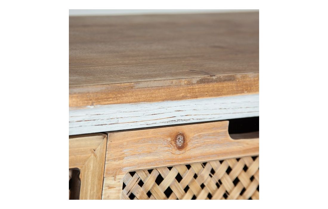 Base TV feito com uma estrutura de madeira de abeto com pormenores em branco e gavetas combinadas com grelha de bambu.