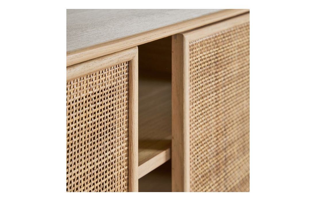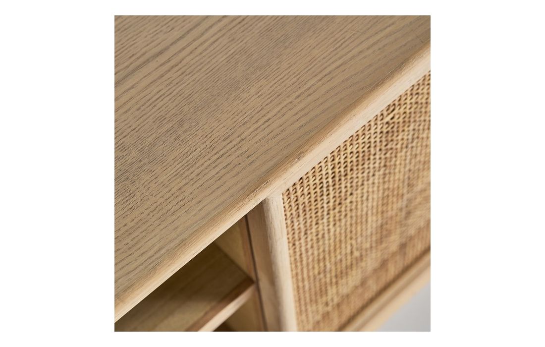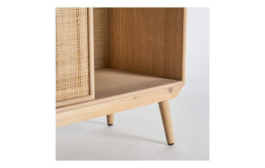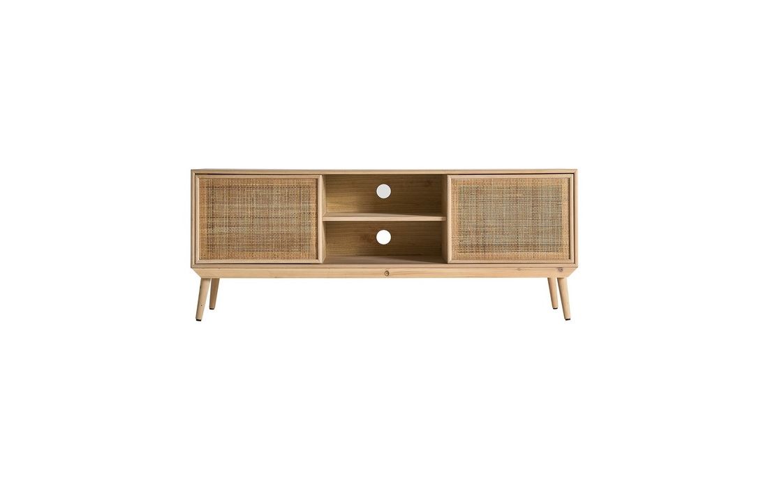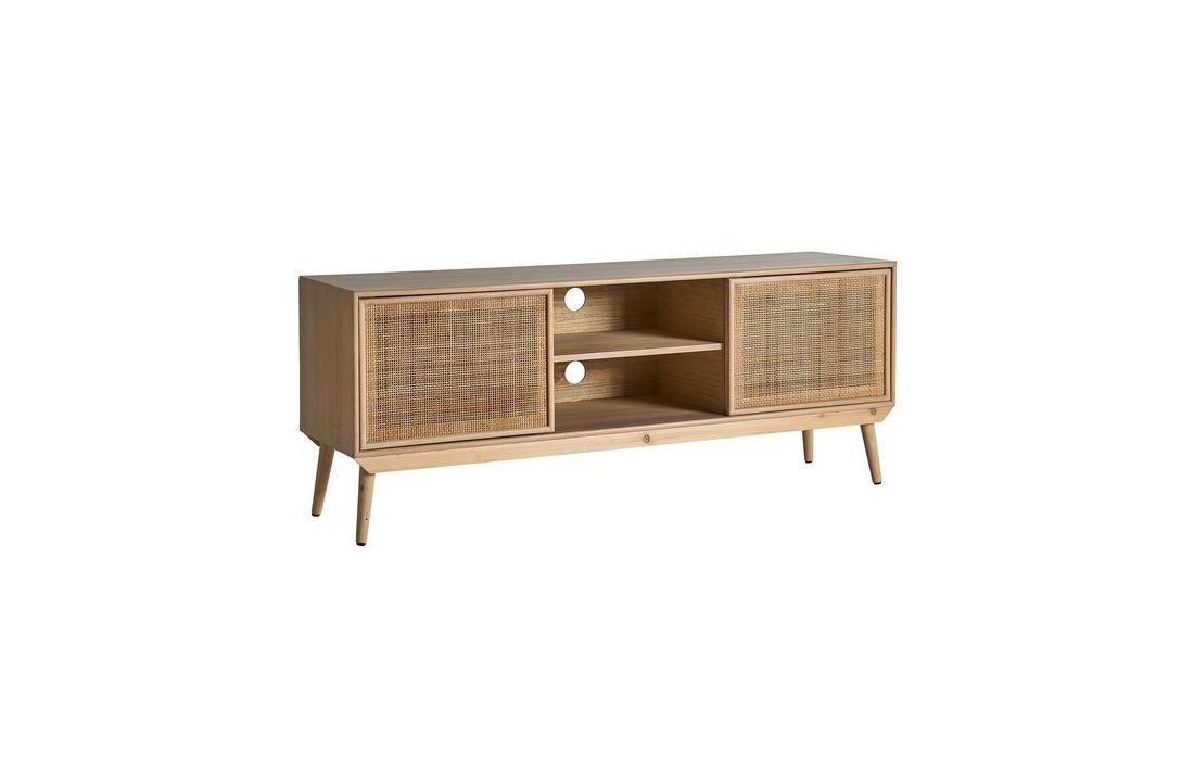 Base TV feito com madeira de pinho e MDF, com duas parteleiras na parte central da peça e nas laterais duas portas de correr em palhinha.
