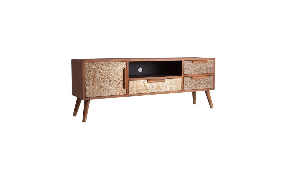 Base TV feito de MDF e aço com 3 gavetas e uma porta na cor castanha e ouro gravado