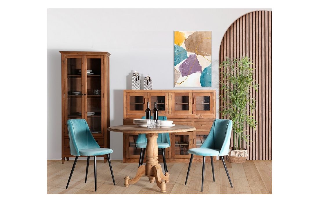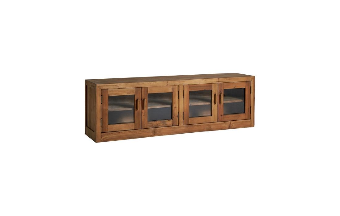 Base TV feito inteiramente em madeira de pinho de cor natural e é composto por quatro portas com prateleiras interiores na parte superior.