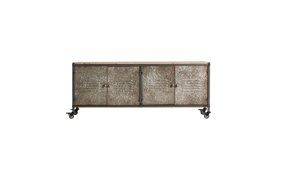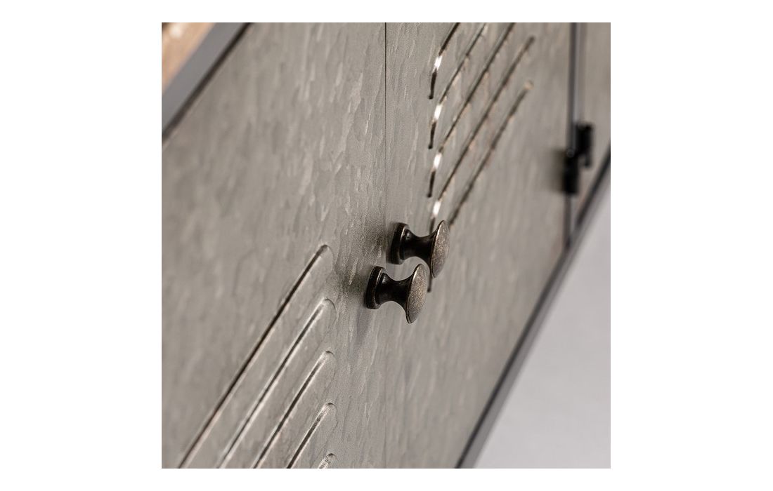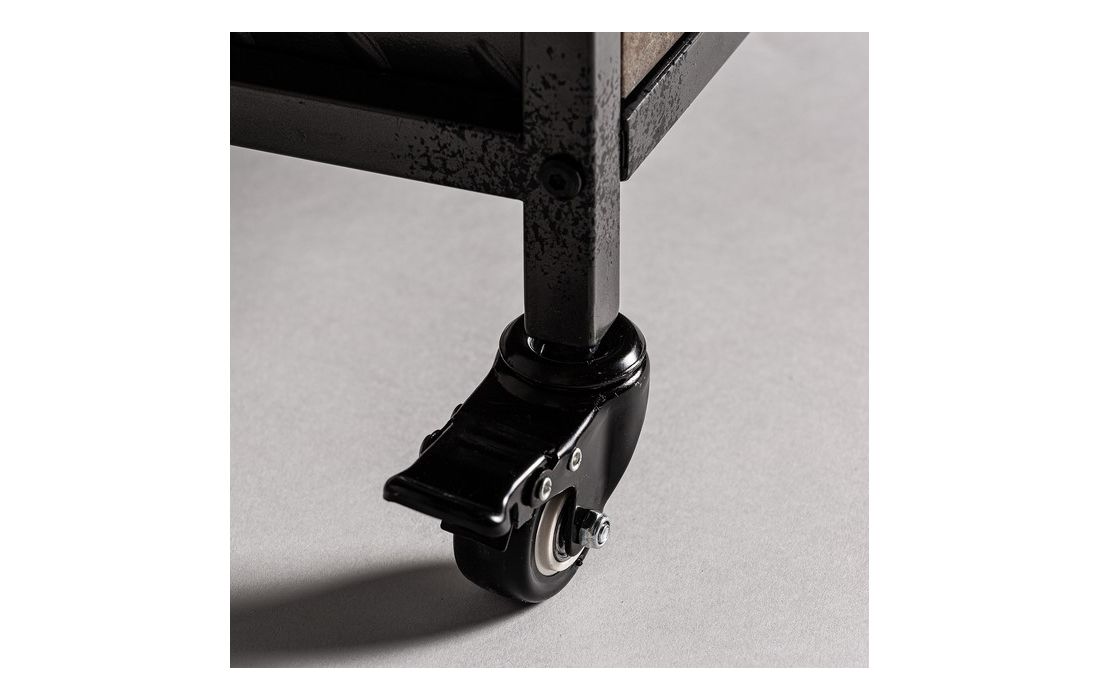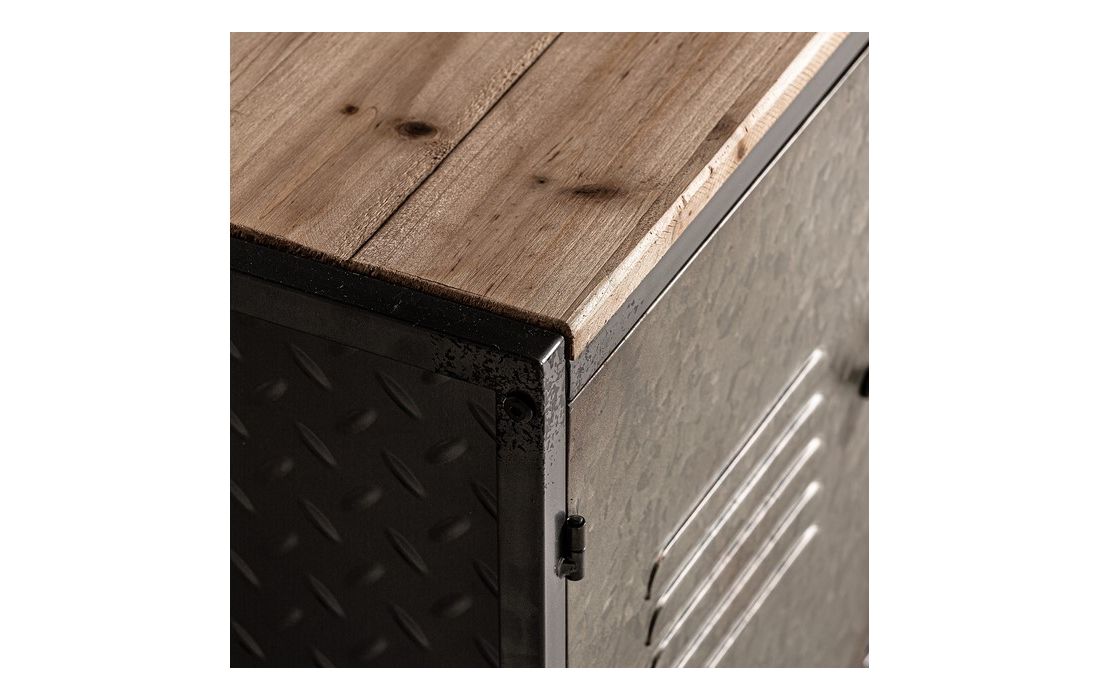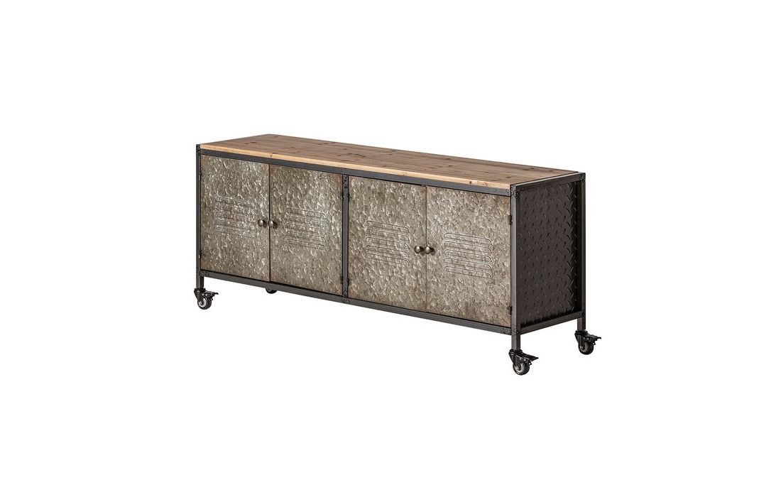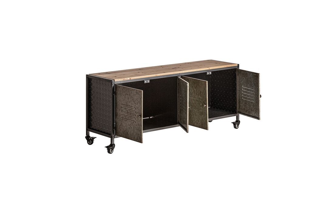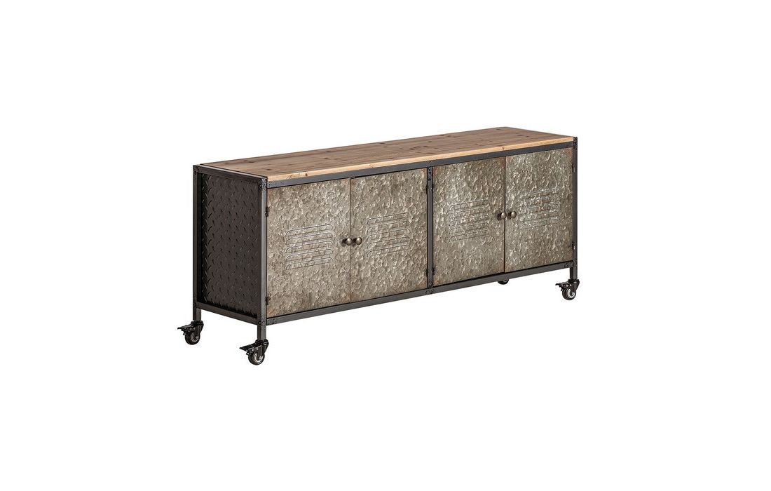 Base TV feito em ferro na cor cinza e madeira de abeto.