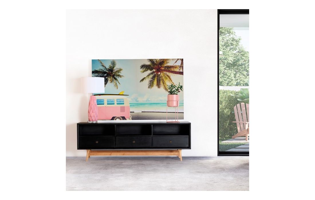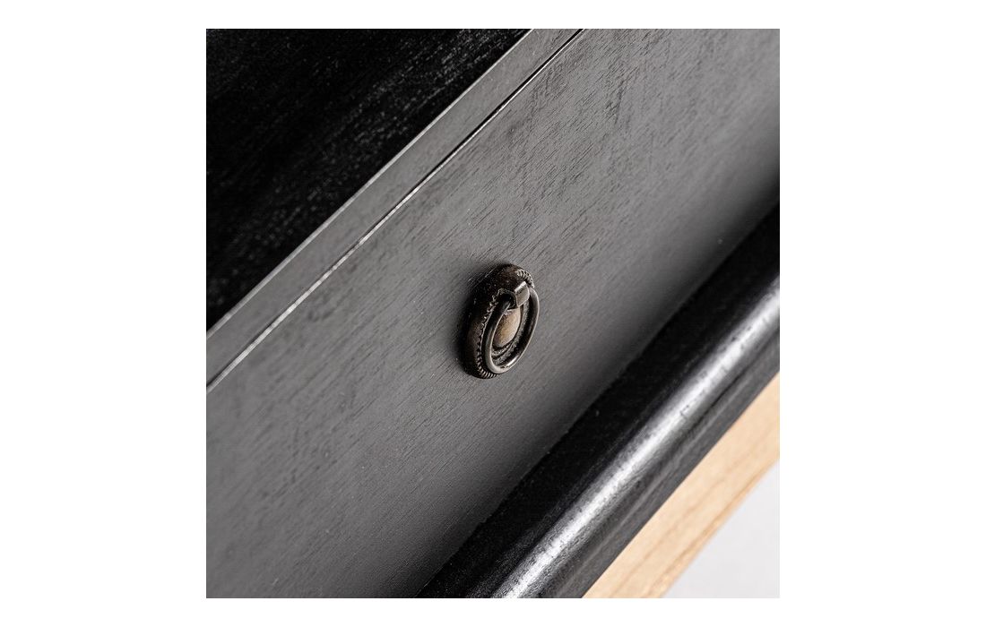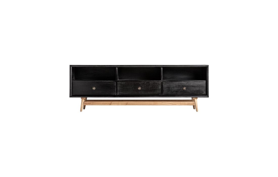 Base TV feito em madeira mindi lacada a preto, é composto por três gavetas e por uns pés em madeira na cor natural.