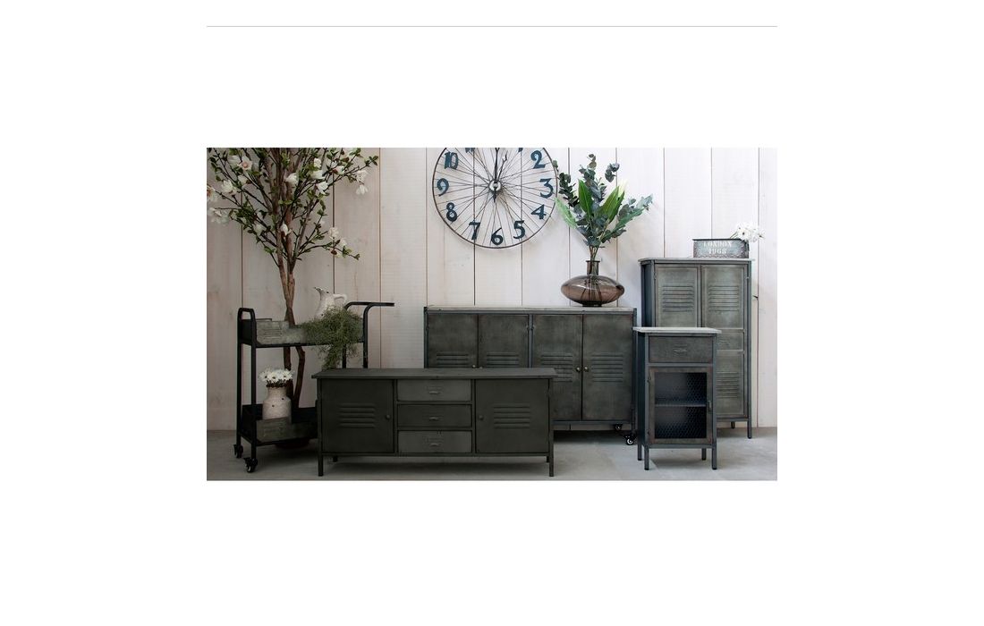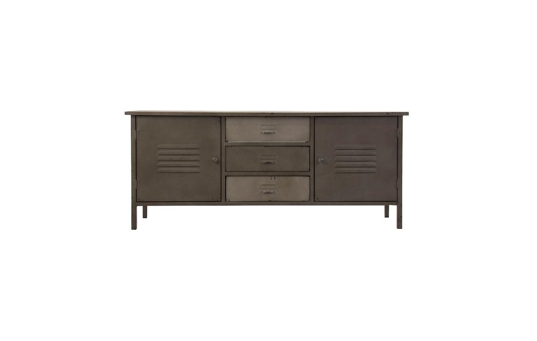 Base TV feito de ferro cinza e preto formado por uma estrutura simples com três gavetas e duas portas laterais.