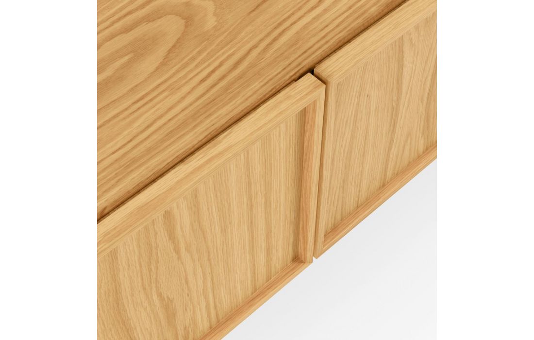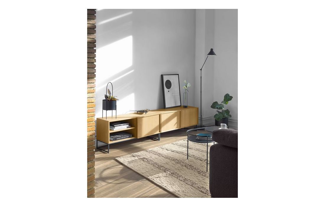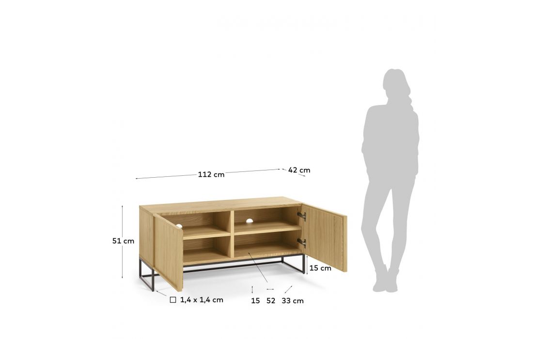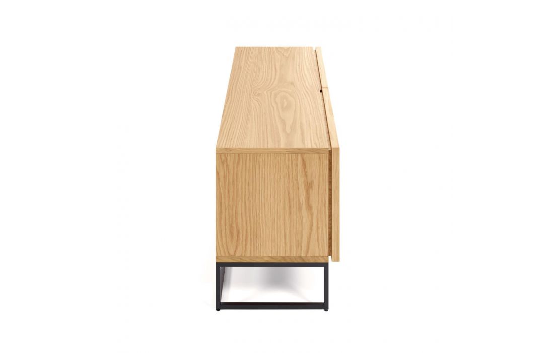 Base TV com 2 portas, em mdf folheado a carvalho e aço pintado na cor preto