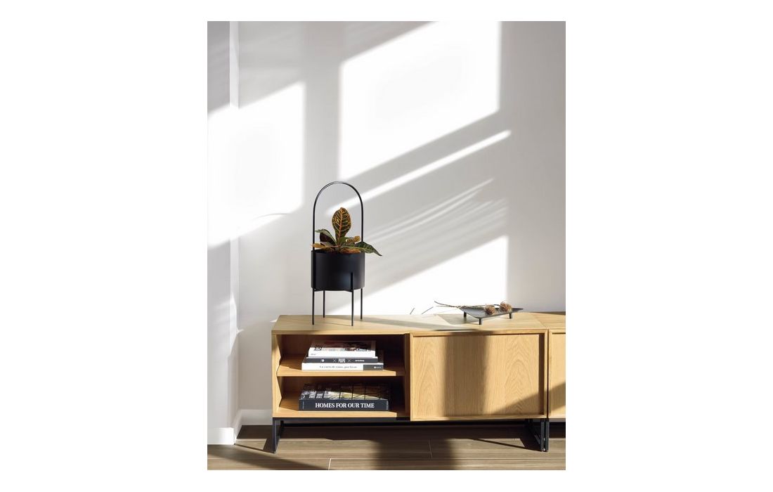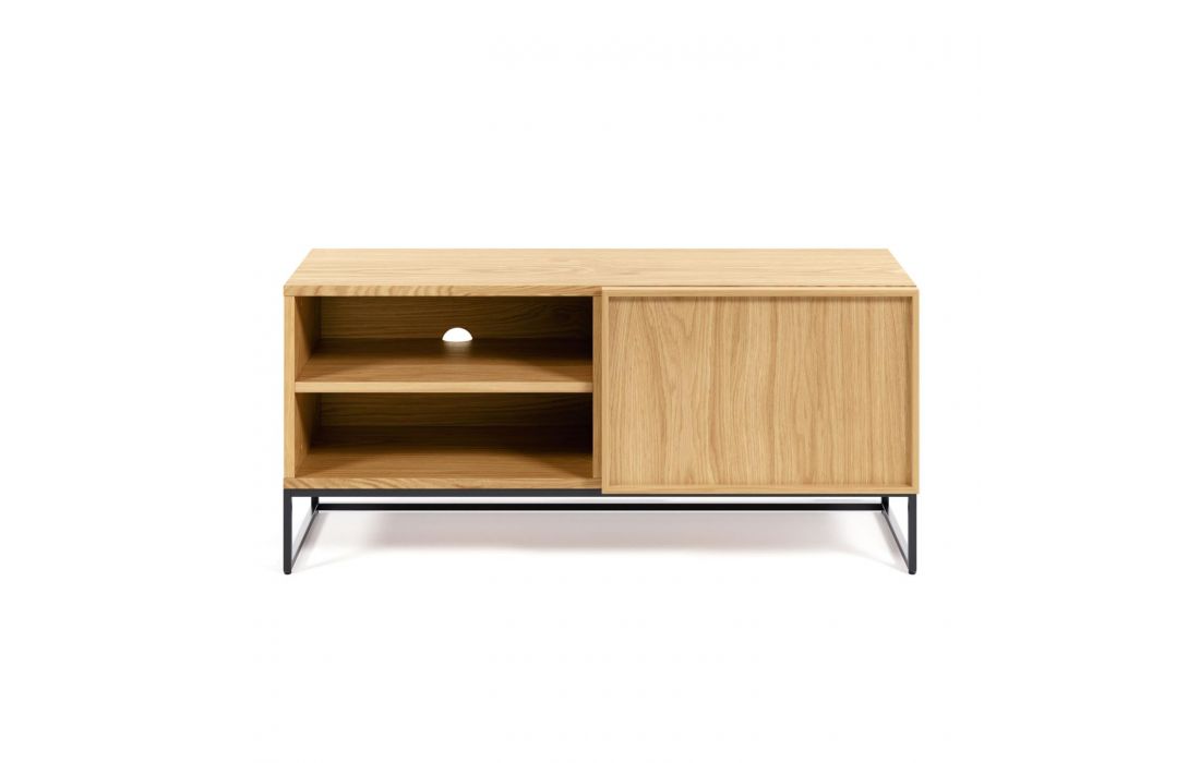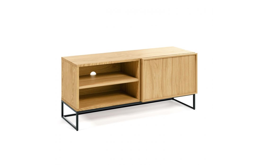 Base TV com 1 porta, em mdf folheado a carvalho e aço pintado na cor preto