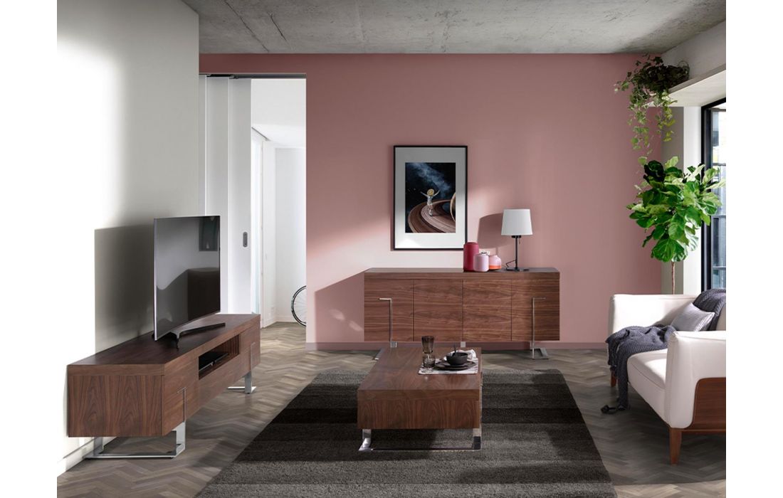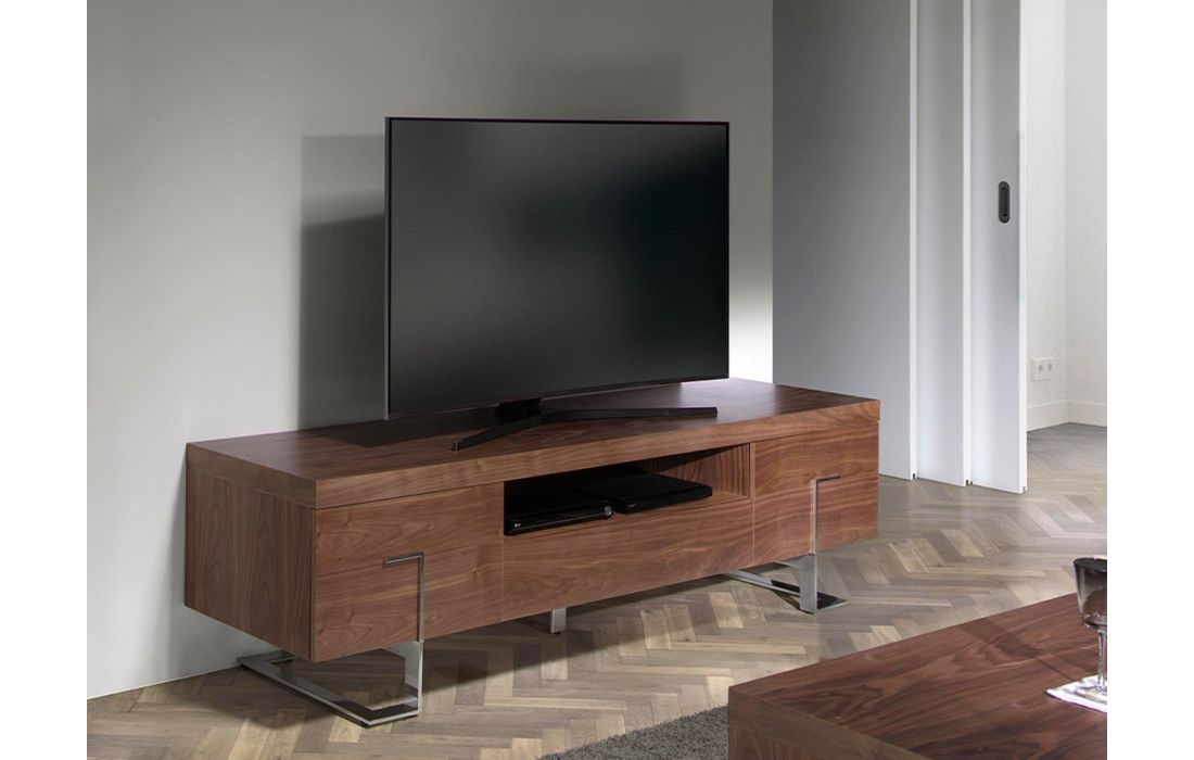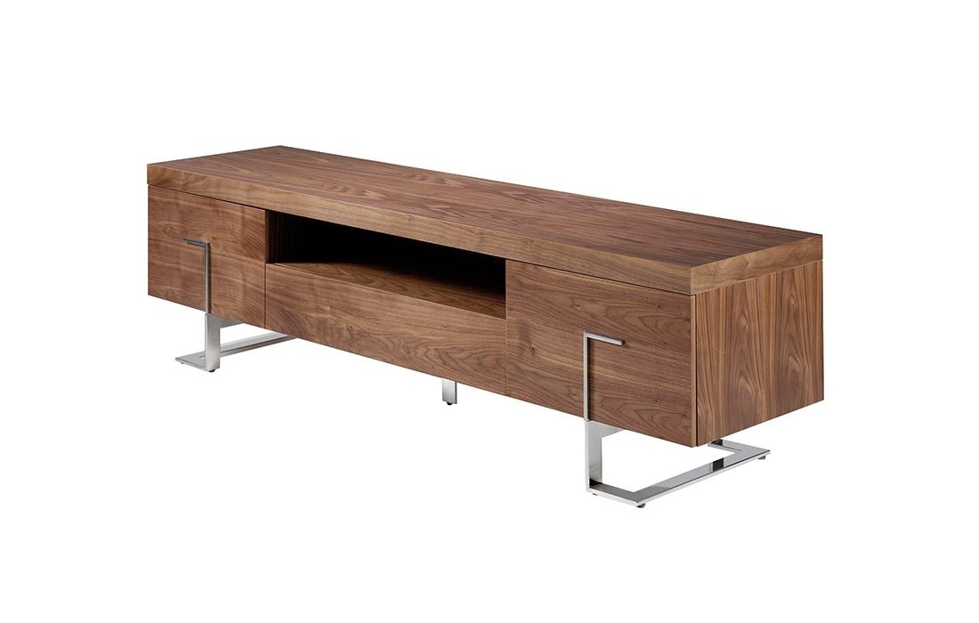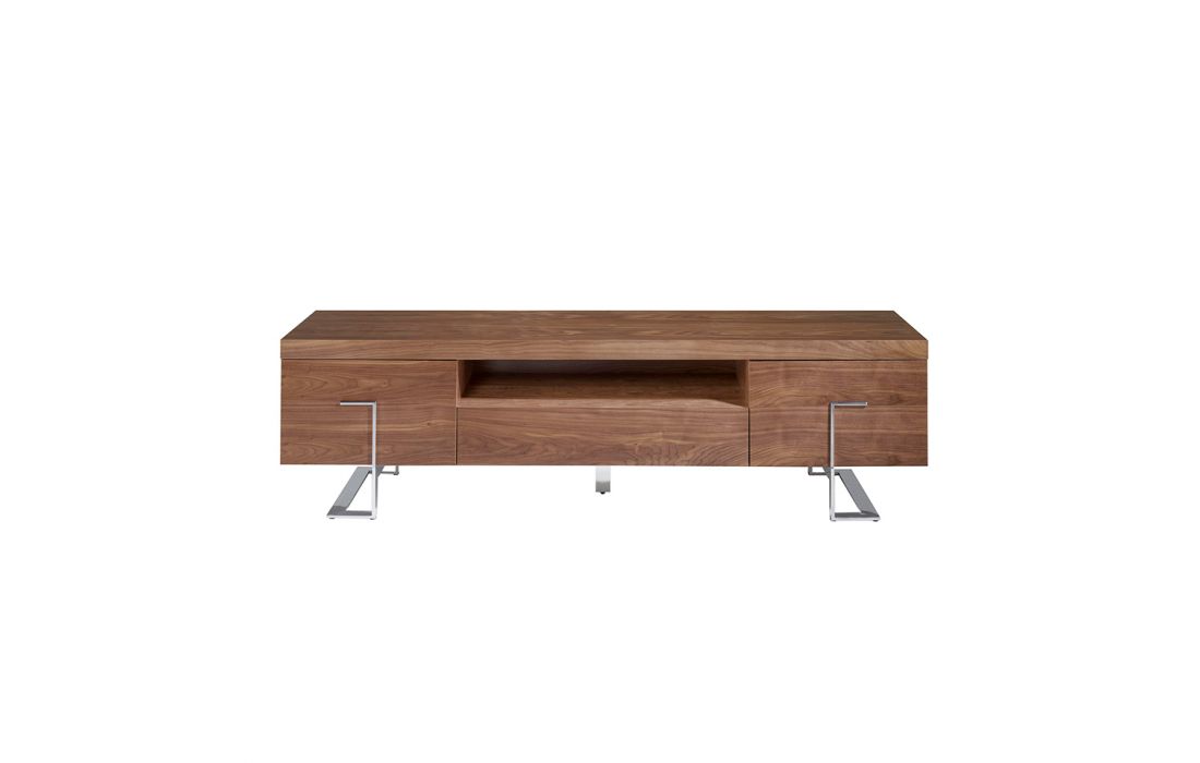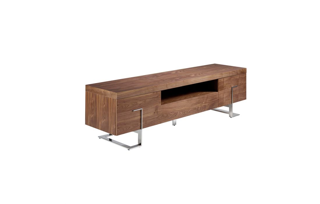 Móvel de TV em madeira folheada a nogueira natural com uma gaveta central e dois armários laterais em nogueira. Detalhes e pés em aço inox cromado