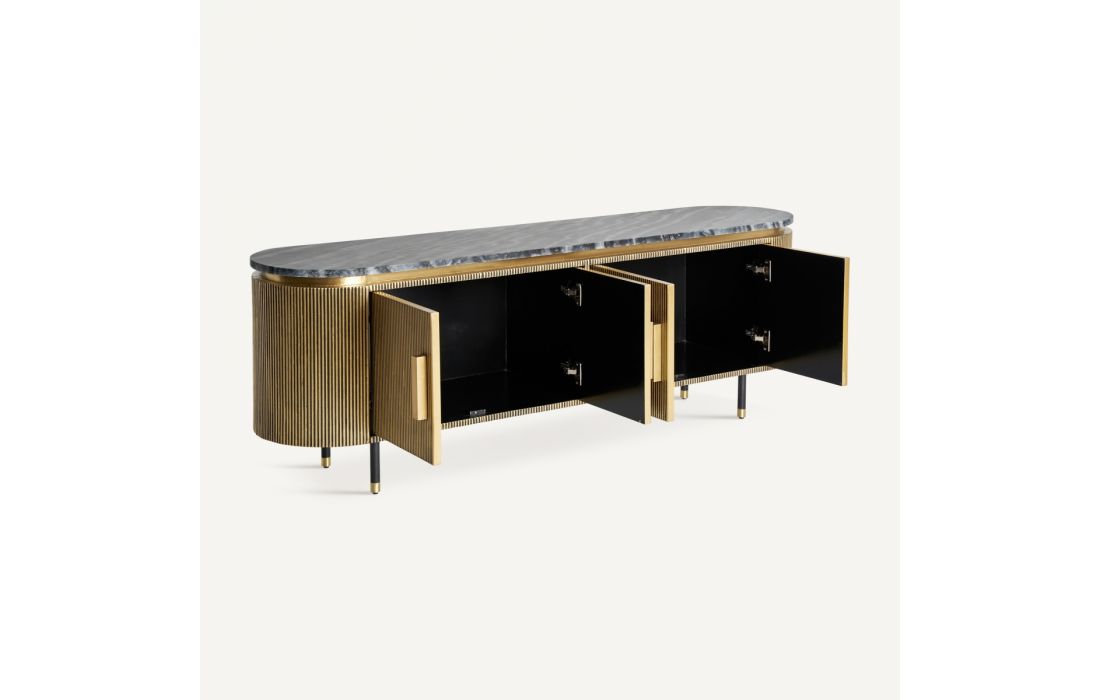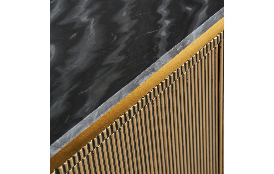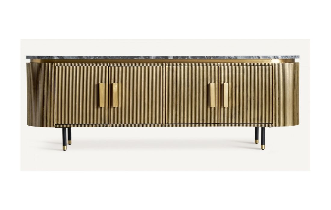 Base tv de 4 portas e 2 gavetas , fabricado em ferro dourado com estilo envelhecido , com tampo em mármore