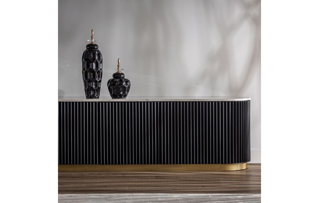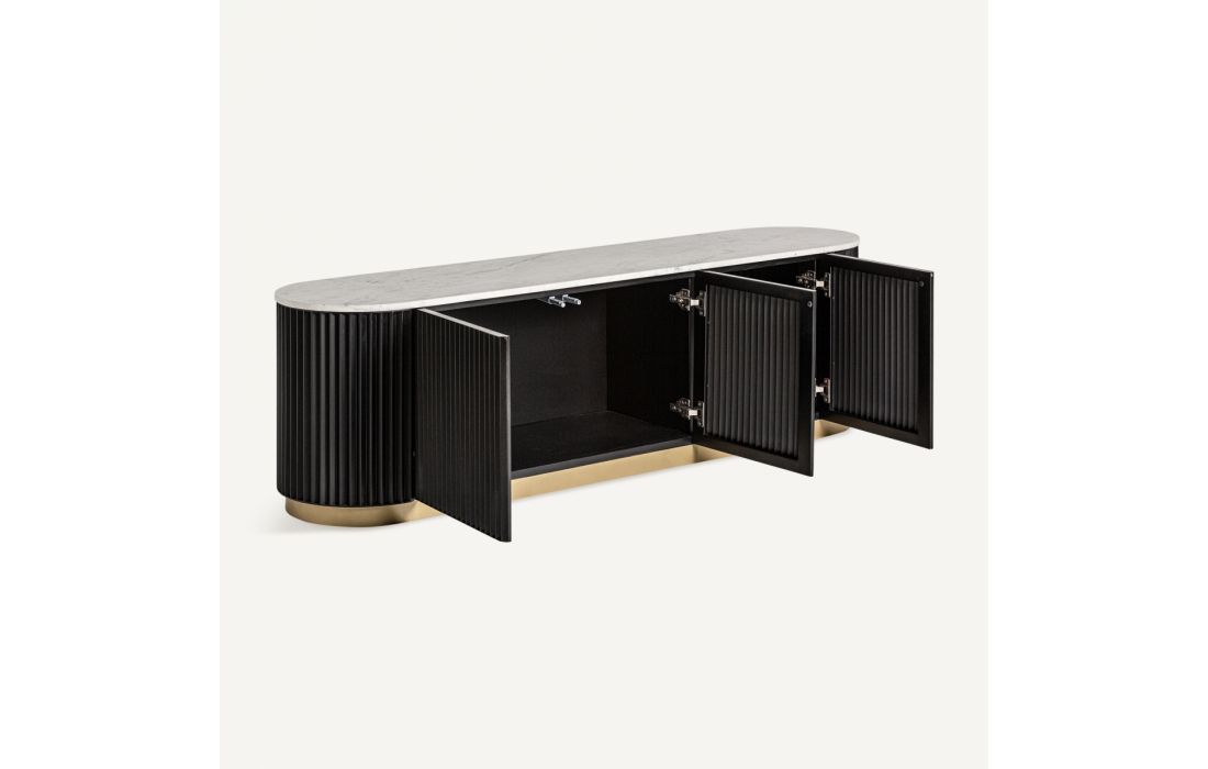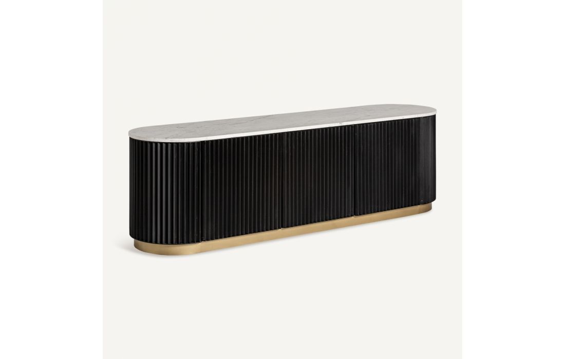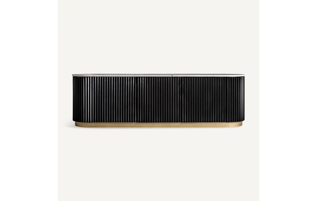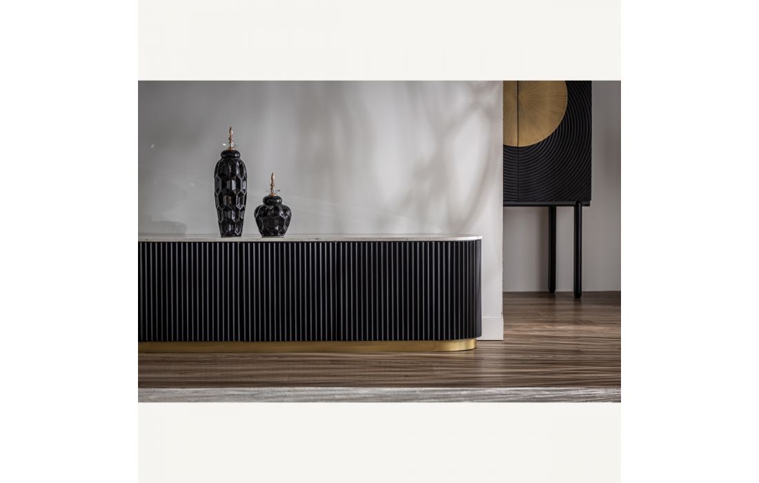 Base tv com base em metal dourado , feito em madeira dm preta , com tampo em mármore.Prazo de Entrega