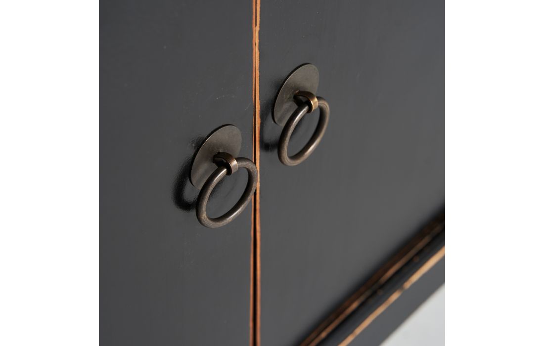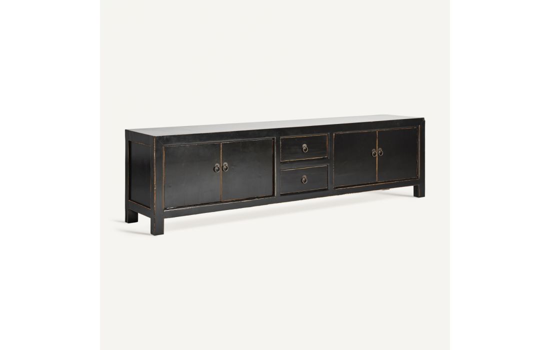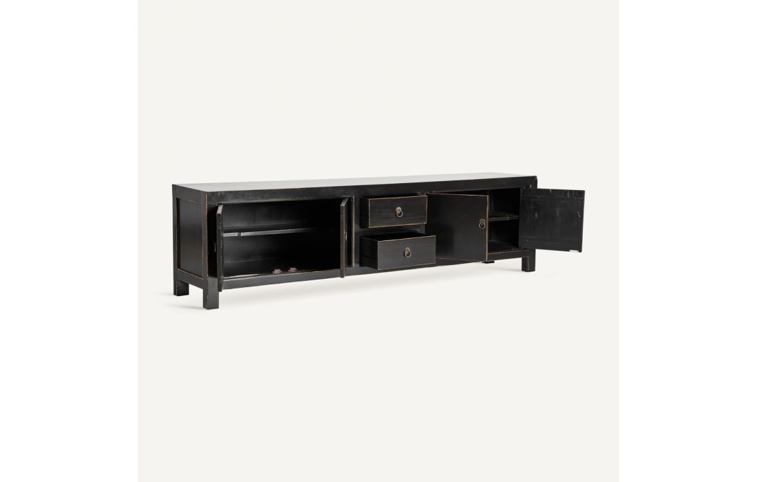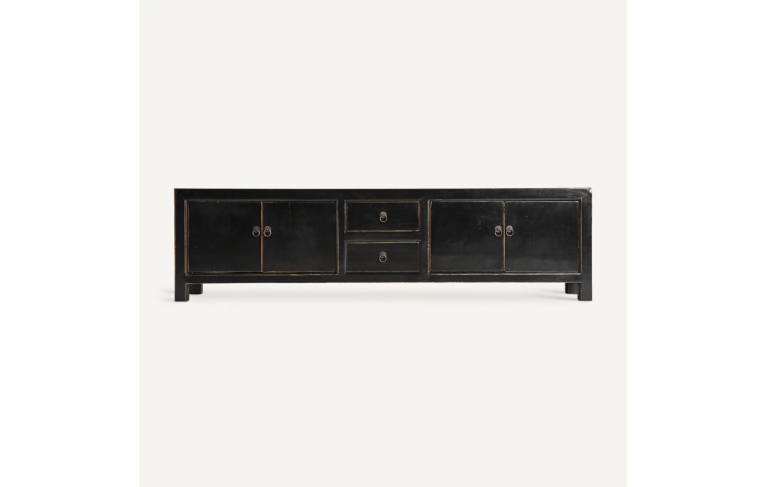Base Tv em madeira de pinho reciclado na cor preto , com 4 portas e 2 gavetas .Prazo de Entrega