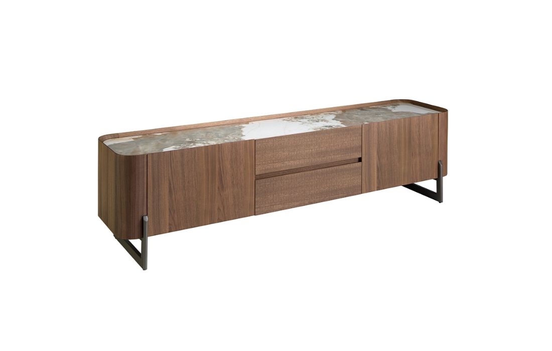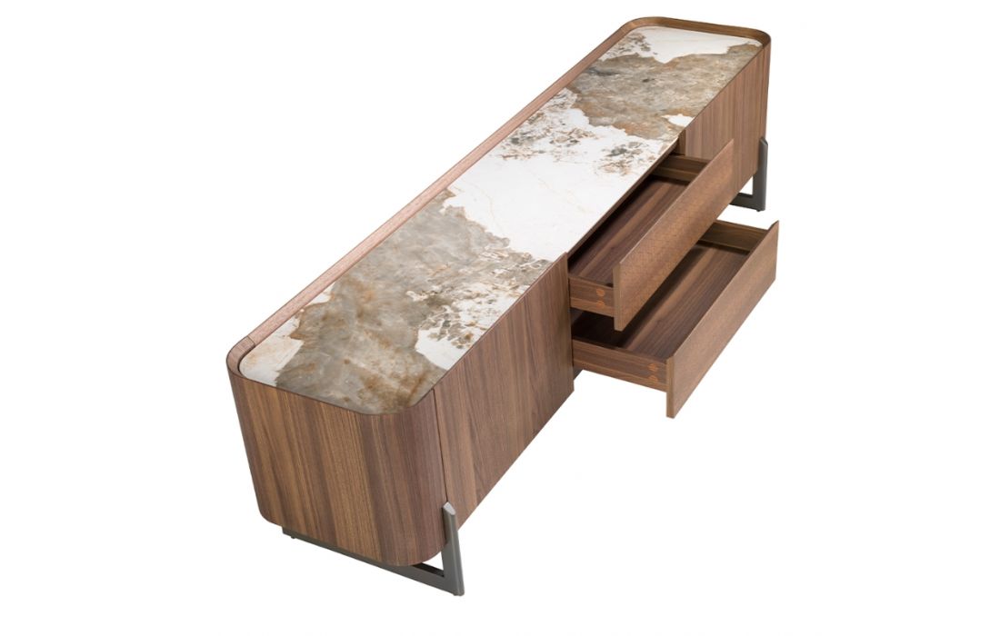 Móvel TV com estrutura em MDF a nogueira natural e pés em aço inoxidável e tampo em mármore com acabamento brilhanteDestinatário :