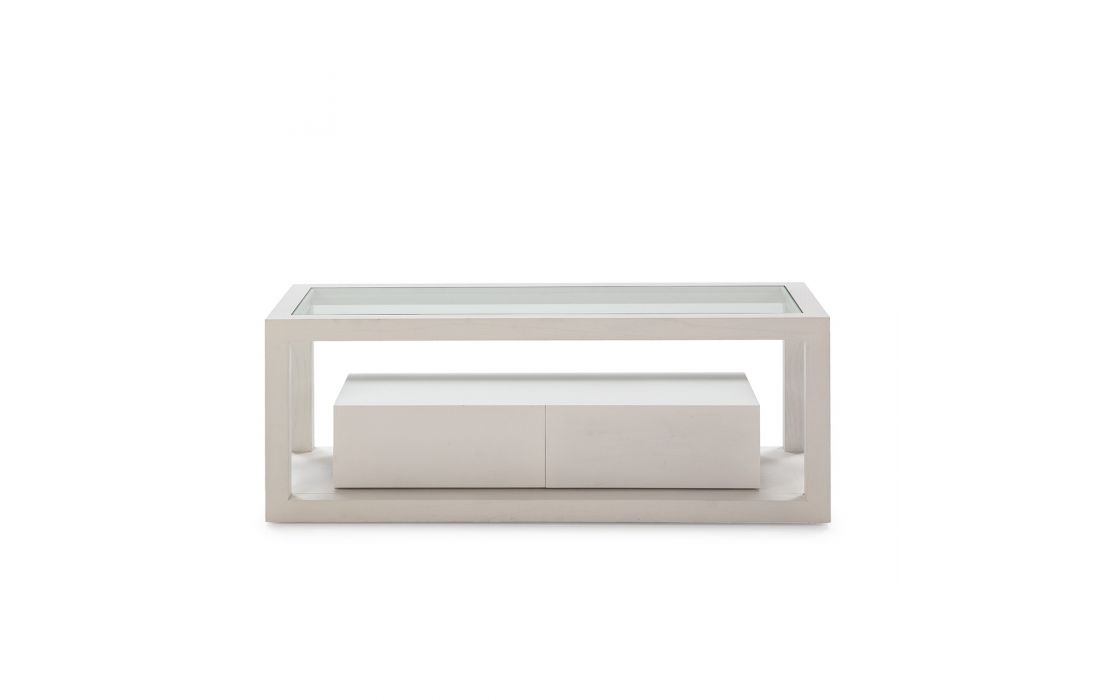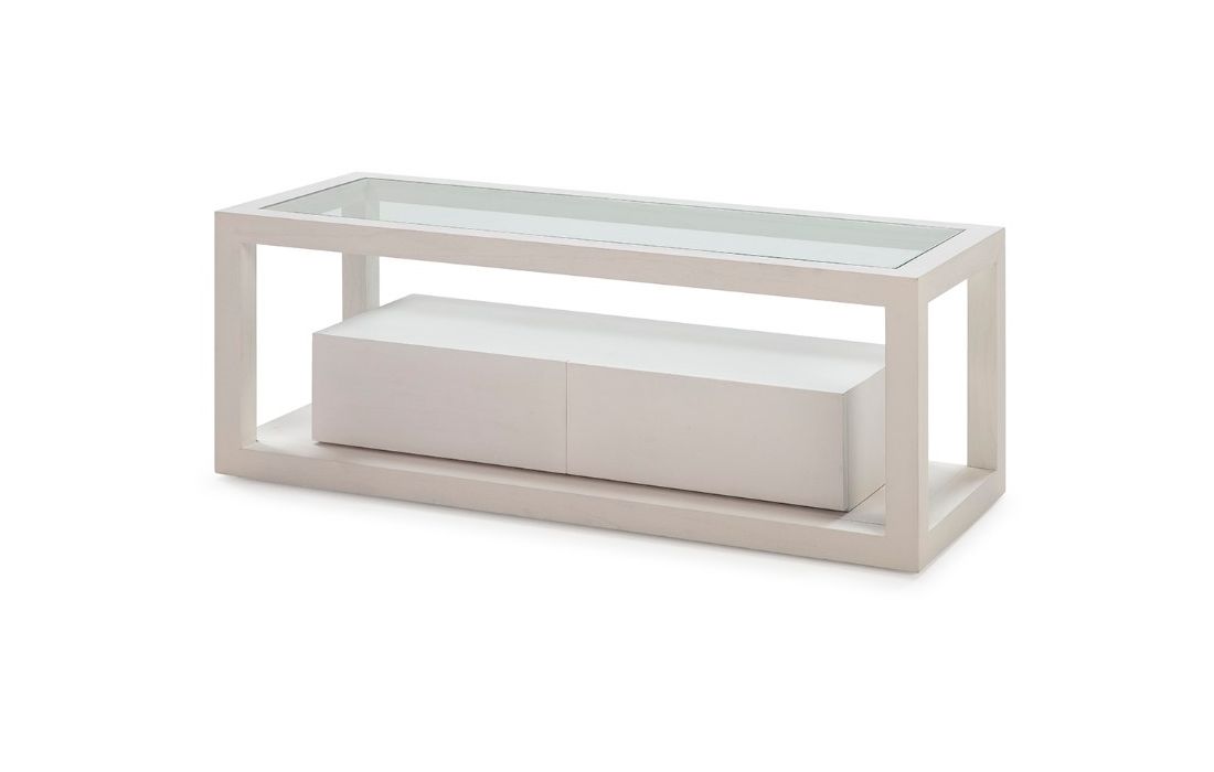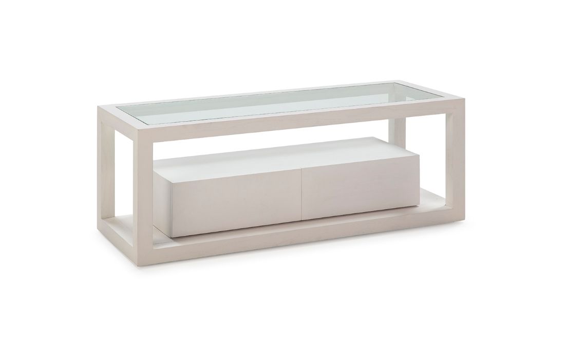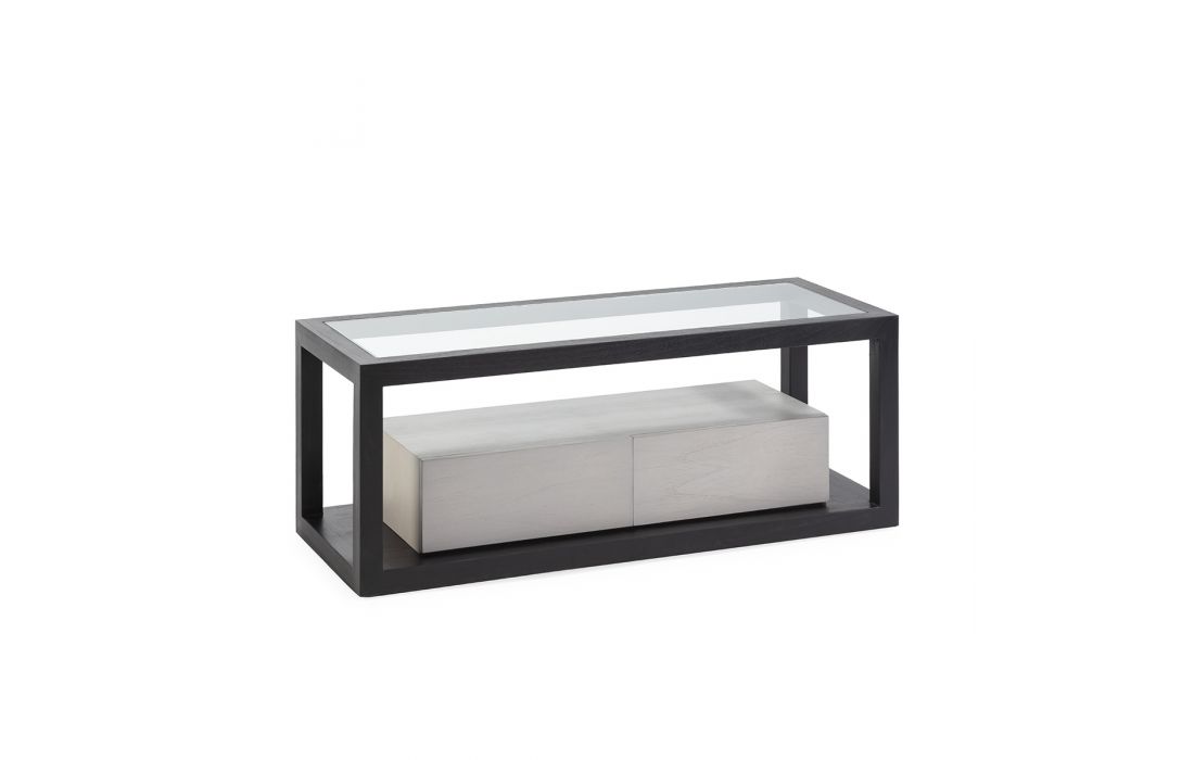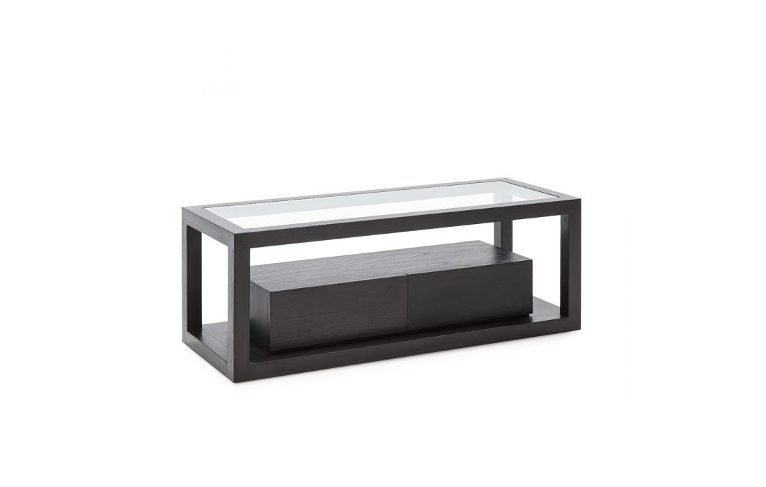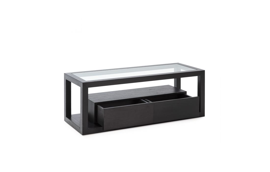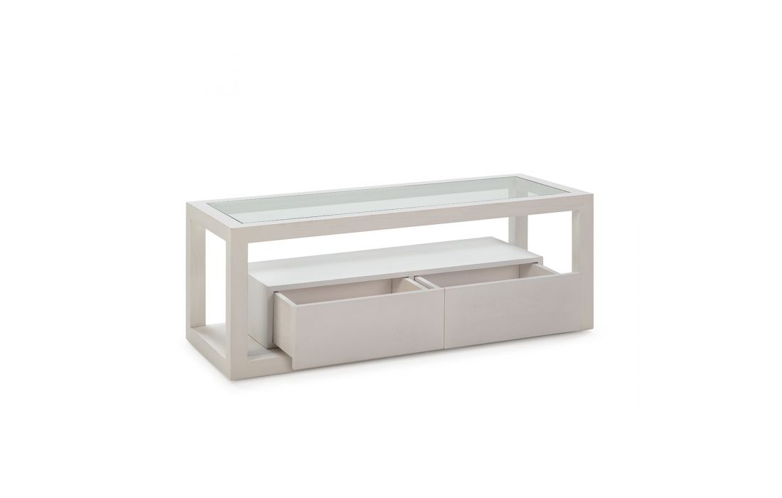 Base tv em madeira de cedro com 2 gavetas e tampo em vidro.