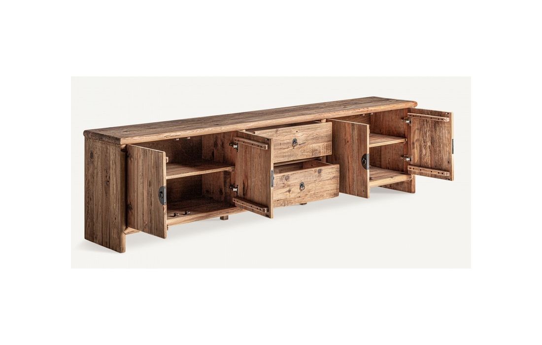 Móvel de TV em madeira de pinho reciclada na cor castanha com acabamento envelhecidoDestinatário :