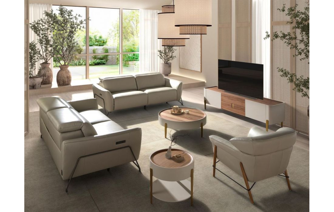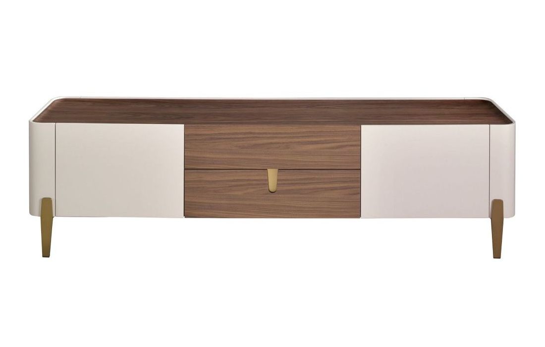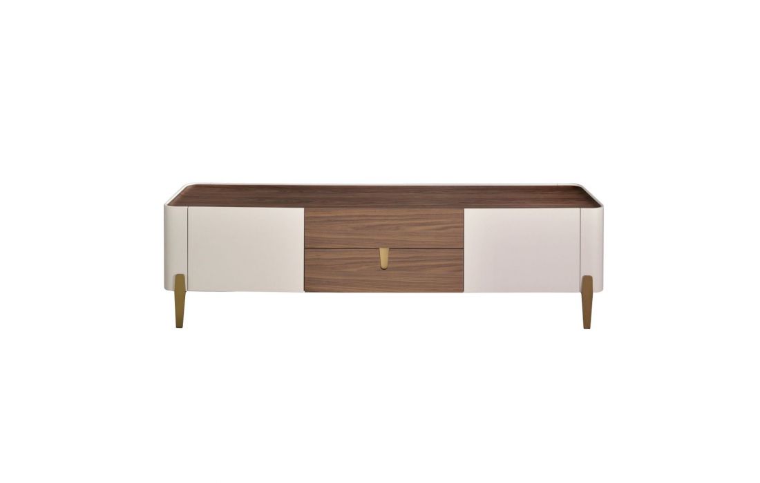 Base de TV de design moderno com MDF de nogueira natural e estrutura em MDF lacado a bege, pés em aço inoxidável, tampo em MDF de nogueira natural e o seu detalhe original em aço inoxidável e 2 e 2 portasDestinatário :