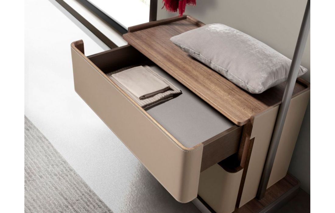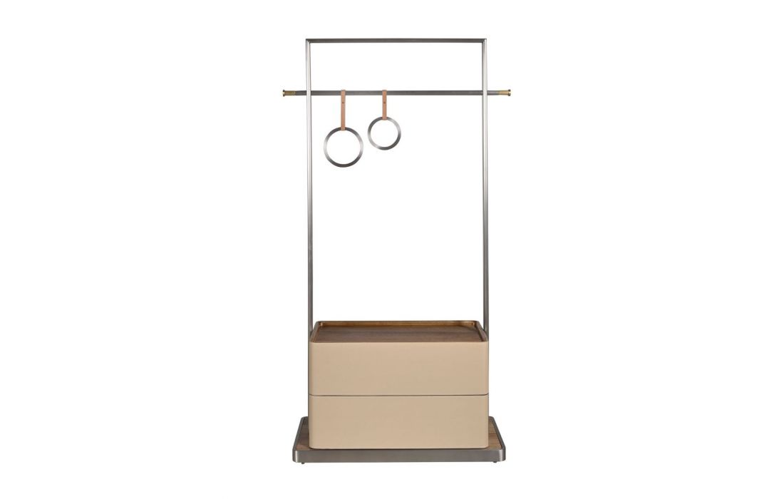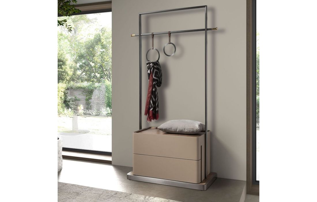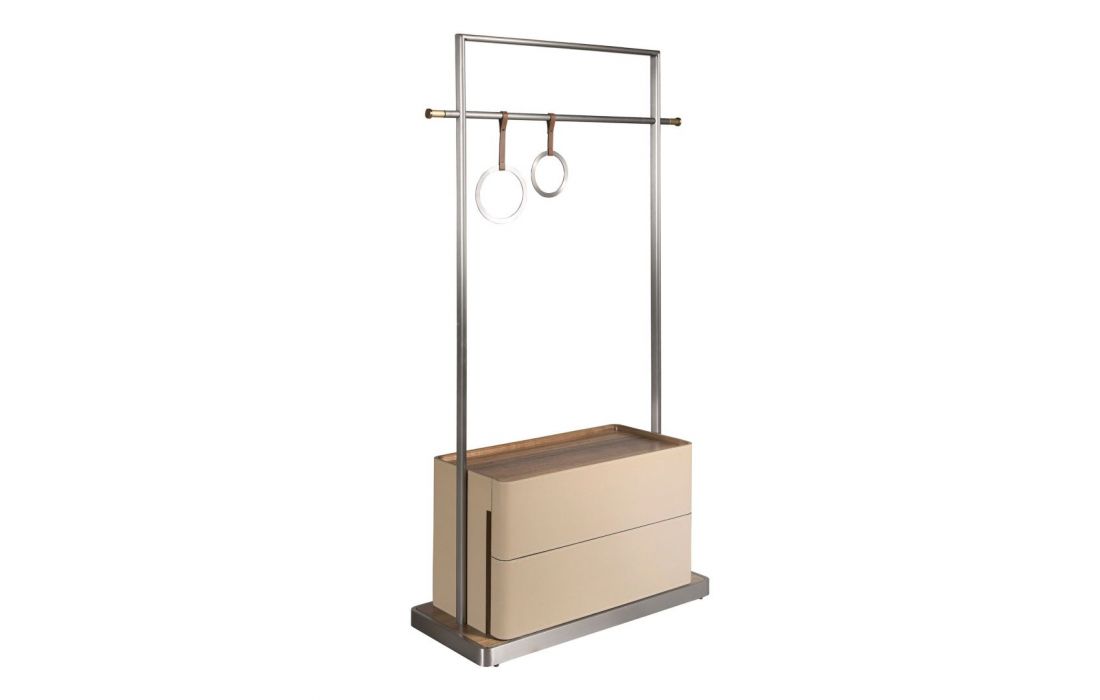 Cabide moderno em folheado de nogueira natural, combinado com elegantes estofos em pele de bovino, base e a estrutura em aço inoxidável, bem como os detalhes em açoDestinatário :