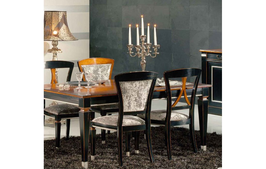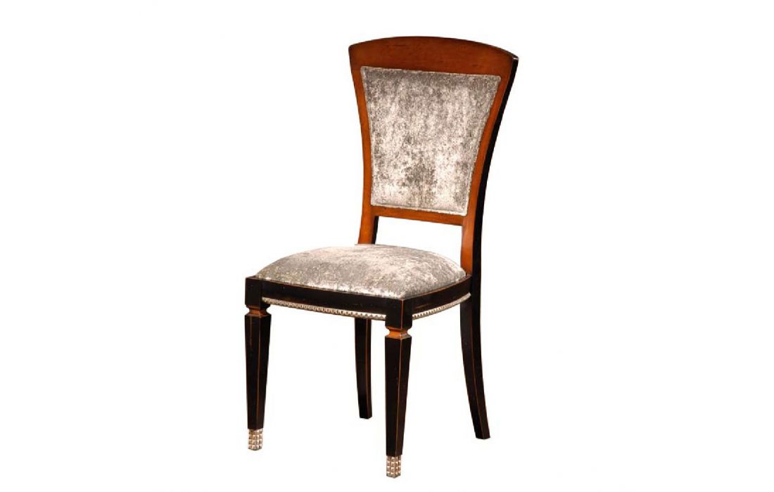 Cadeira com estrutura em madeira, assento e costa em tecido, design provençal e pormenor em folha de prata com possibilidade de vários acabamentos e revestimentos.
