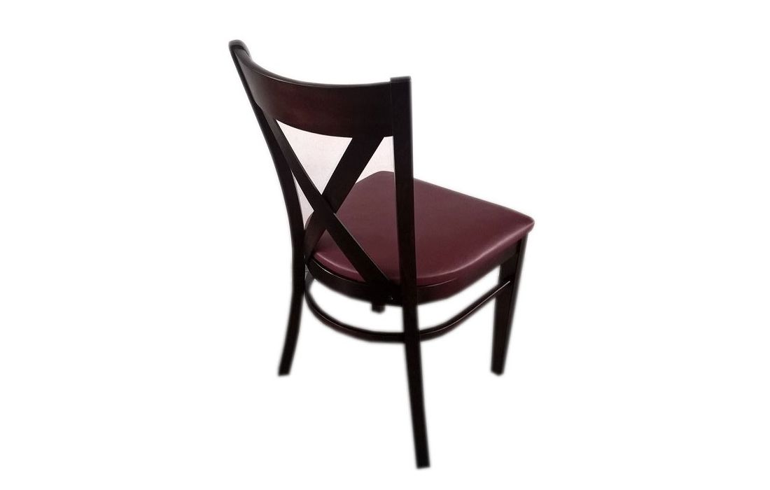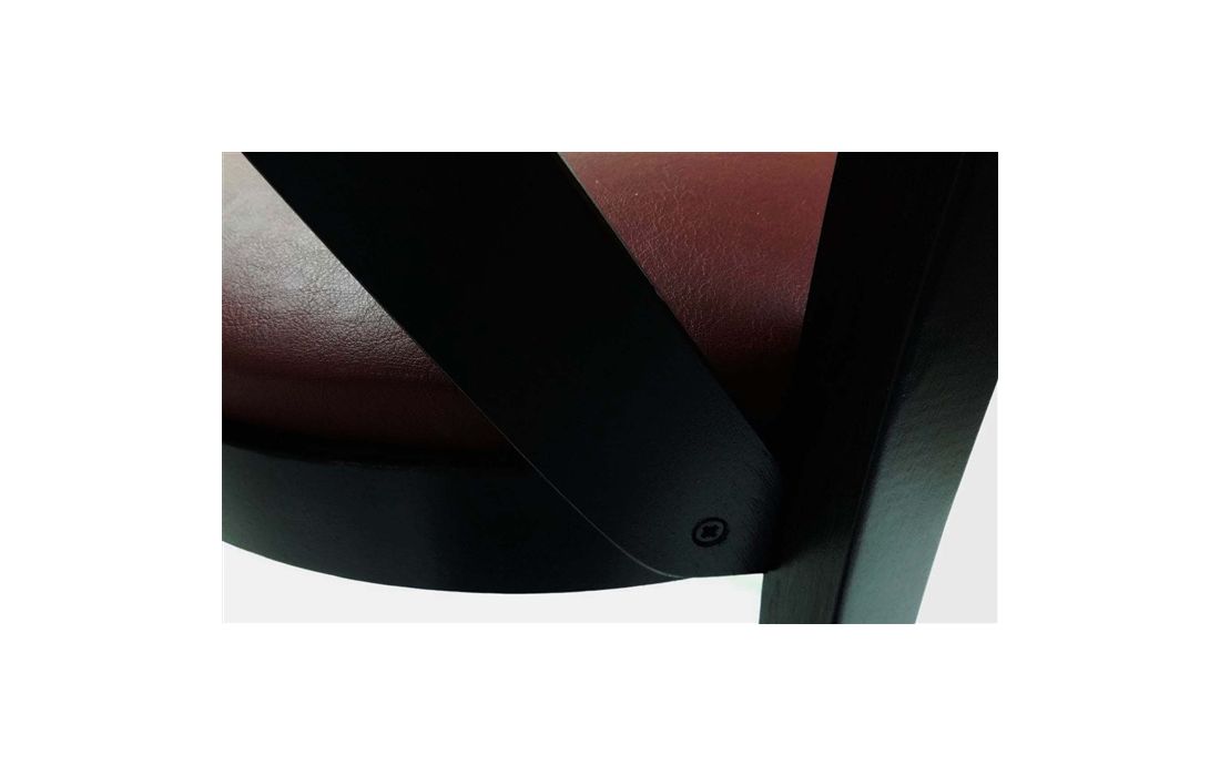 Cadeira com estrutura em madeira maciça de faia acabamento em cor wengué com assento em pele sintética ignífuga bordeaux.