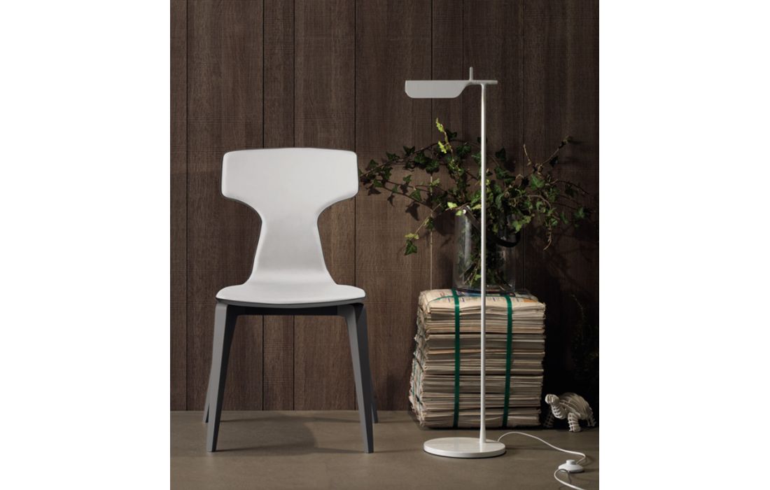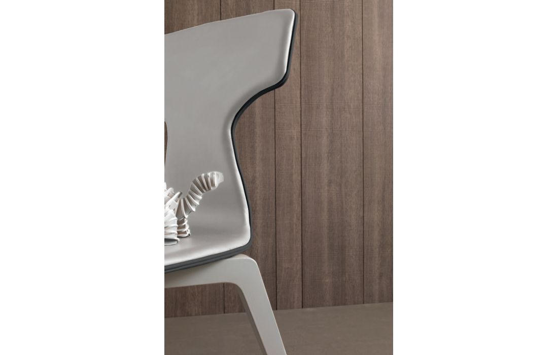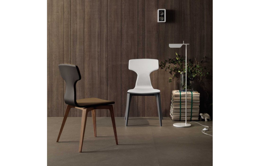 Cadeira com as pernas em madeira maçica de nogueira ou madeira de carvalho pintado. Assento e costa de madeira coberta com imitação pele ou pele verdadeira