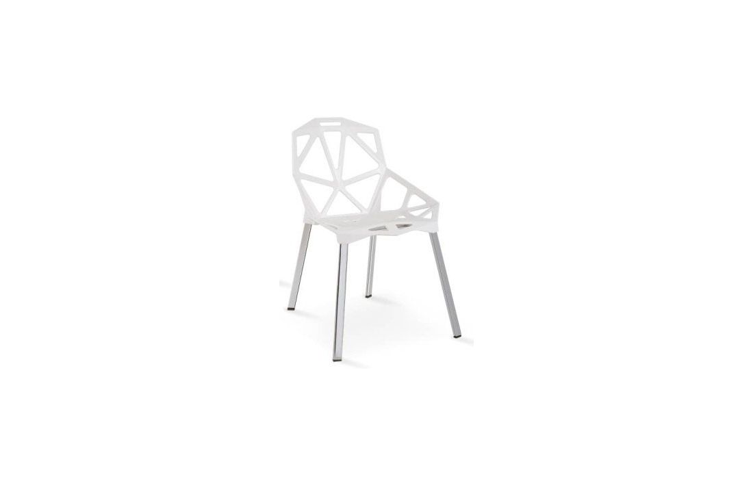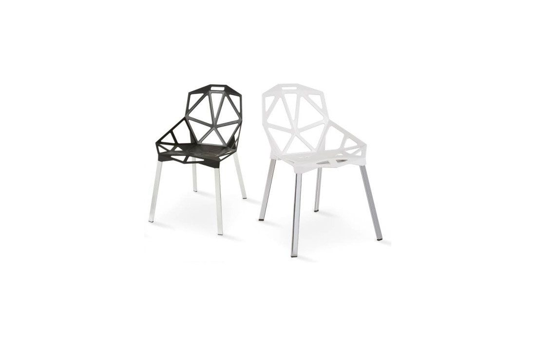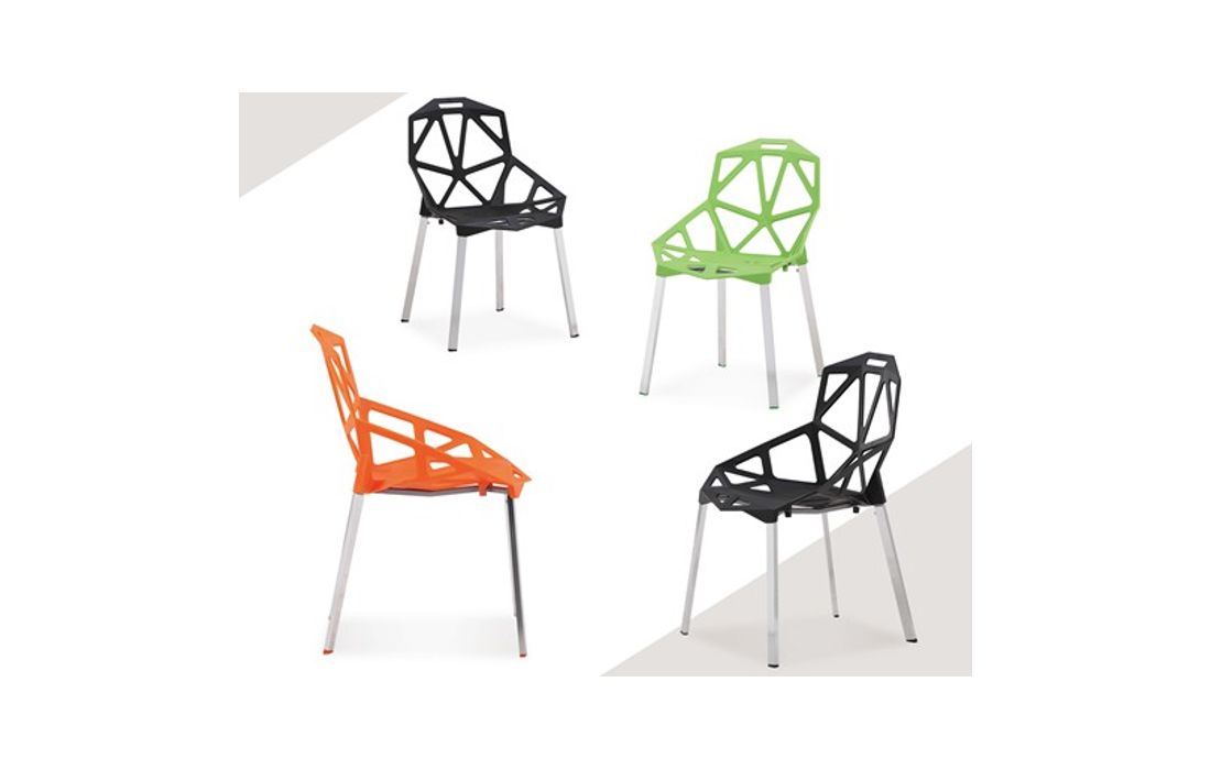 Cadeira com estrutura em policarbonato de cor branco, preto, verde e vermelho com pés em alumínio.