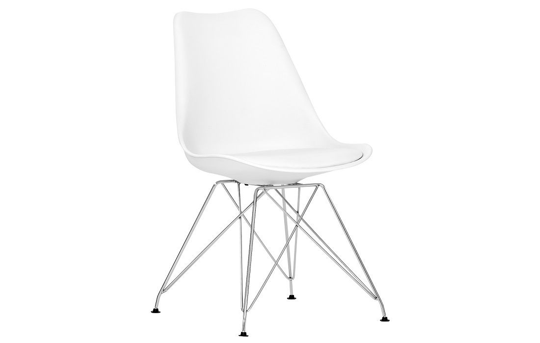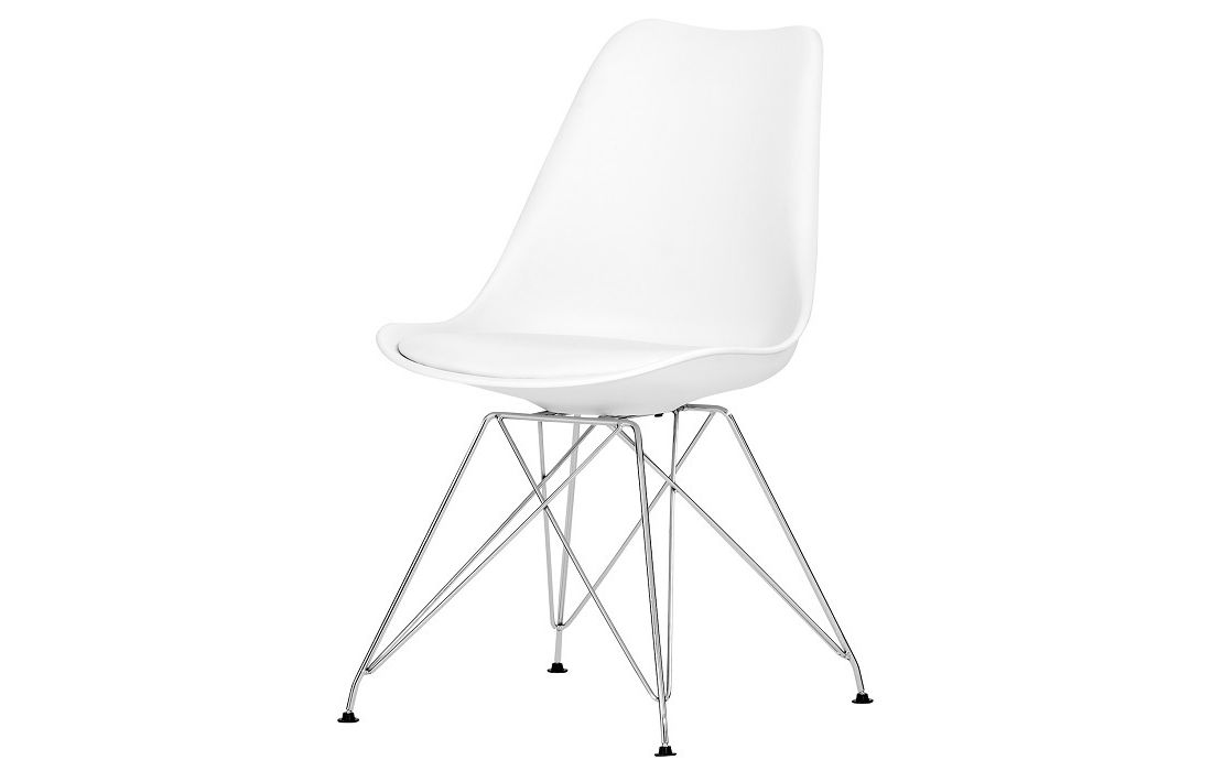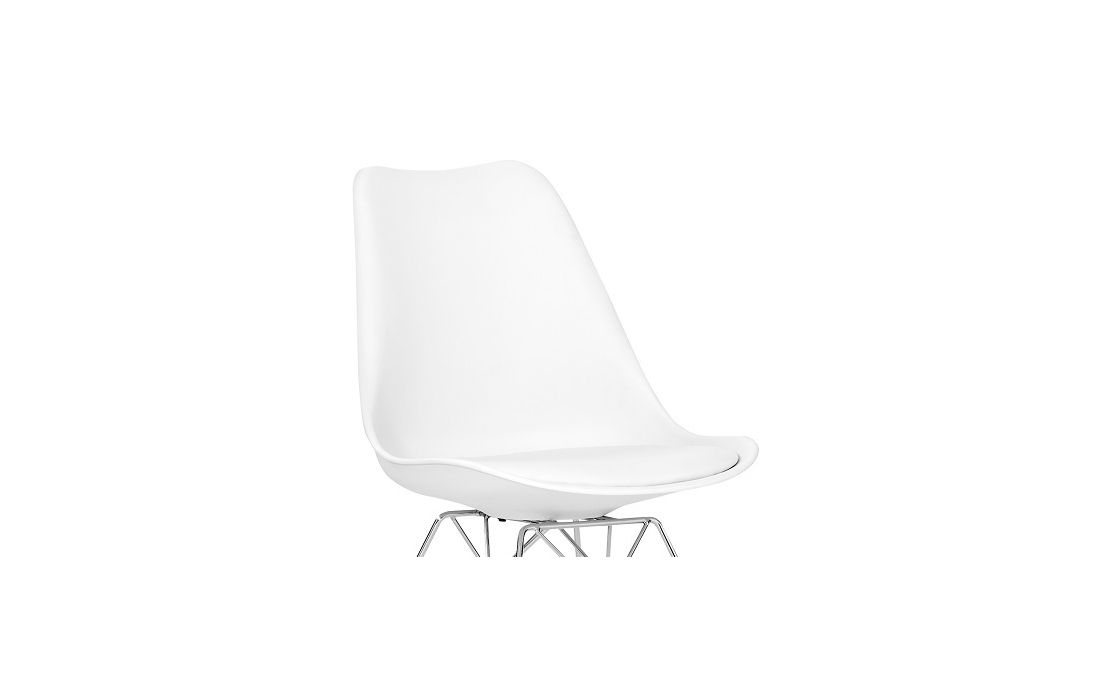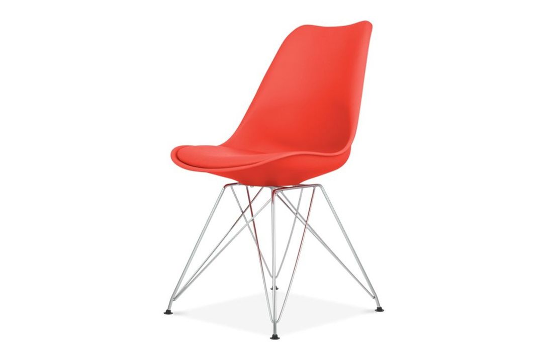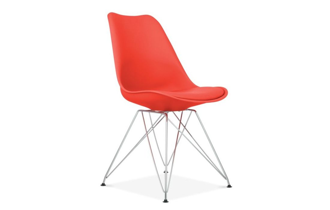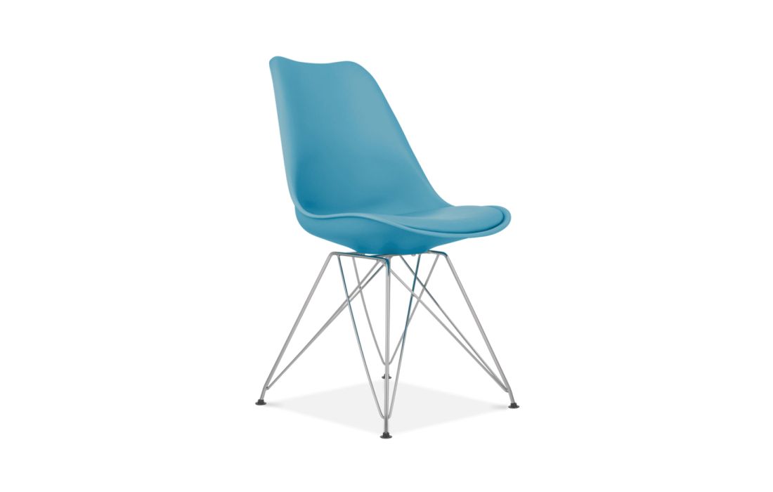 Cadeira com estrutura em metal cromado, assento em pele sintética e costa em polipropileno de cor azul, branco, preto, cinza, laranja ou vermelho.