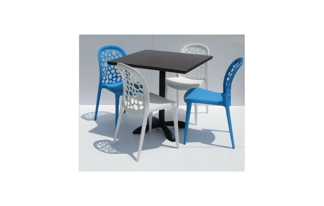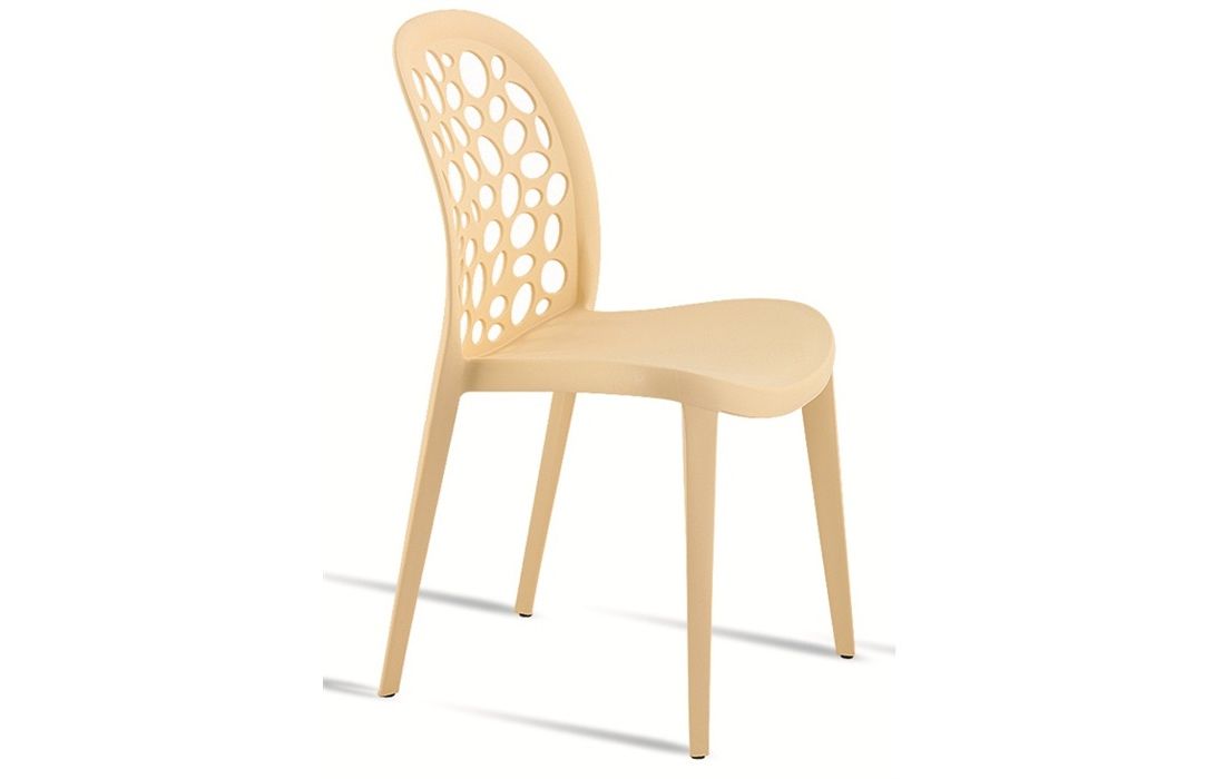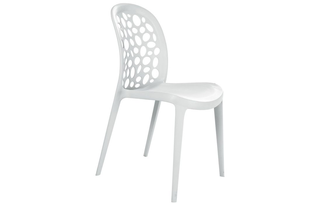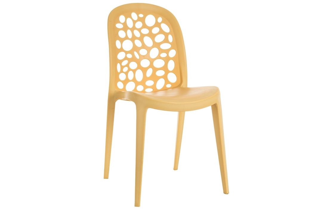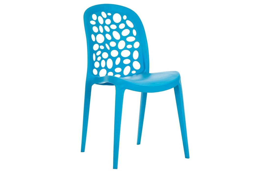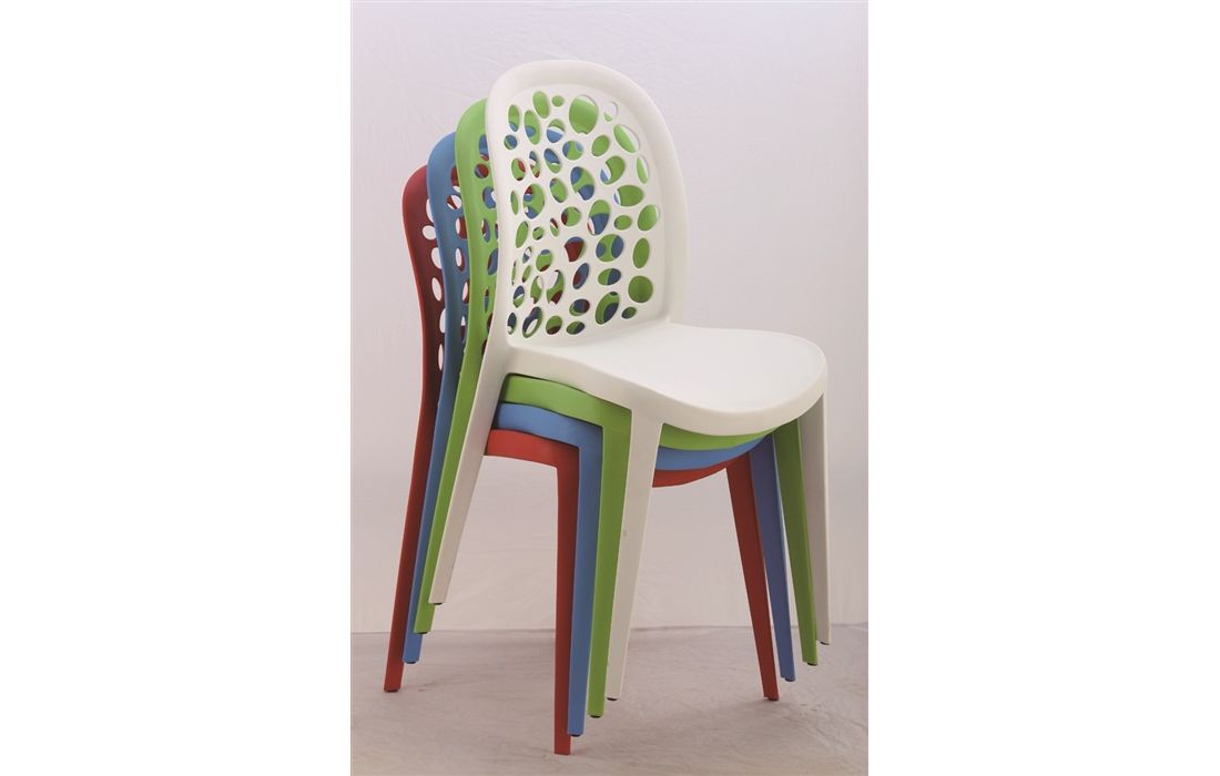 Cadeira com estrutura em polipropileno de cor azul, amarelo light ou branco.